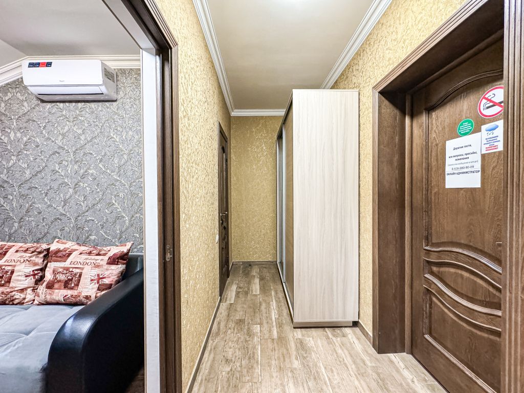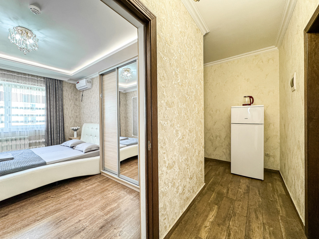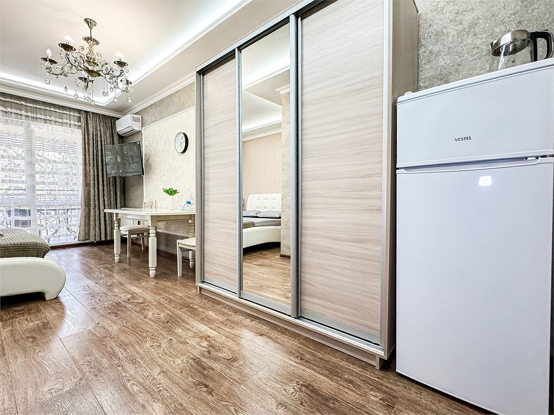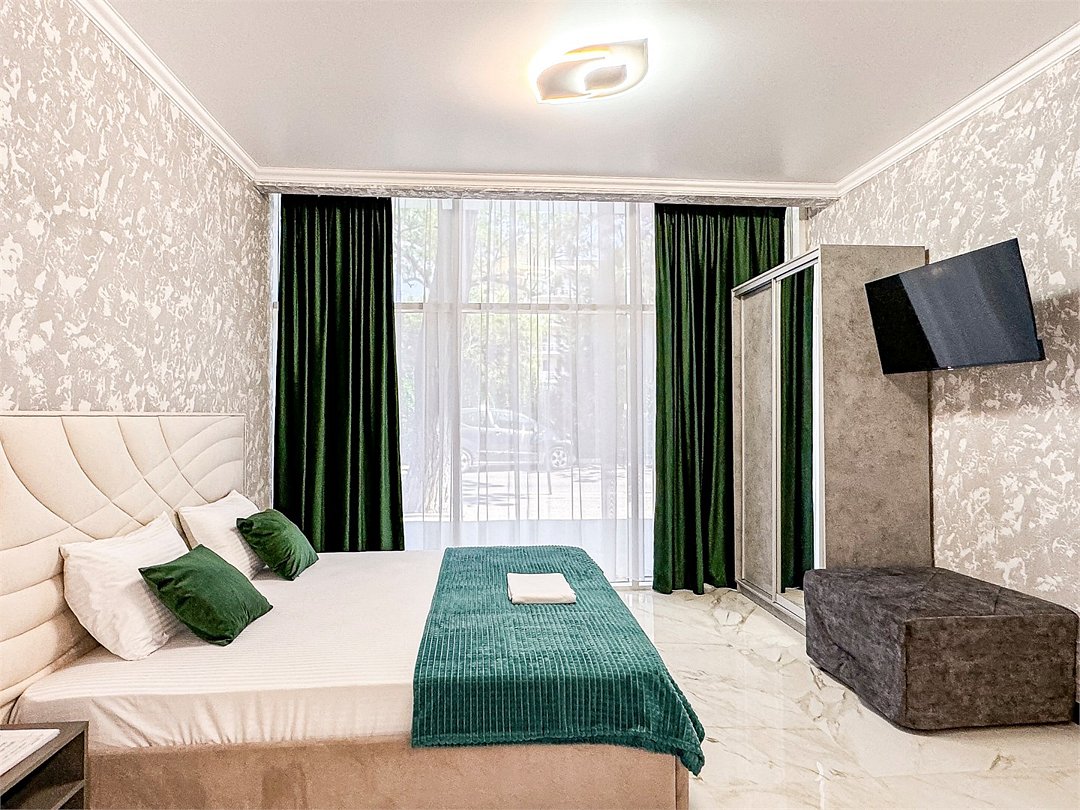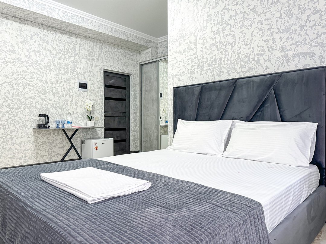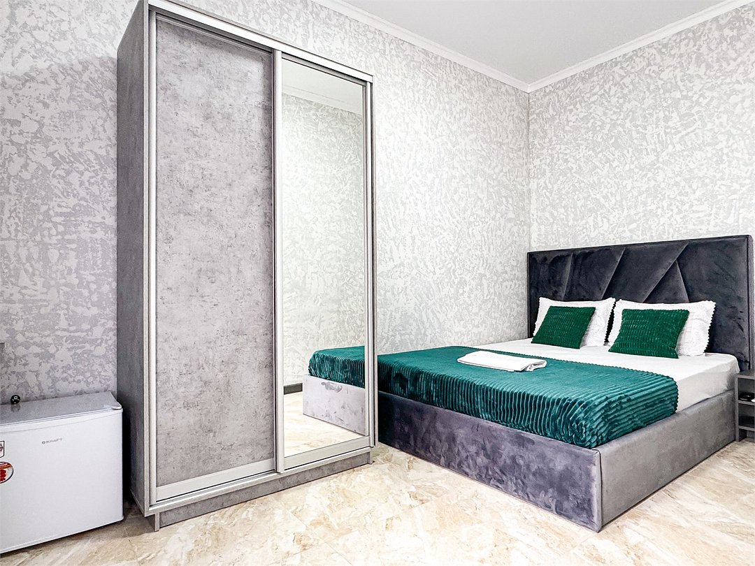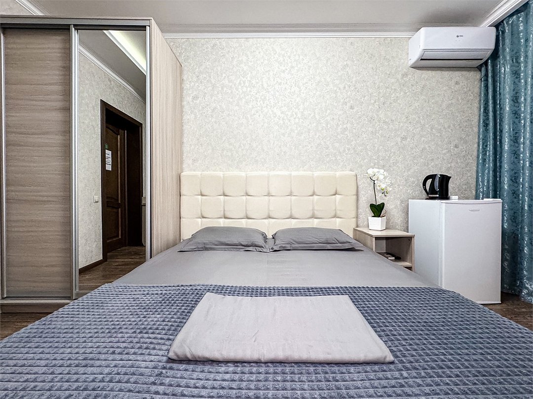 Однокомнатный для размещения семьи 2 взрослых и ребенок или 3 взрослых (+1 ребенок может ночевать с родителями). Спальные места: двуспальная кровать + дополнительное односпальное место (пуф-трансформер - раскладывается 76*200, нагрузка до 120 кг). В номере кондиционер, шкаф, холодильник, чайник, небольшой набор посуды, фен, телевизор.