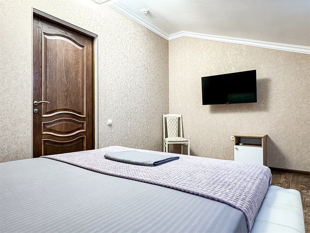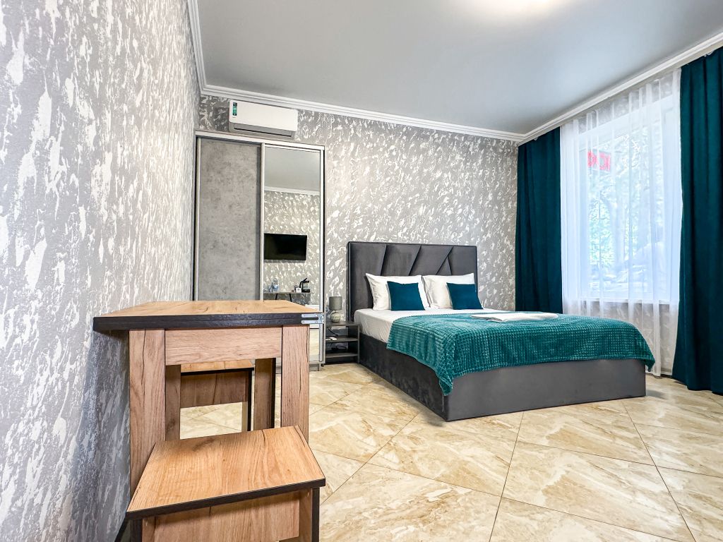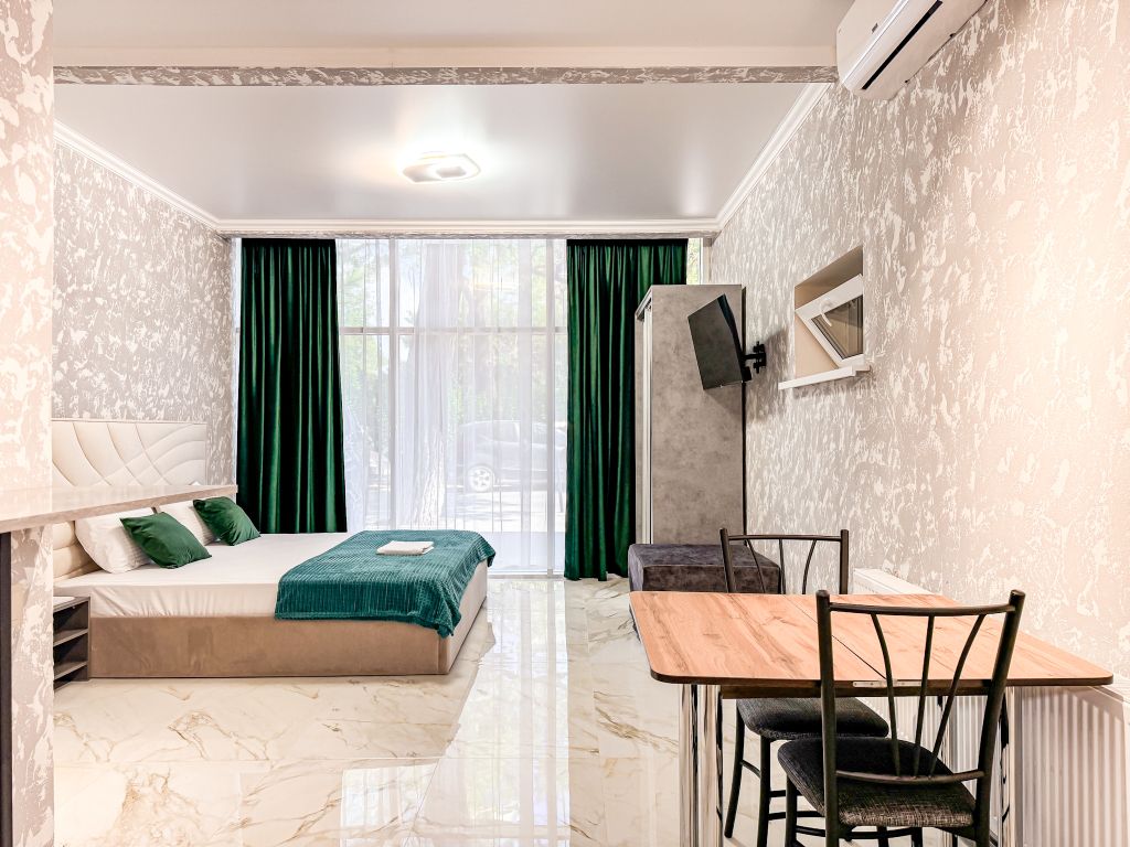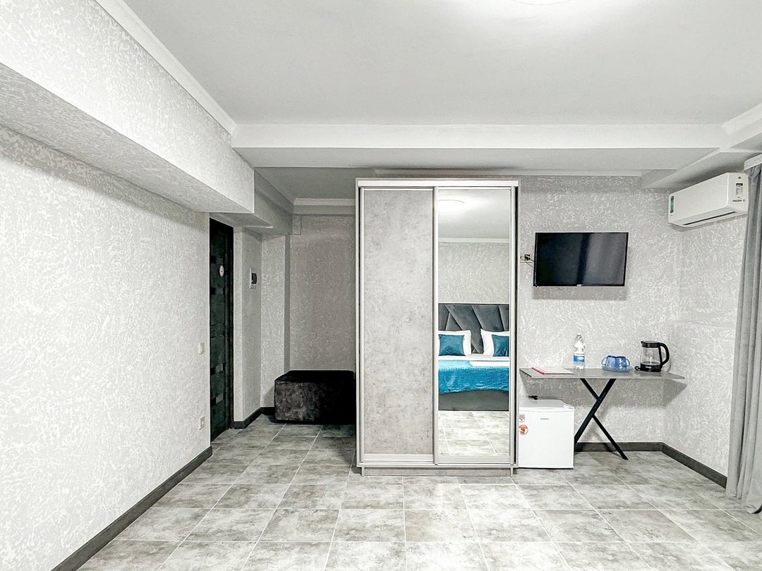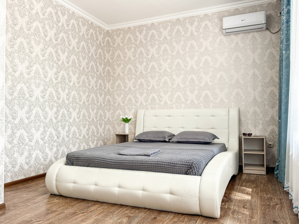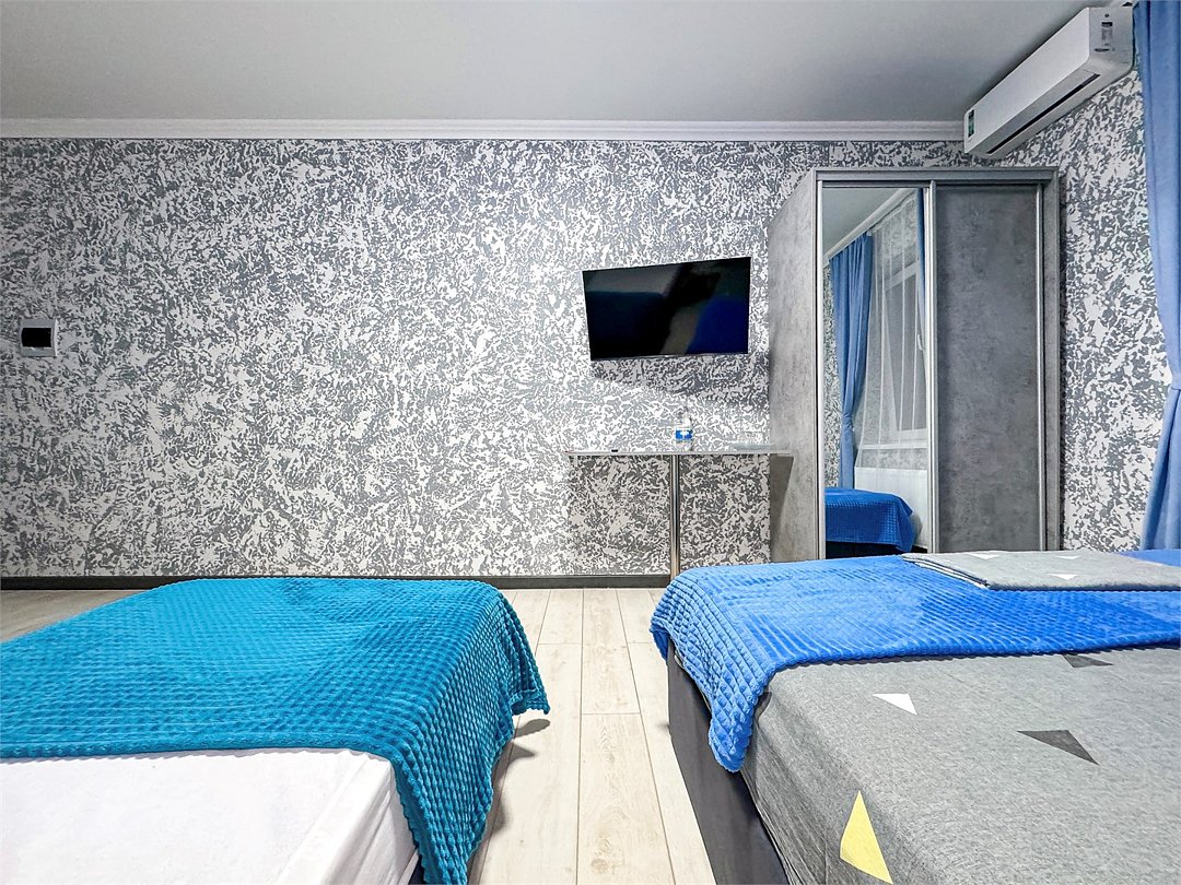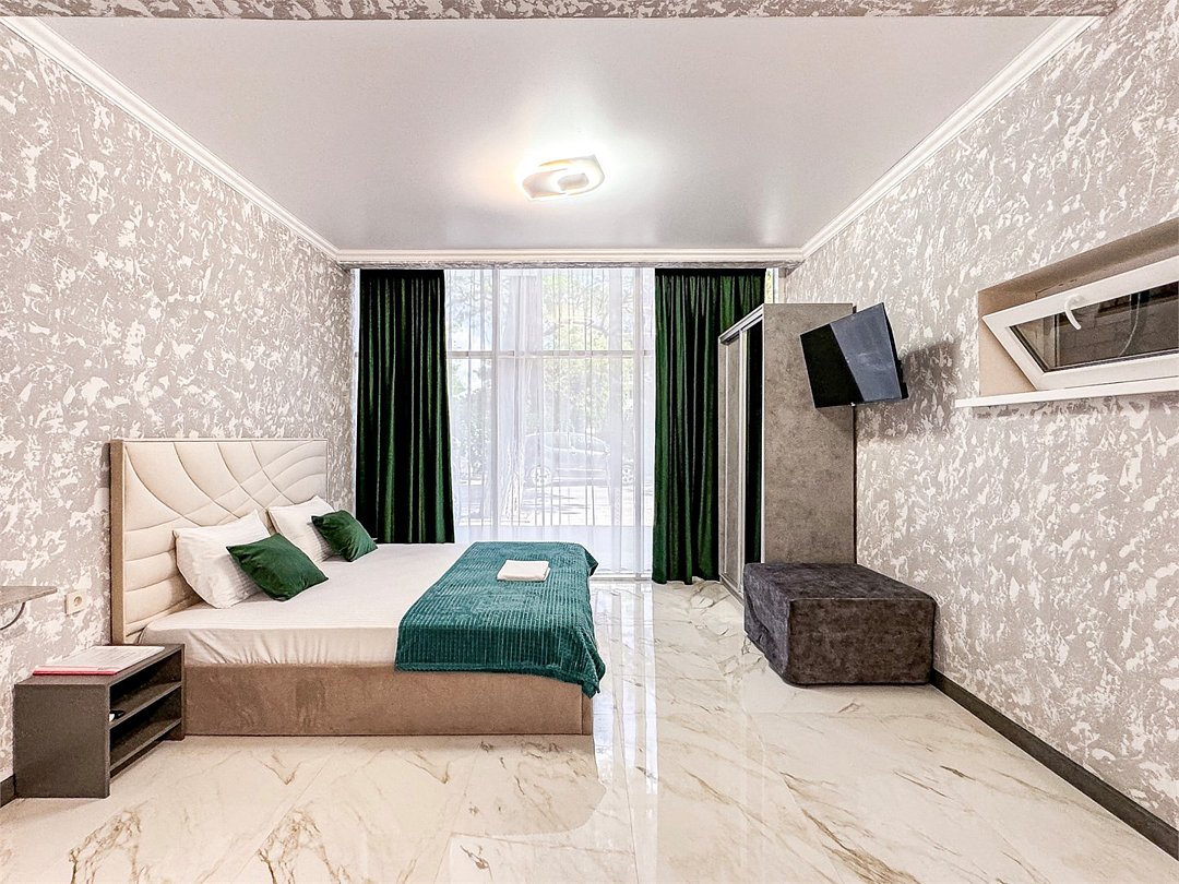 Однокомнатный для размещения семьи 2 взрослых и ребенок или 3 взрослых (+1 ребенок может ночевать с родителями). Спальные места: двуспальная кровать + дополнительное односпальное место (пуф-трансформер - раскладывается 76*200, нагрузка до 120 кг). В номере кондиционер, шкаф, холодильник, чайник, небольшой набор посуды, фен, телевизор.