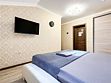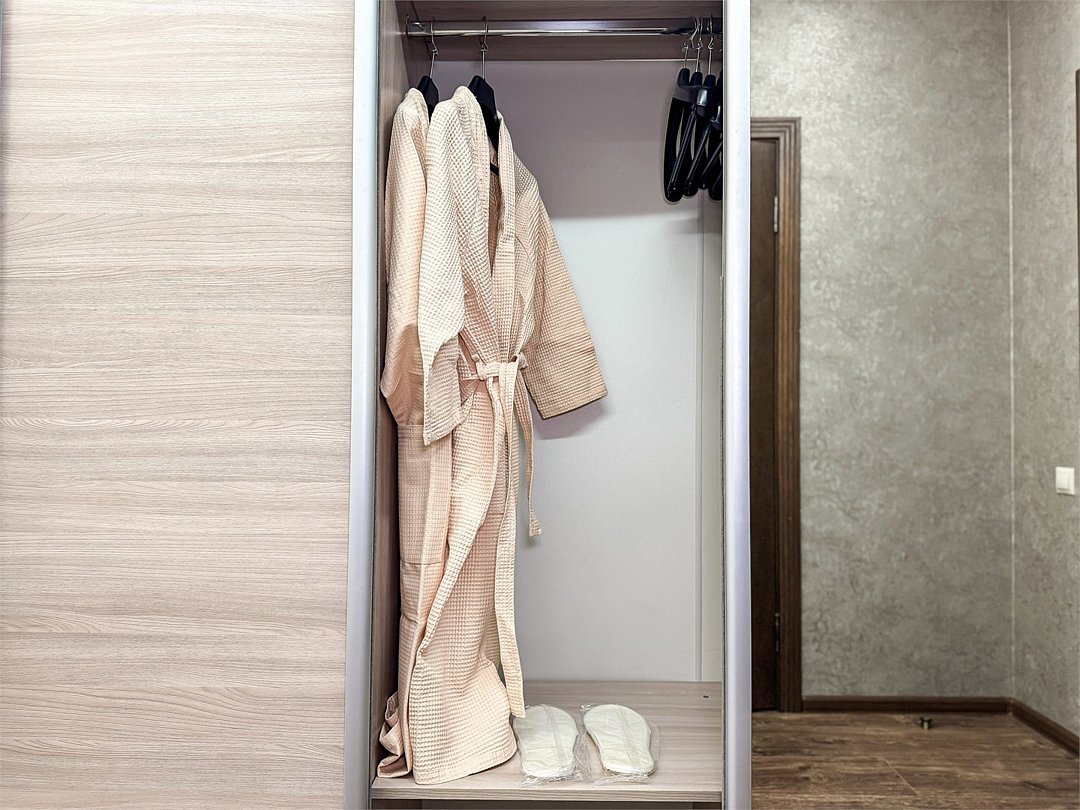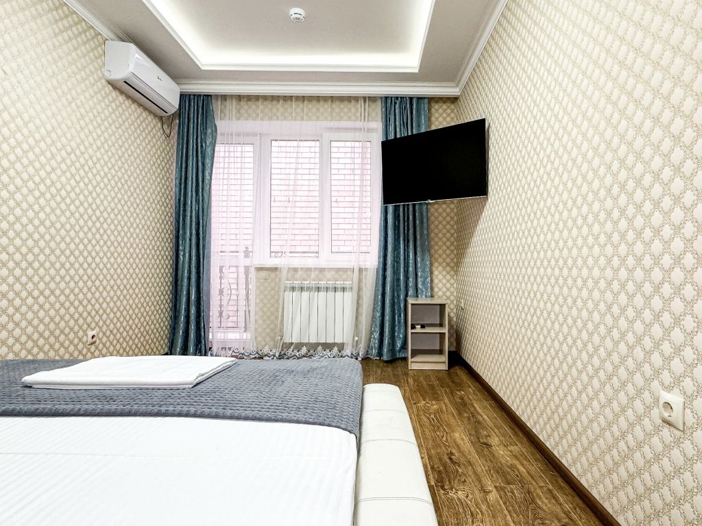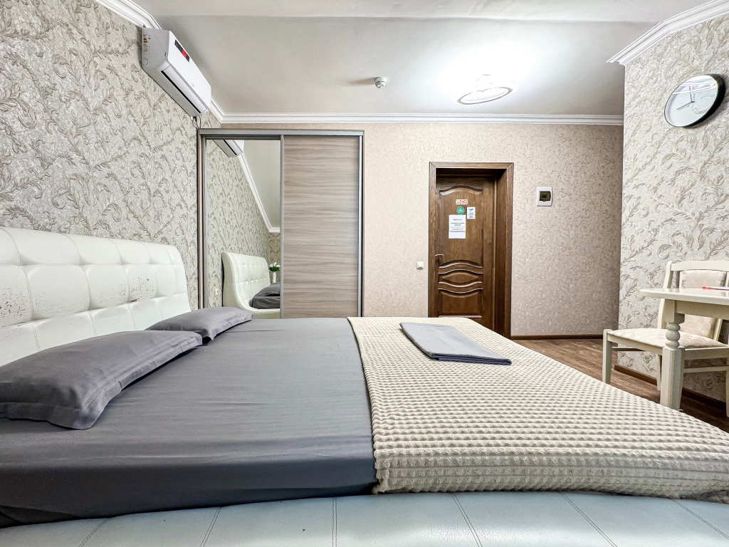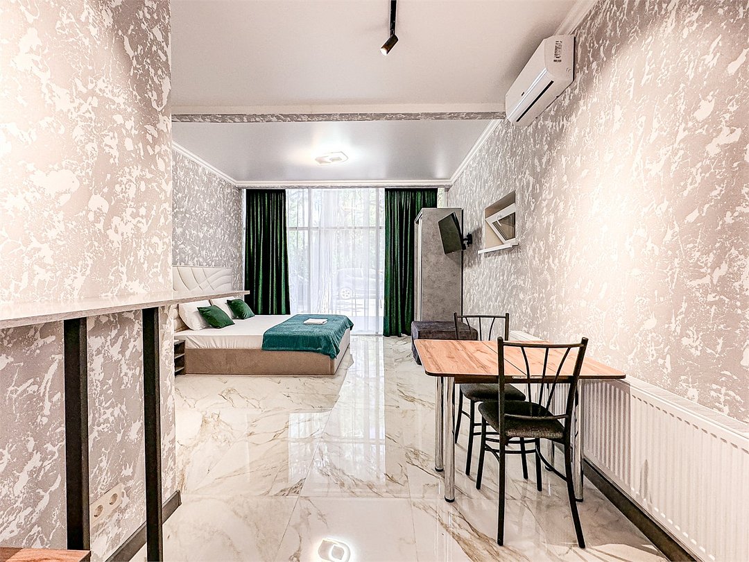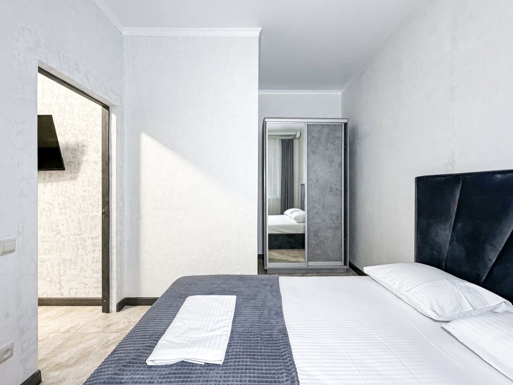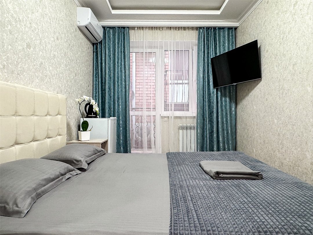 Однокомнатный для размещения семьи 2 взрослых и ребенок или 3 взрослых (+1 ребенок может ночевать с родителями). Спальные места: двуспальная кровать + дополнительное односпальное место (пуф-трансформер - раскладывается 76*200, нагрузка до 120 кг). В номере кондиционер, шкаф, холодильник, чайник, небольшой набор посуды, фен, телевизор.