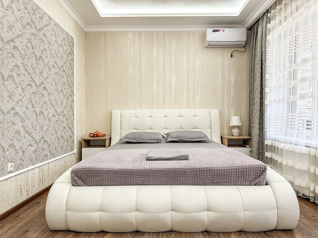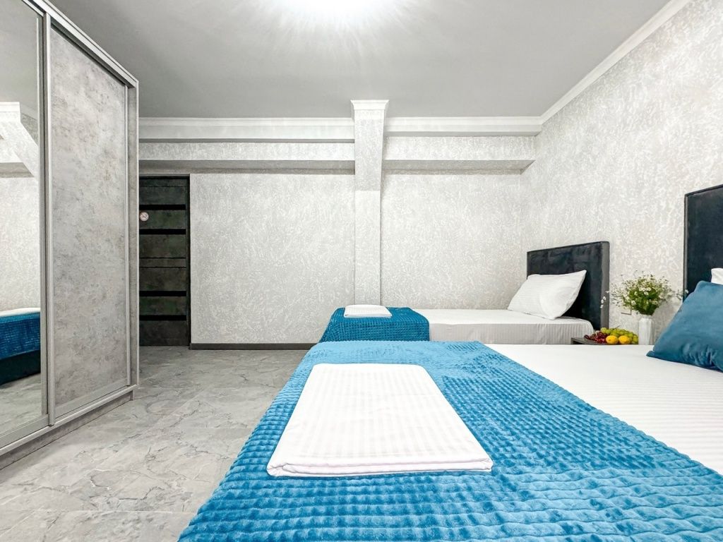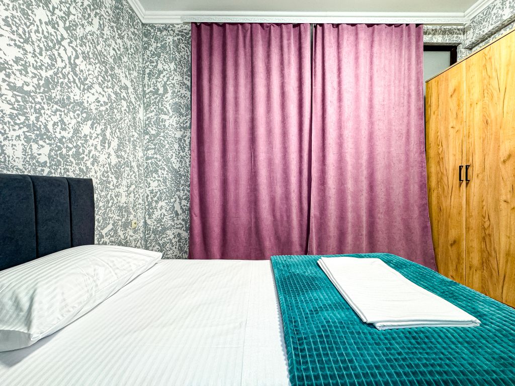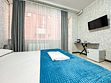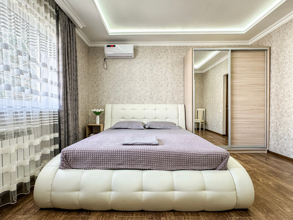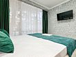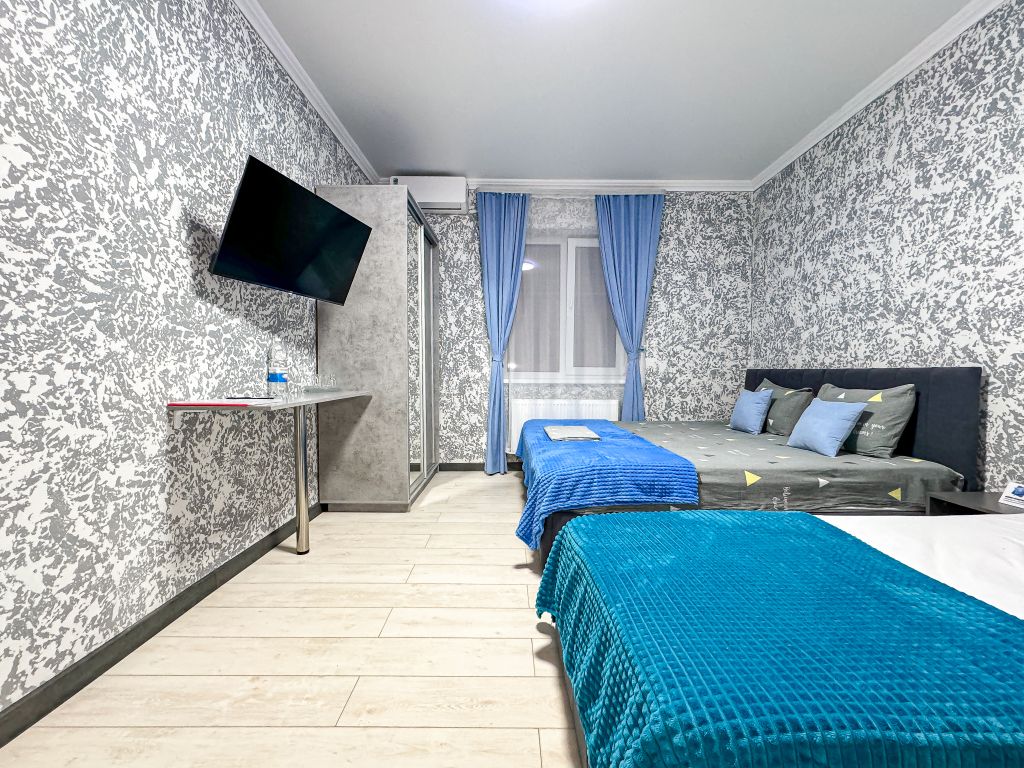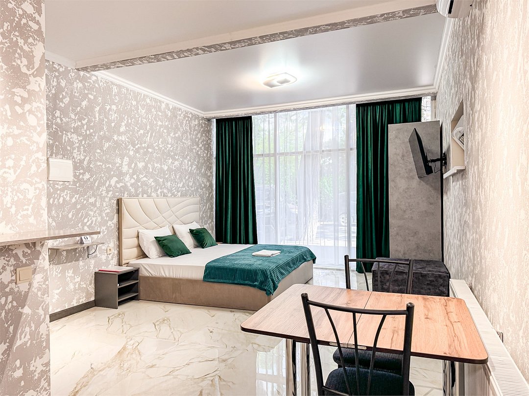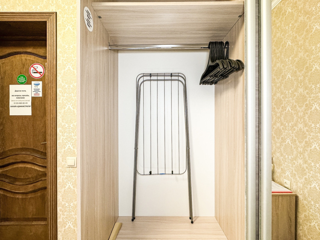 Однокомнатный для размещения семьи 2 взрослых и ребенок или 3 взрослых (+1 ребенок может ночевать с родителями). Спальные места: двуспальная кровать + дополнительное односпальное место (пуф-трансформер - раскладывается 76*200, нагрузка до 120 кг). В номере кондиционер, шкаф, холодильник, чайник, небольшой набор посуды, фен, телевизор.