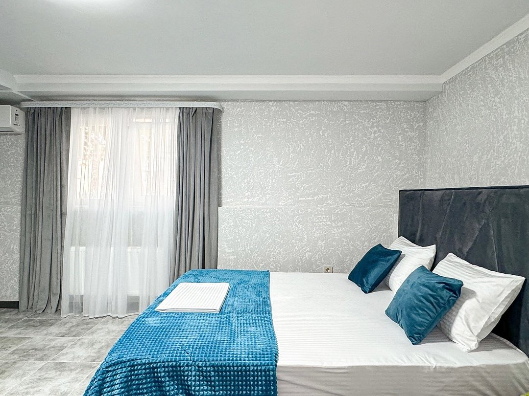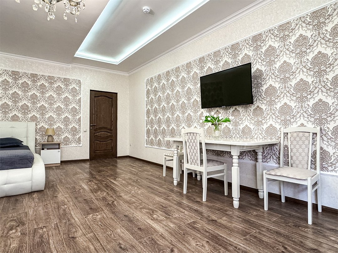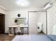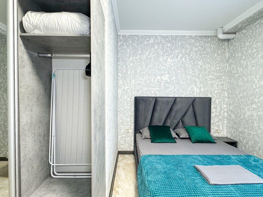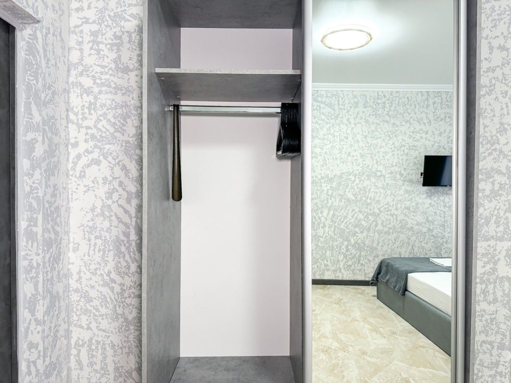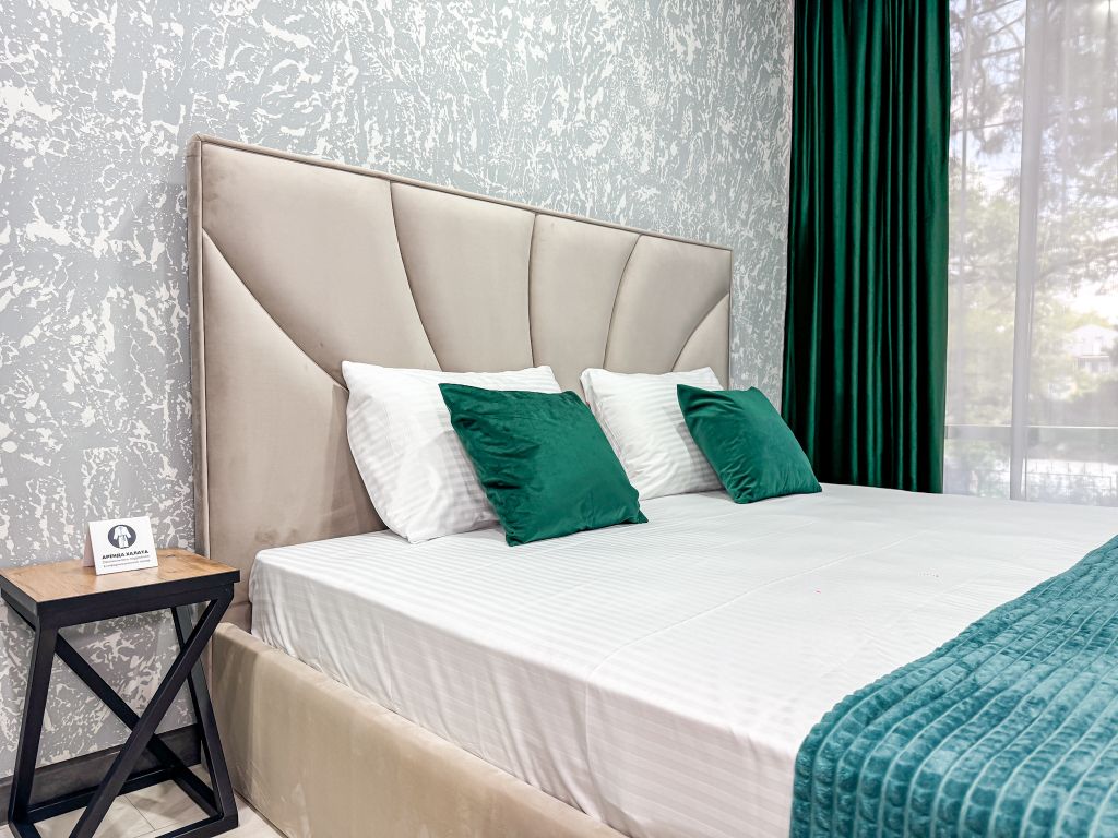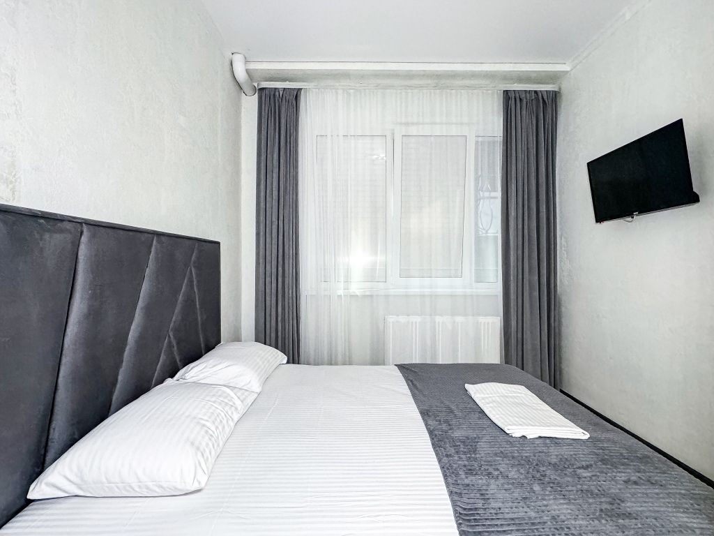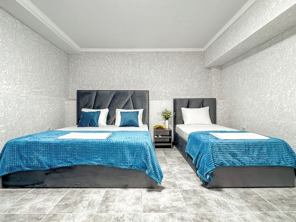 Однокомнатный для размещения семьи 2 взрослых и ребенок или 3 взрослых (+1 ребенок может ночевать с родителями). Спальные места: двуспальная кровать + дополнительное односпальное место (пуф-трансформер - раскладывается 76*200, нагрузка до 120 кг). В номере кондиционер, шкаф, холодильник, чайник, небольшой набор посуды, фен, телевизор.
