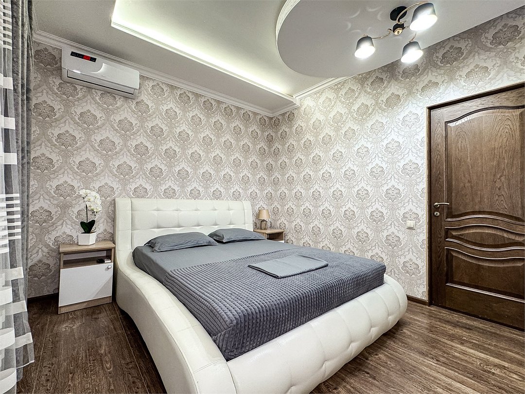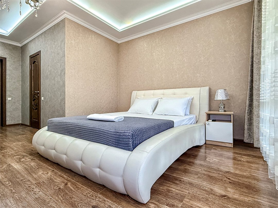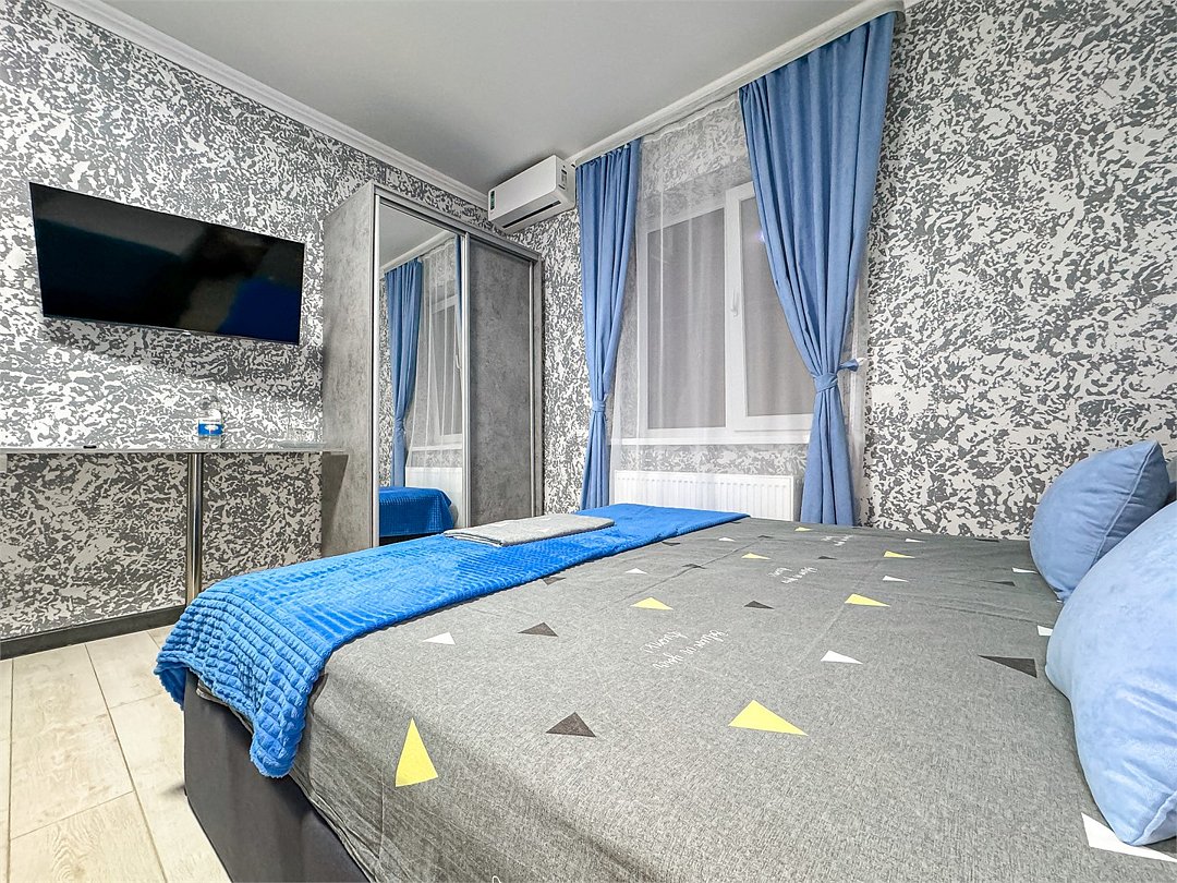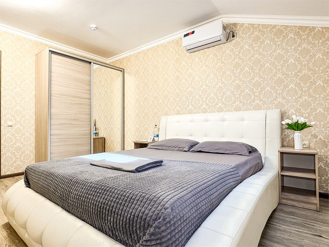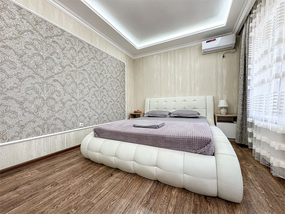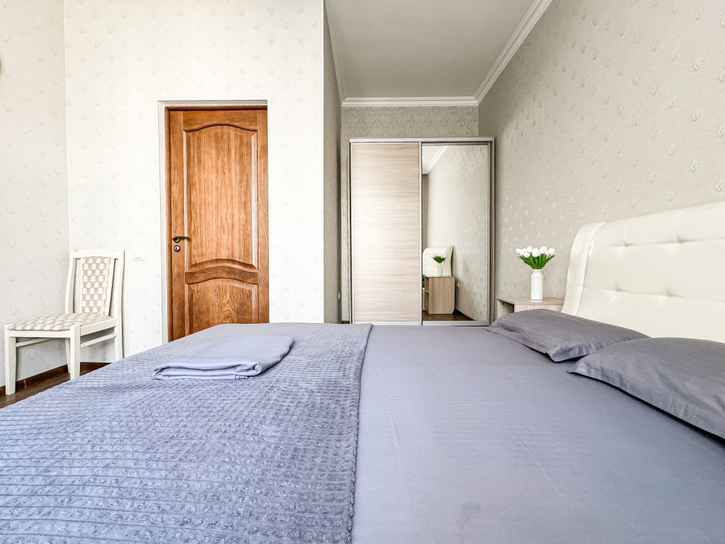 В одной спальне двуспальная кровать, во второй – раскладывающийся диван. Душ, туалет, кондиционер, шкаф, холодильник, телевизоры, чайник с чашками, тапочки, фен, банные полотенца – все удобства для комфортного проживания. Вместимость 3-4 гостя.