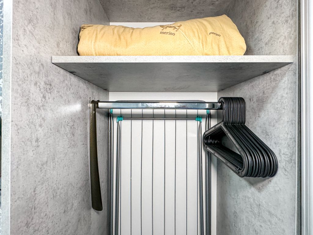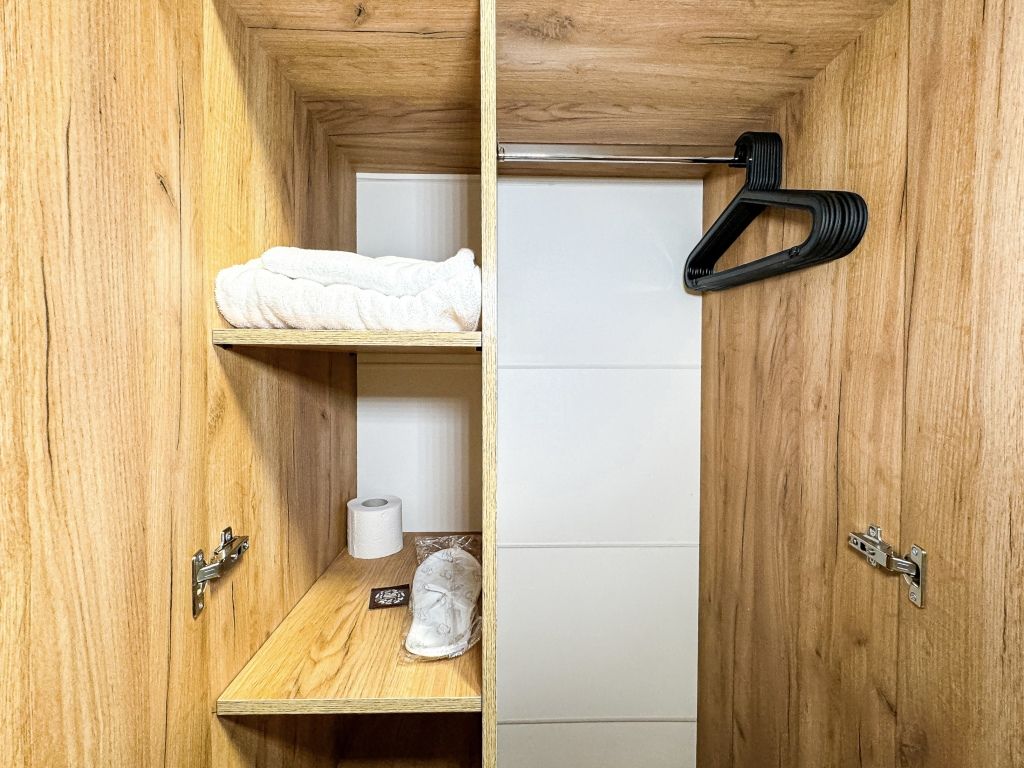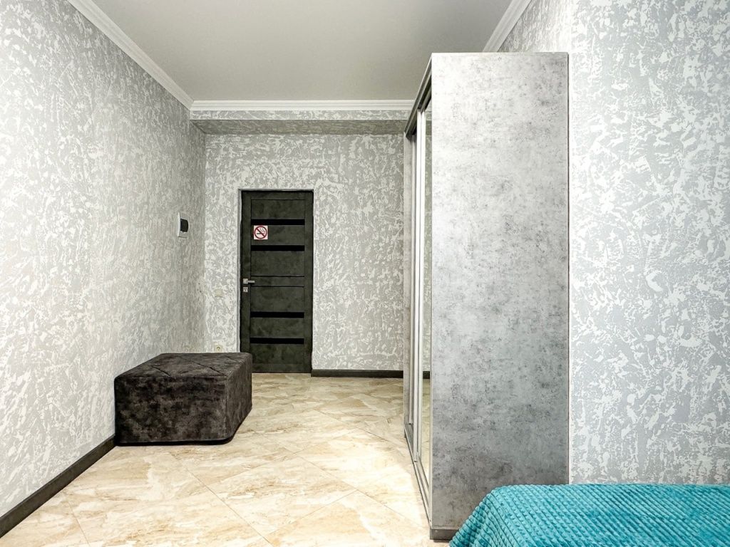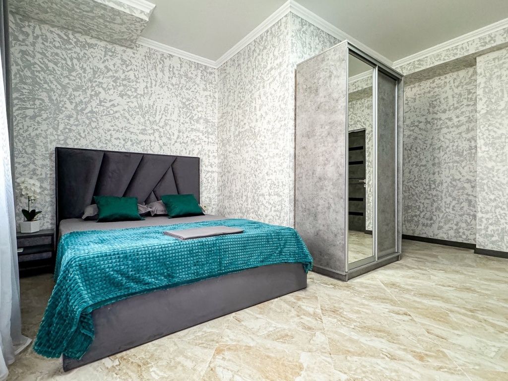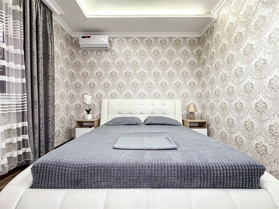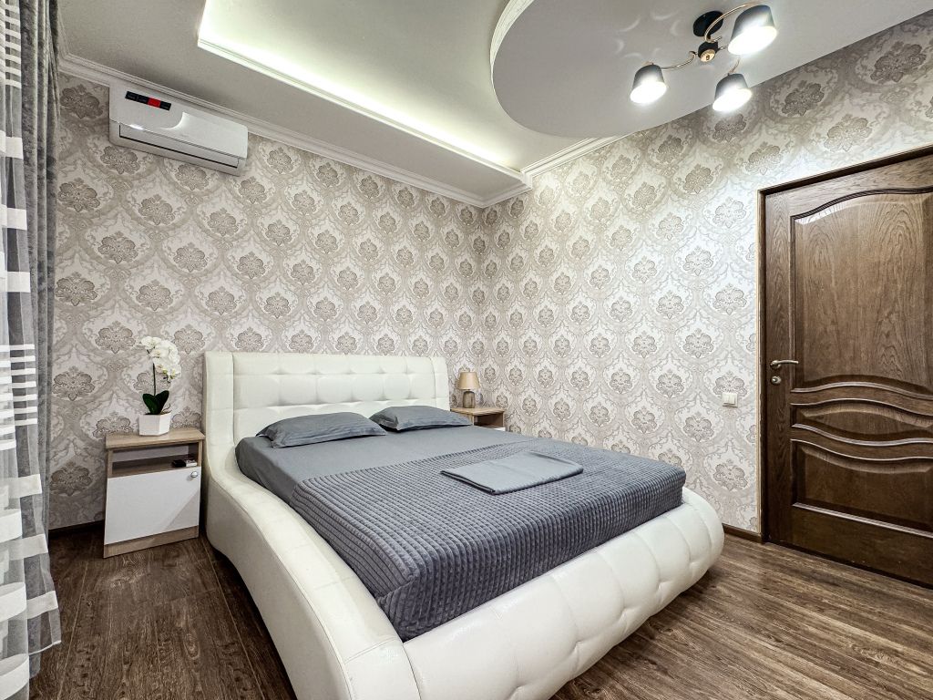 В одной спальне двуспальная кровать, во второй – раскладывающийся диван. Душ, туалет, кондиционер, шкаф, холодильник, телевизоры, чайник с чашками, тапочки, фен, банные полотенца – все удобства для комфортного проживания. Вместимость 3-4 гостя.