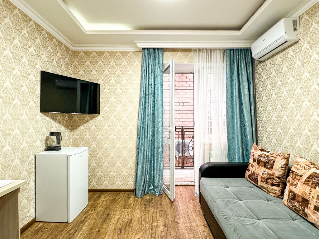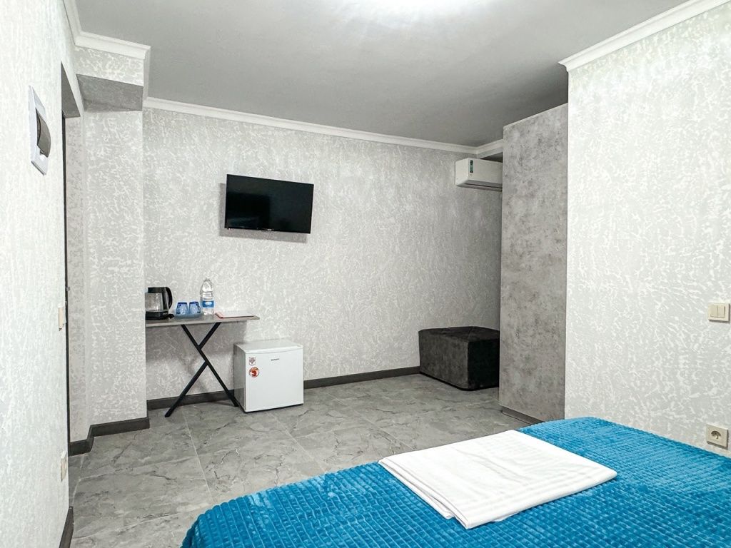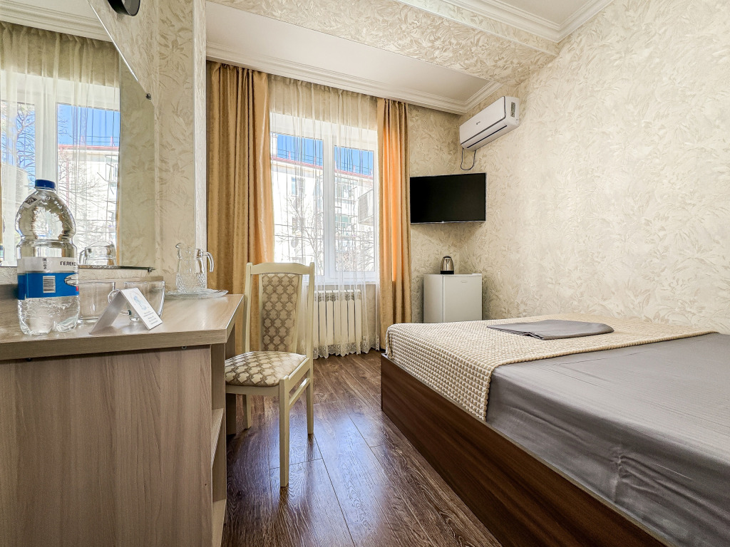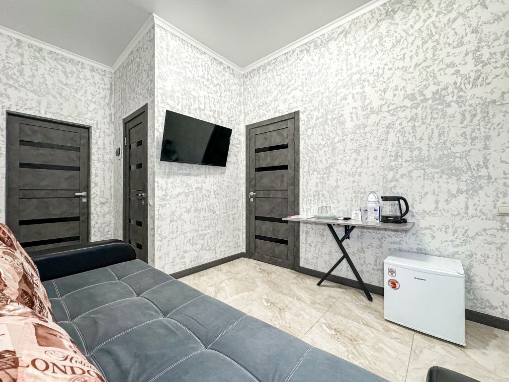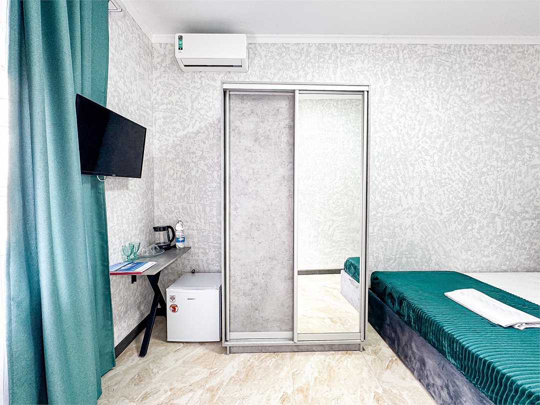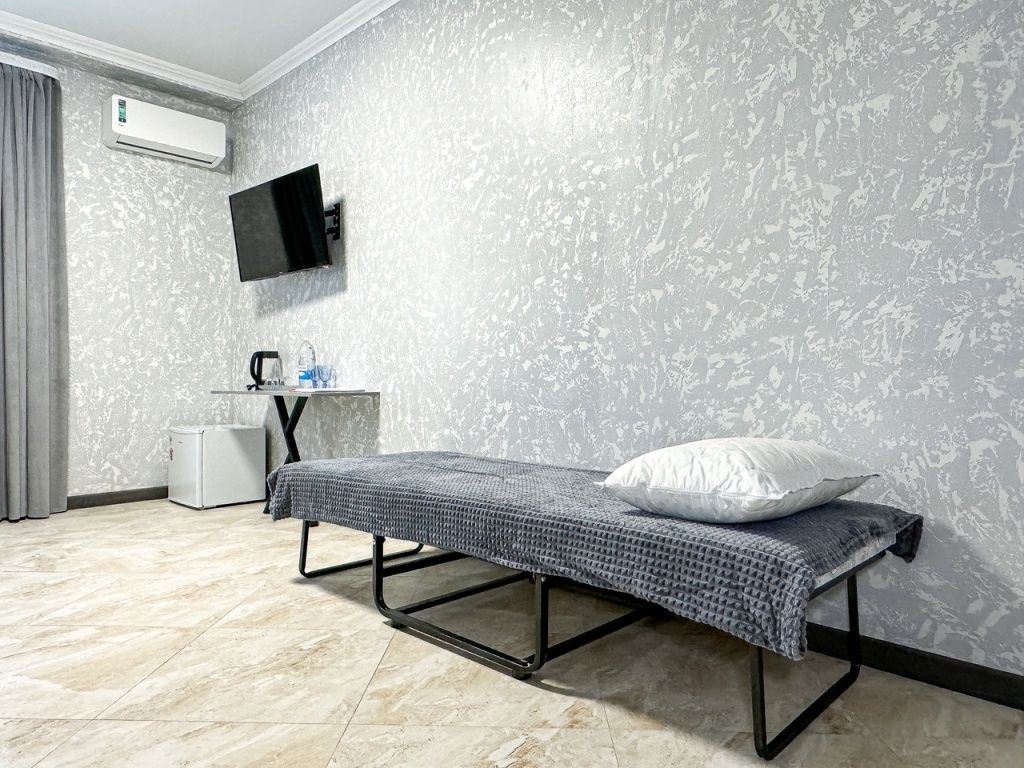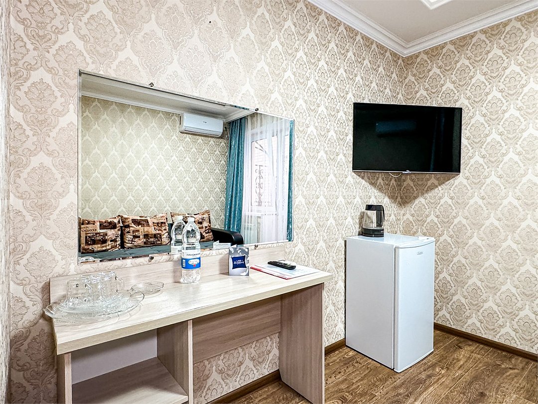 Однокомнатный номер, где можно разместить до 3 гостей. В номере двуспальная кровать + односпальная кровать. В номере, как и в остальных наших номерах обязательный набор удобств для комфортного отдыха: кондиционер, свой душ и туалет, телевизор, чайник с чашками и тарелочками, холодильник, шкаф, фен, тапочки. Особенность этого номера - из окна нет вида. Вид из окна либо в холл гостевого дома, либо на стену соседнего здания Таких номеров у нас 3. Построены июнь 2024. Все номера этой категории на 1 этажеУслуги и удобства
