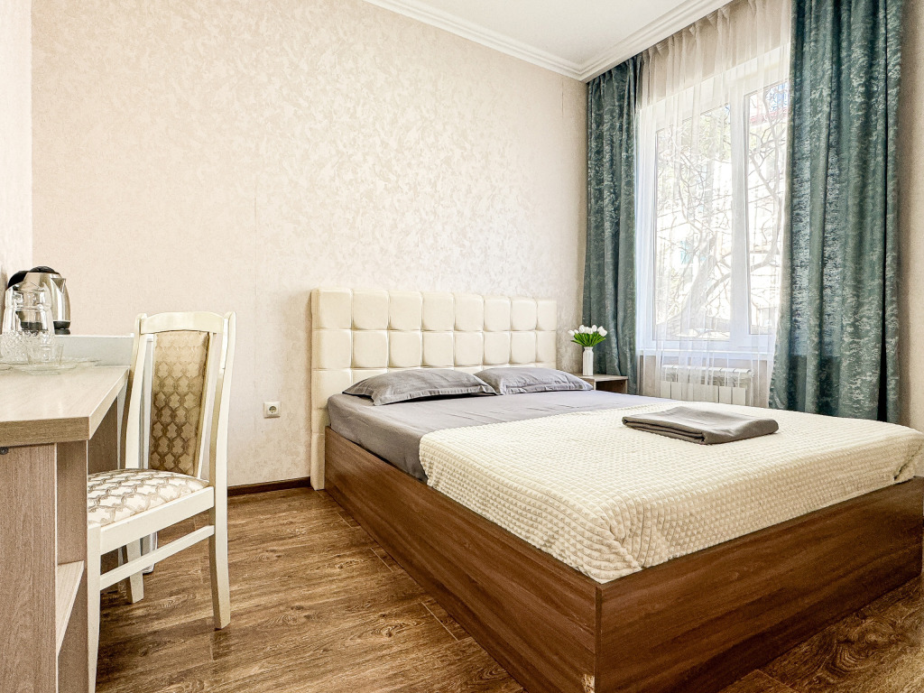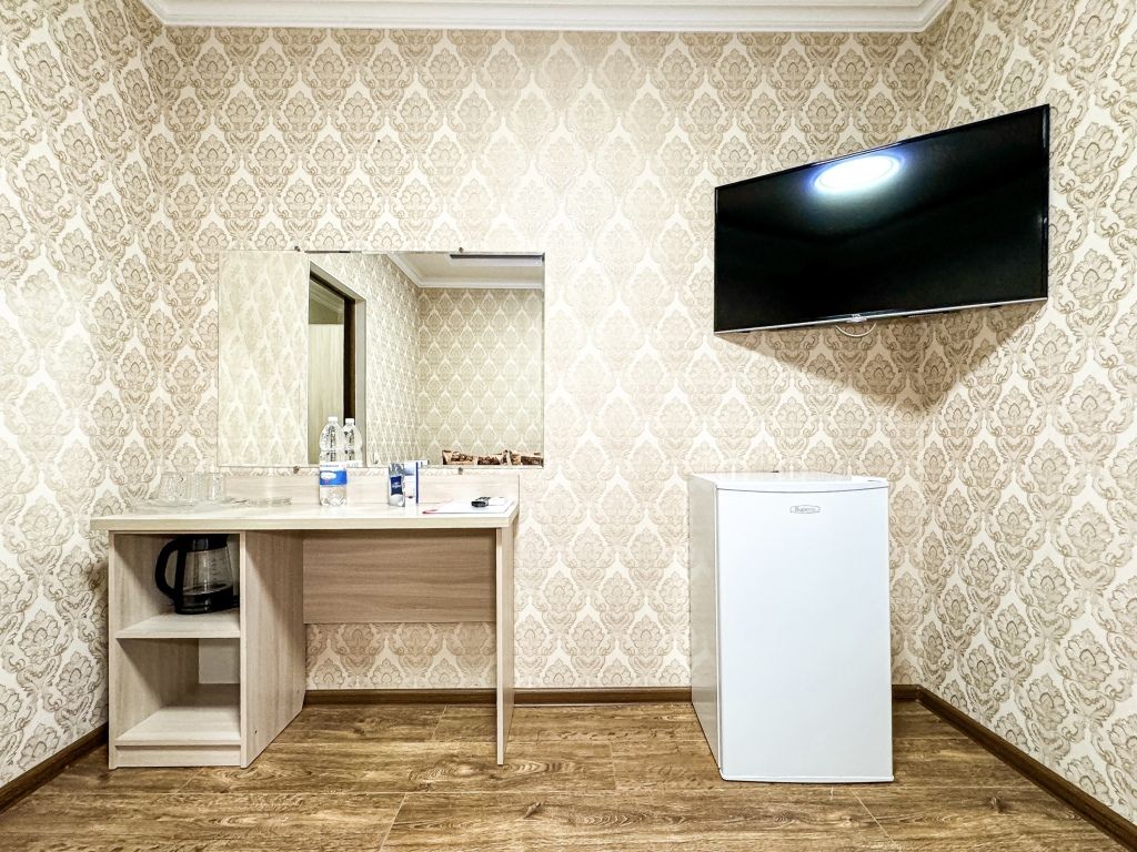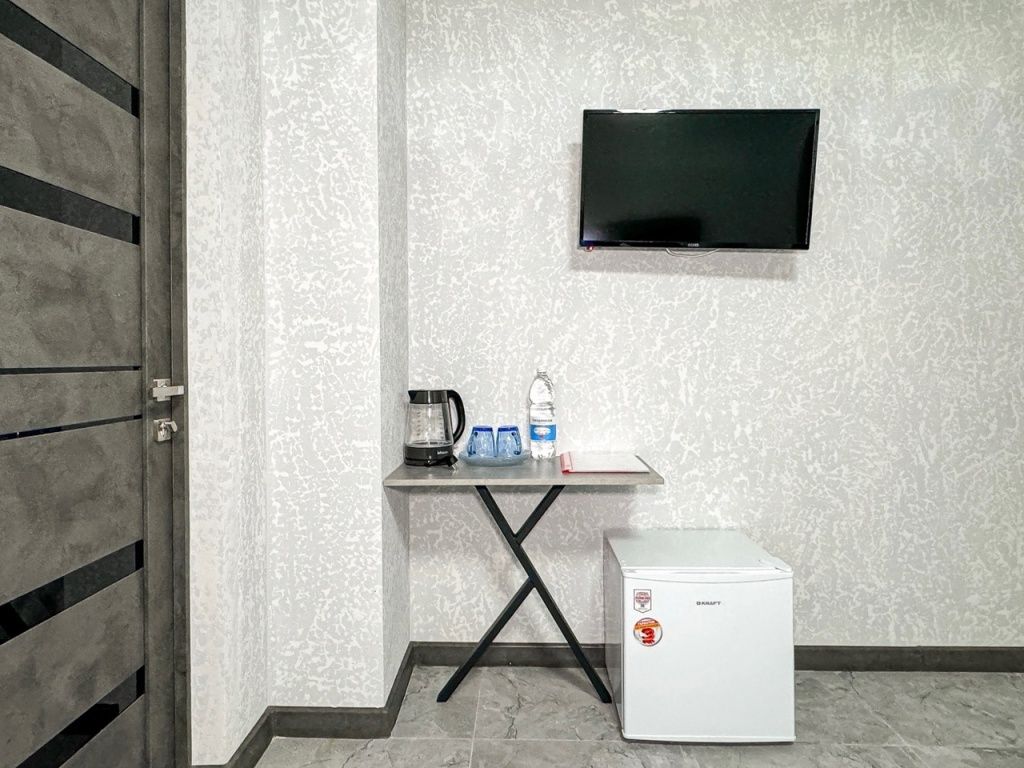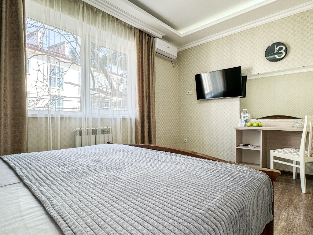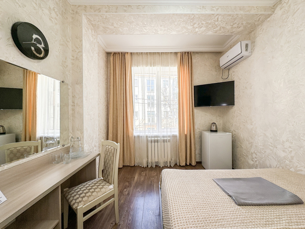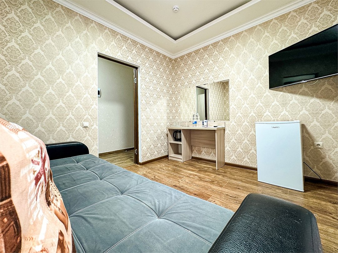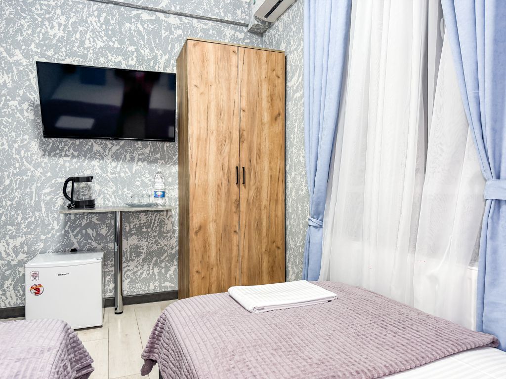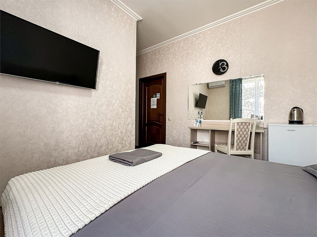 Однокомнатный номер, где можно разместить до 3 гостей. В номере двуспальная кровать + односпальная кровать. В номере, как и в остальных наших номерах обязательный набор удобств для комфортного отдыха: кондиционер, свой душ и туалет, телевизор, чайник с чашками и тарелочками, холодильник, шкаф, фен, тапочки. Особенность этого номера - из окна нет вида. Вид из окна либо в холл гостевого дома, либо на стену соседнего здания Таких номеров у нас 3. Построены июнь 2024. Все номера этой категории на 1 этажеУслуги и удобства