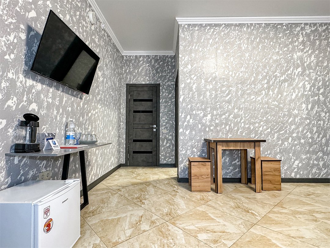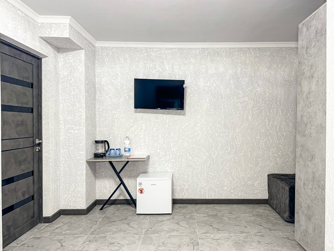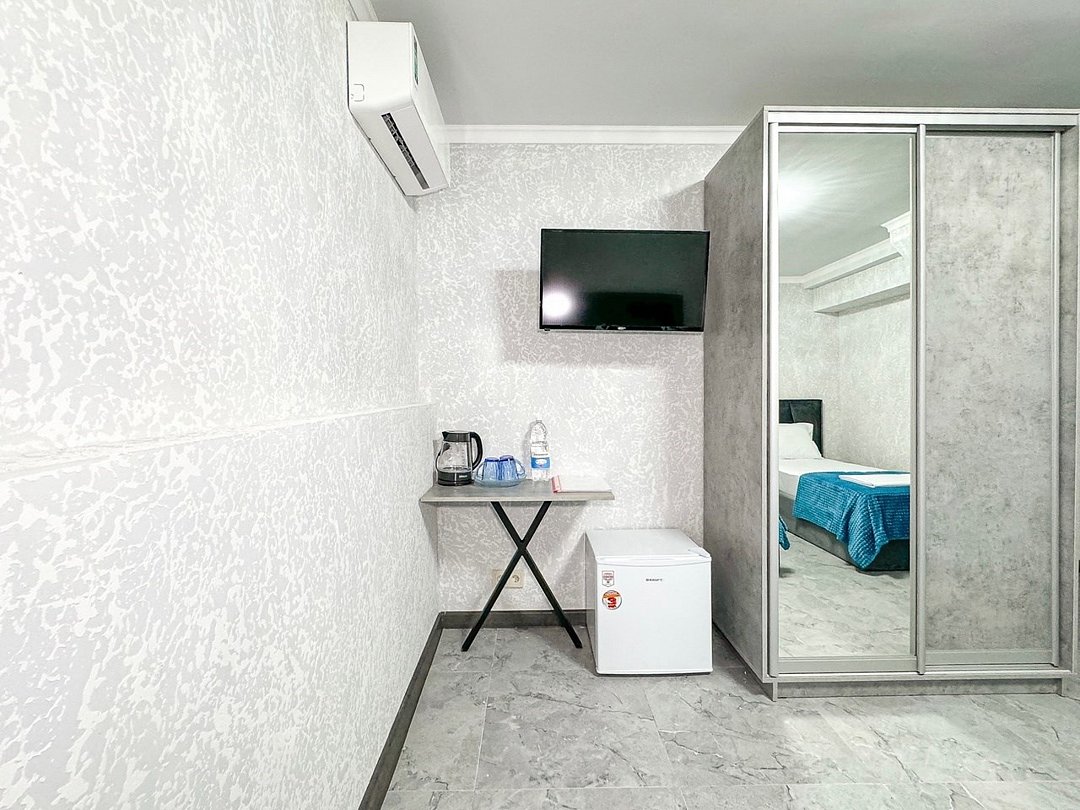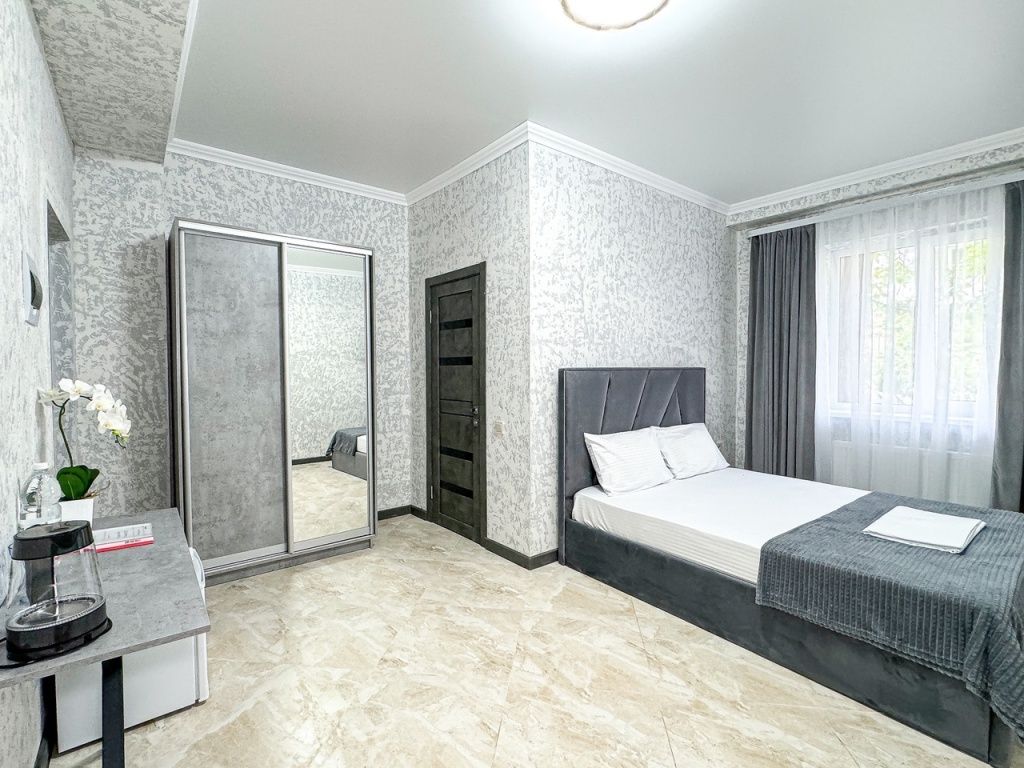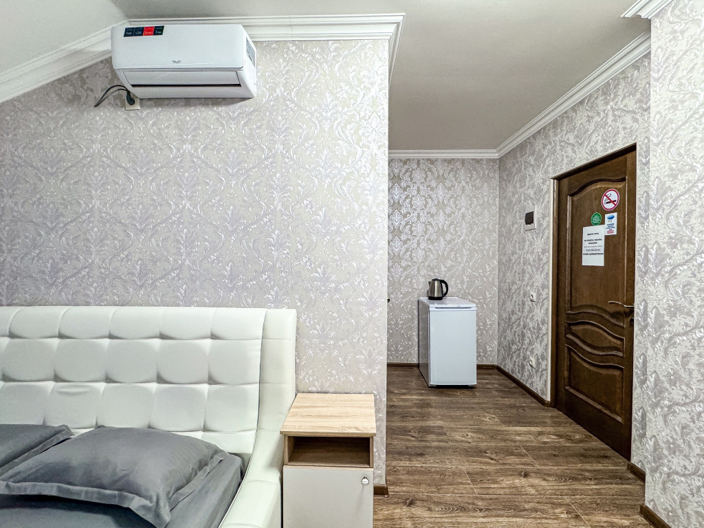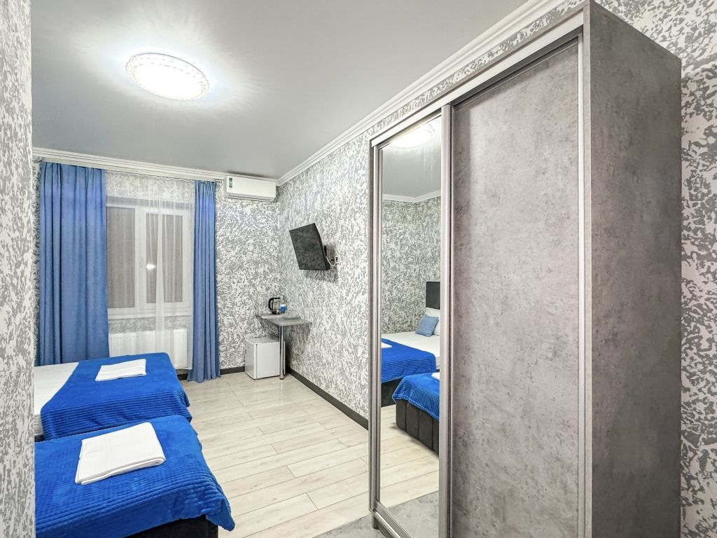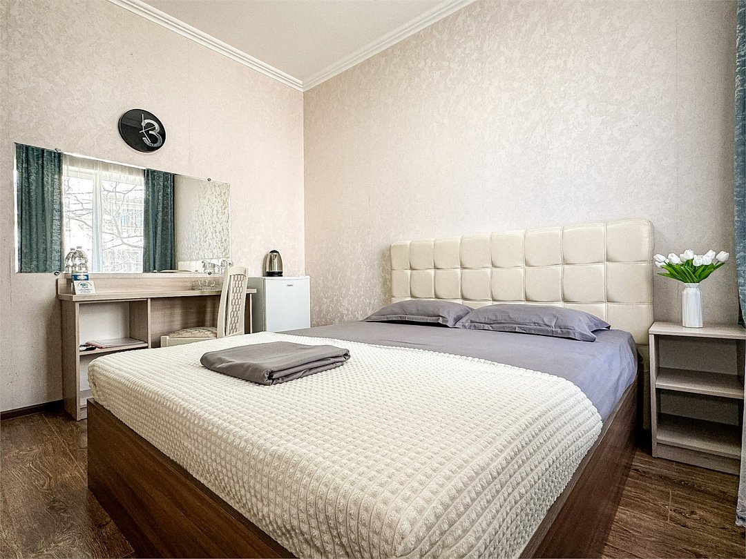 Однокомнатный номер, где можно разместить до 3 гостей. В номере двуспальная кровать + односпальная кровать. В номере, как и в остальных наших номерах обязательный набор удобств для комфортного отдыха: кондиционер, свой душ и туалет, телевизор, чайник с чашками и тарелочками, холодильник, шкаф, фен, тапочки. Особенность этого номера - из окна нет вида. Вид из окна либо в холл гостевого дома, либо на стену соседнего здания Таких номеров у нас 3. Построены июнь 2024. Все номера этой категории на 1 этажеУслуги и удобства