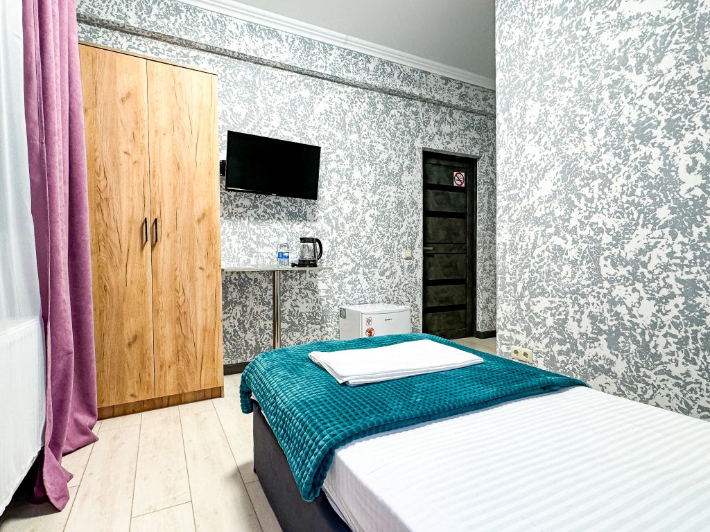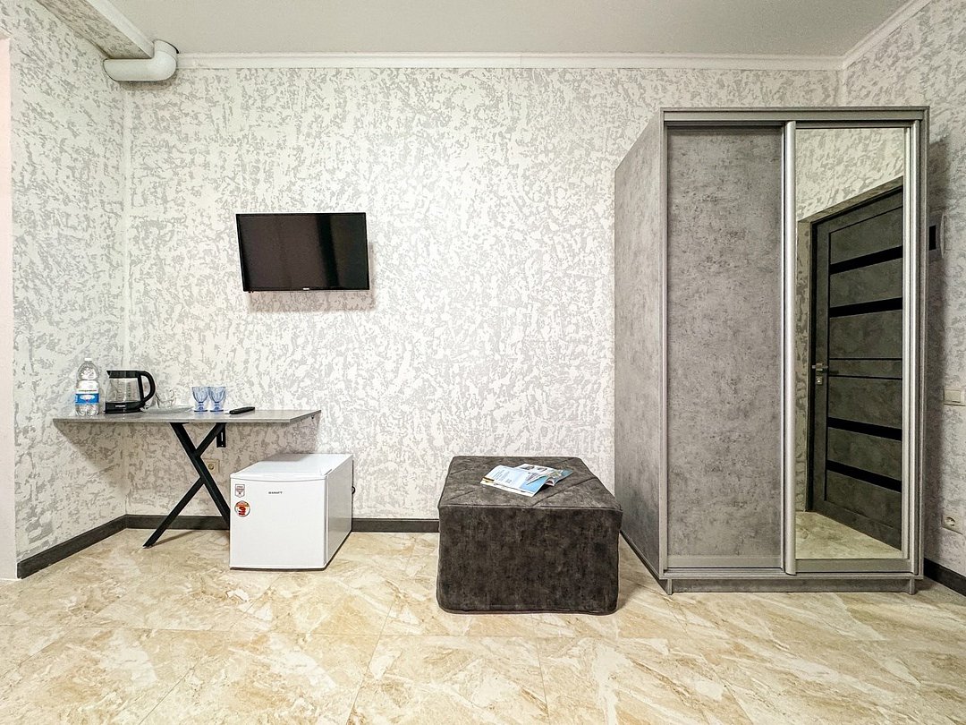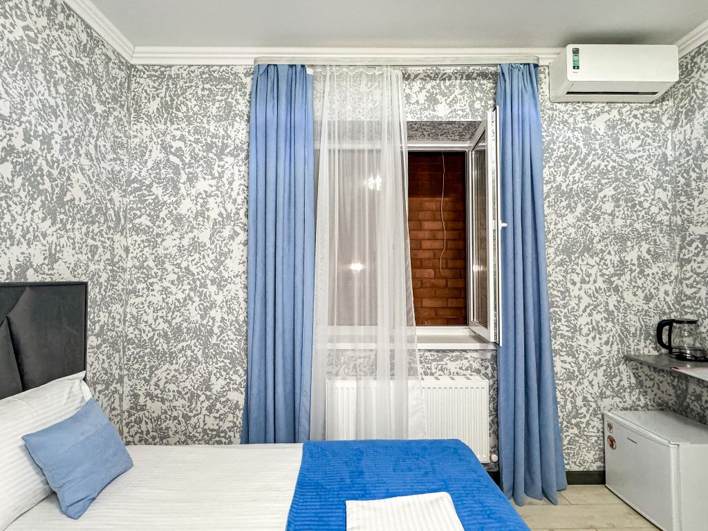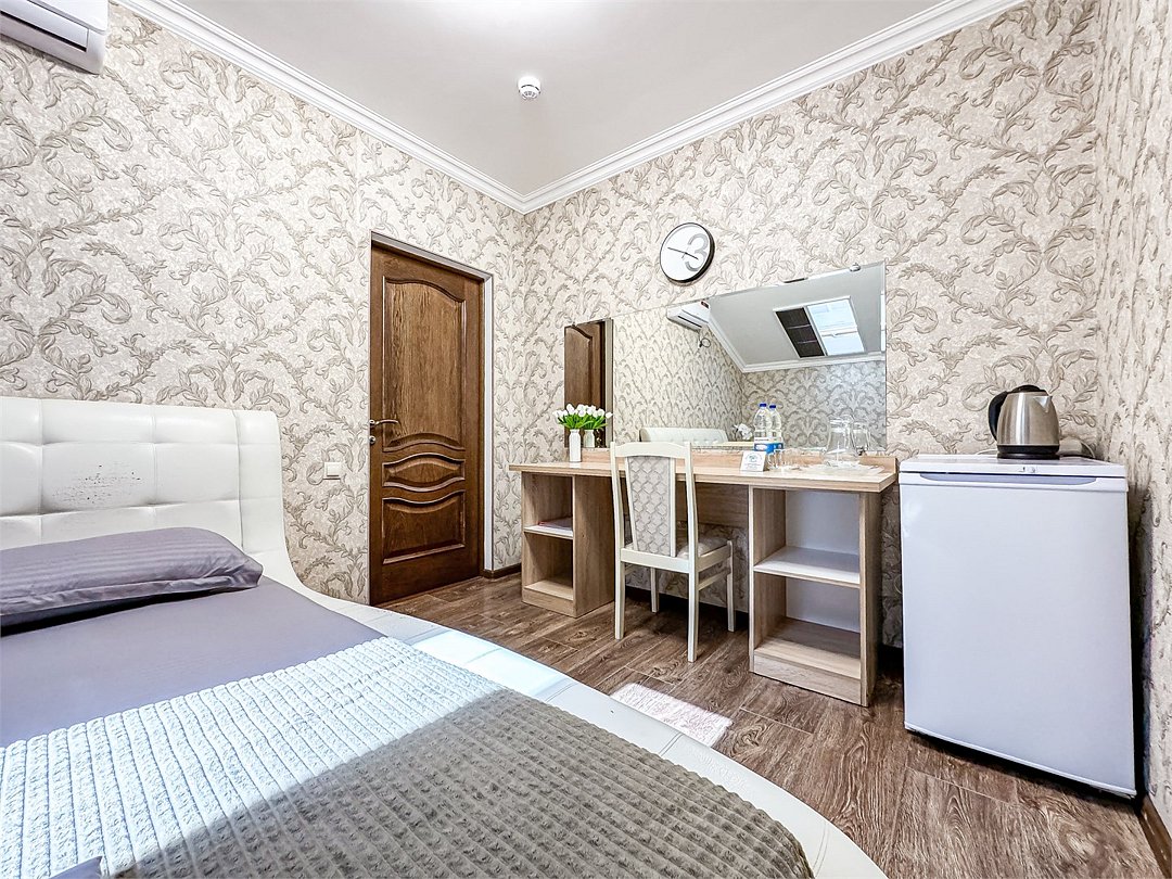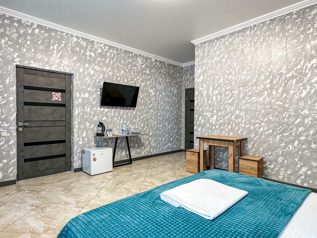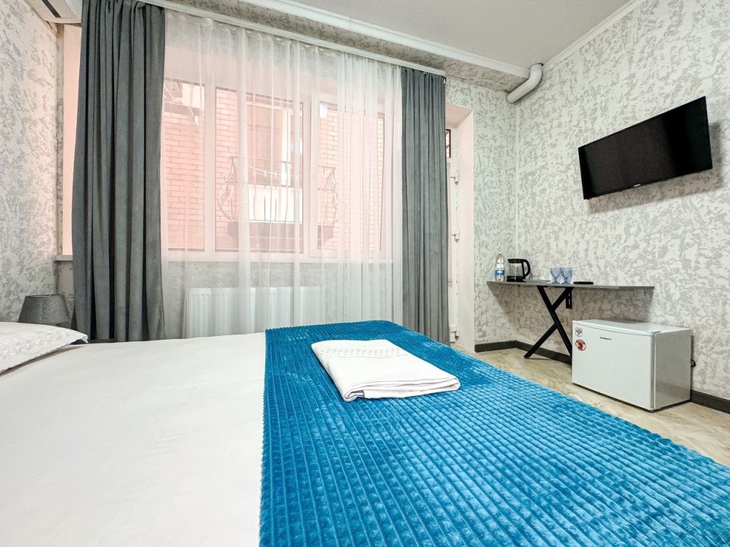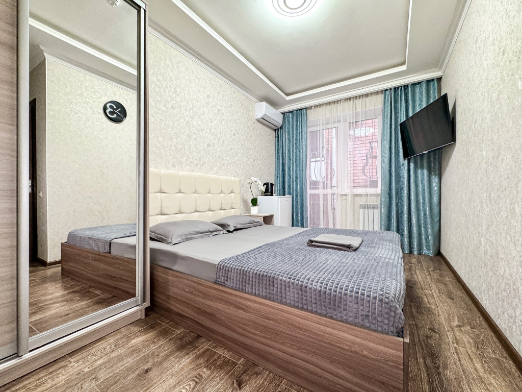 Однокомнатный номер, где можно разместить до 3 гостей. В номере двуспальная кровать + односпальная кровать. В номере, как и в остальных наших номерах обязательный набор удобств для комфортного отдыха: кондиционер, свой душ и туалет, телевизор, чайник с чашками и тарелочками, холодильник, шкаф, фен, тапочки. Особенность этого номера - из окна нет вида. Вид из окна либо в холл гостевого дома, либо на стену соседнего здания Таких номеров у нас 3. Построены июнь 2024. Все номера этой категории на 1 этажеУслуги и удобства