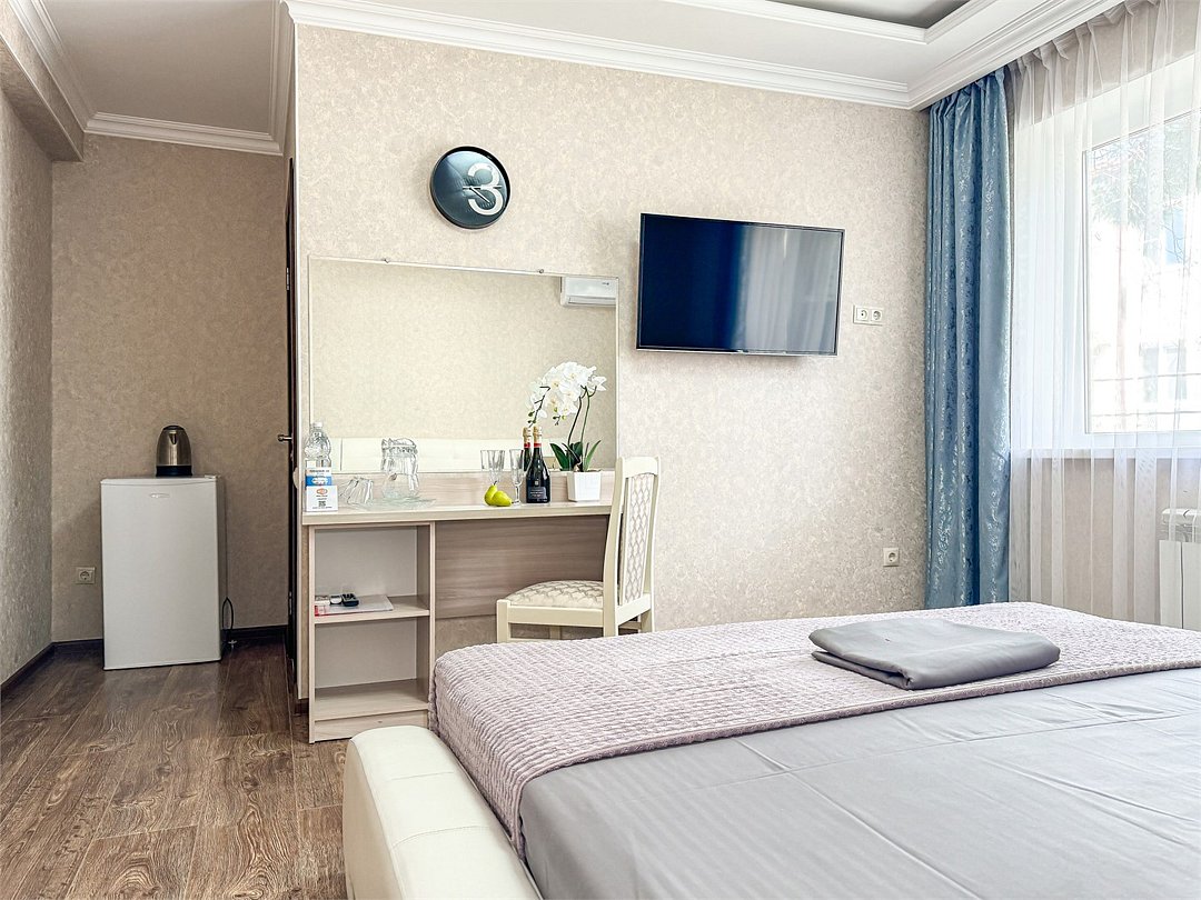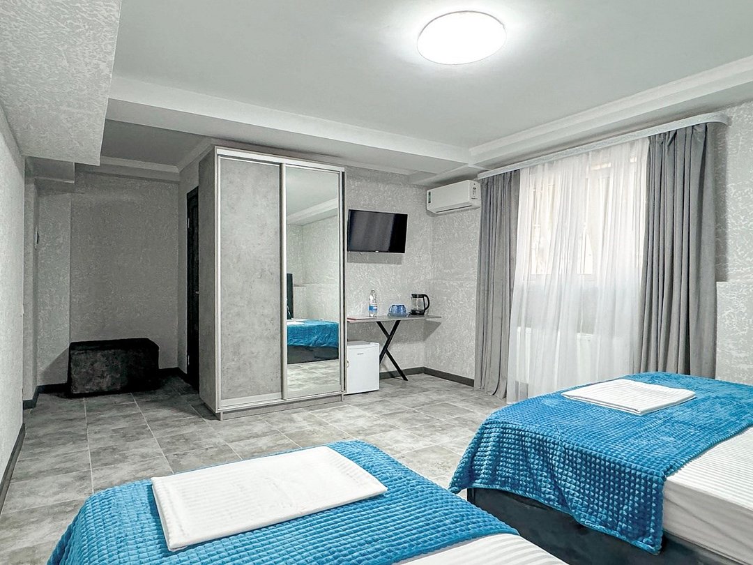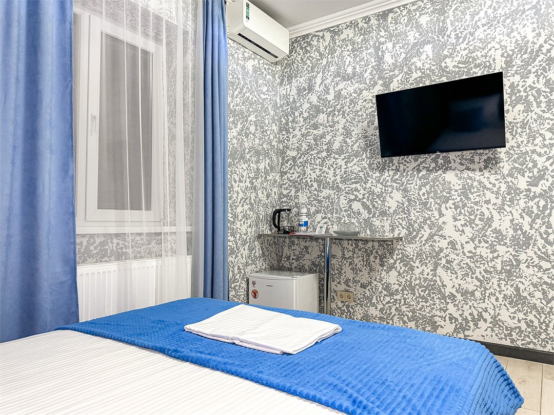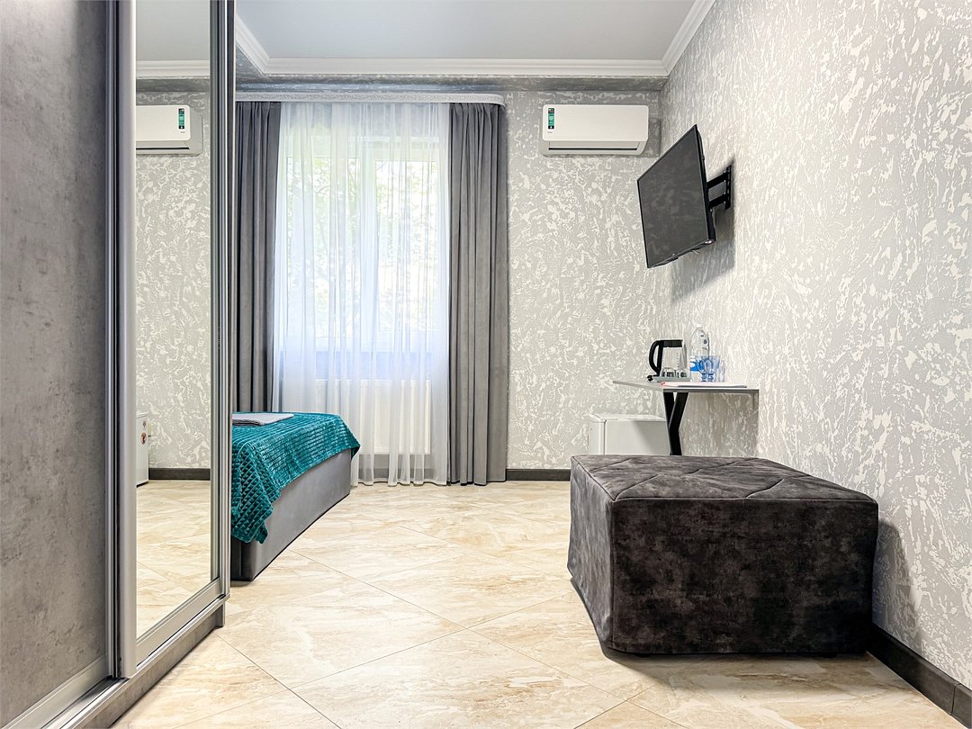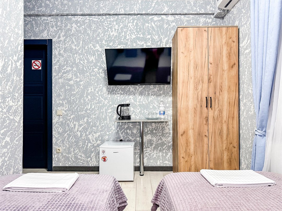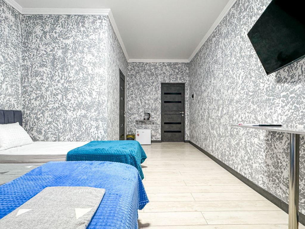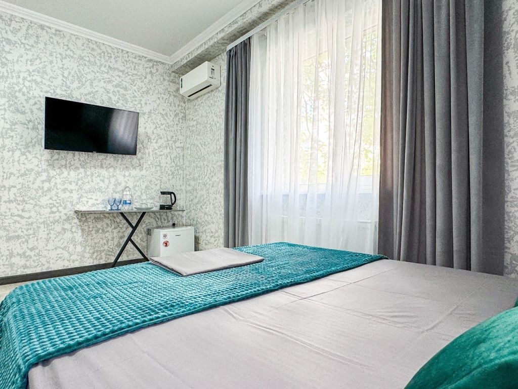 Однокомнатный номер, где можно разместить до 3 гостей. В номере двуспальная кровать + односпальная кровать. В номере, как и в остальных наших номерах обязательный набор удобств для комфортного отдыха: кондиционер, свой душ и туалет, телевизор, чайник с чашками и тарелочками, холодильник, шкаф, фен, тапочки. Особенность этого номера - из окна нет вида. Вид из окна либо в холл гостевого дома, либо на стену соседнего здания Таких номеров у нас 3. Построены июнь 2024. Все номера этой категории на 1 этажеУслуги и удобства