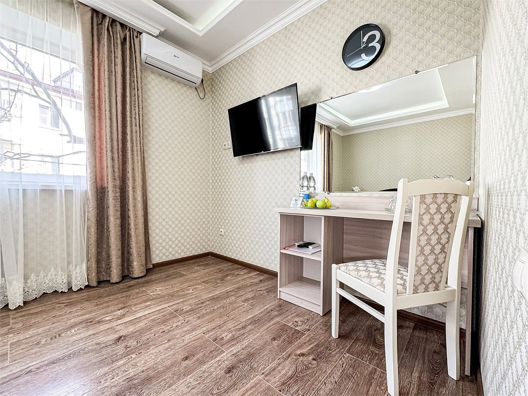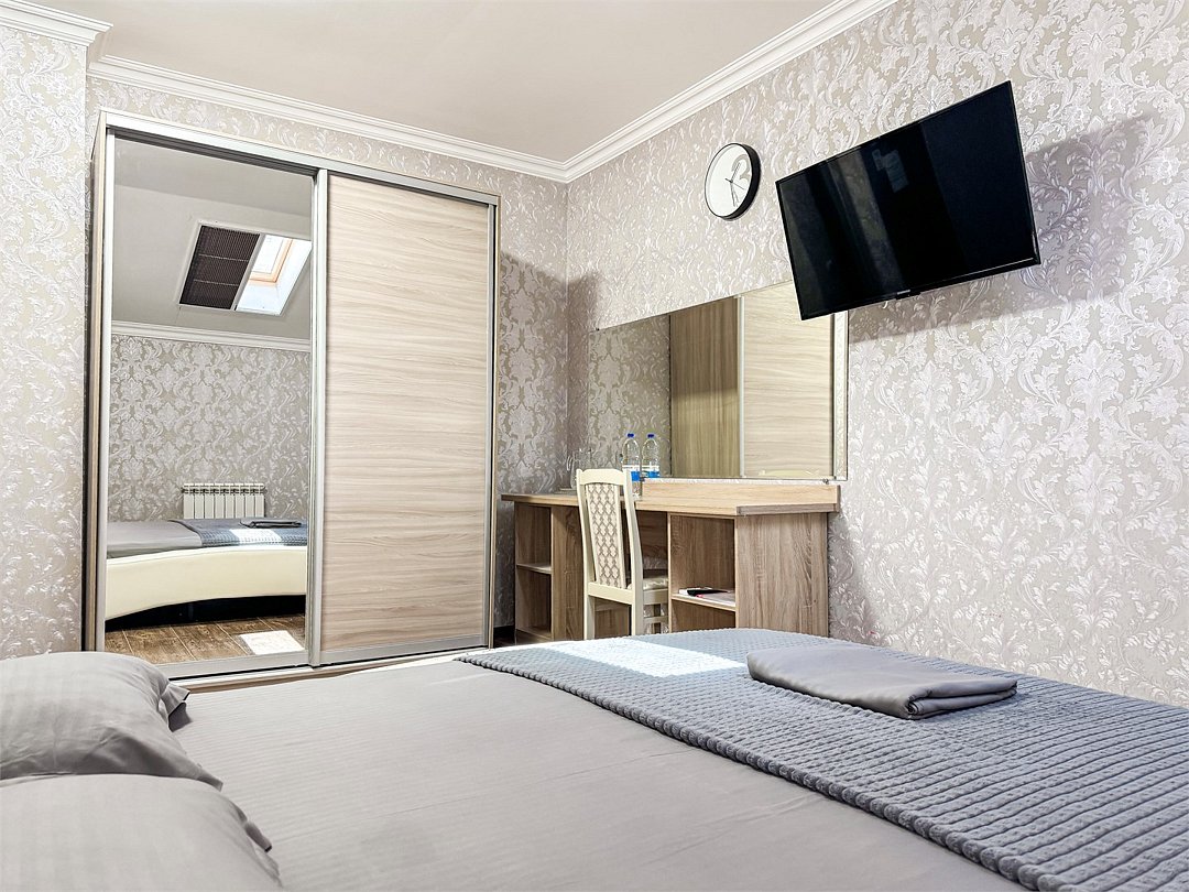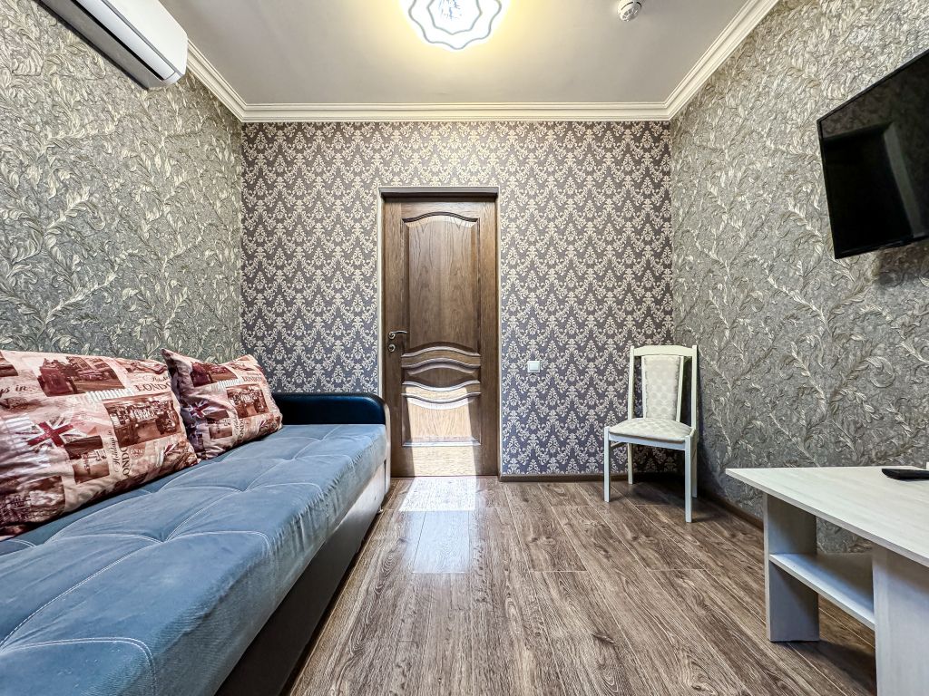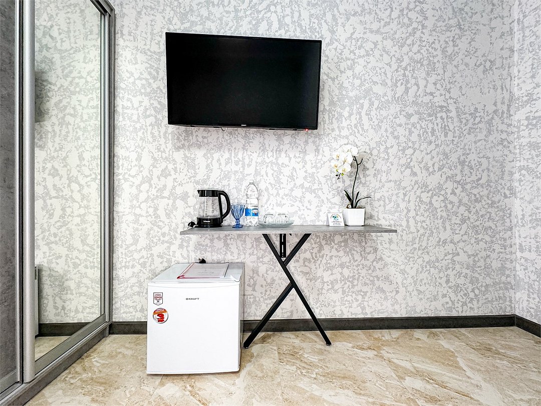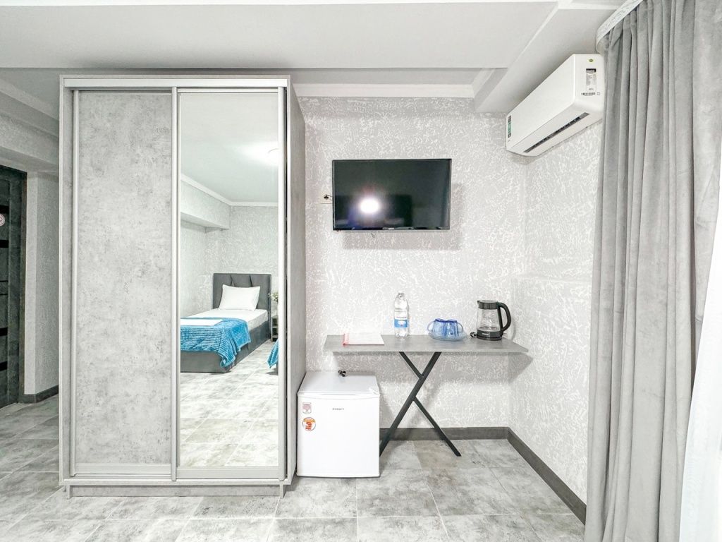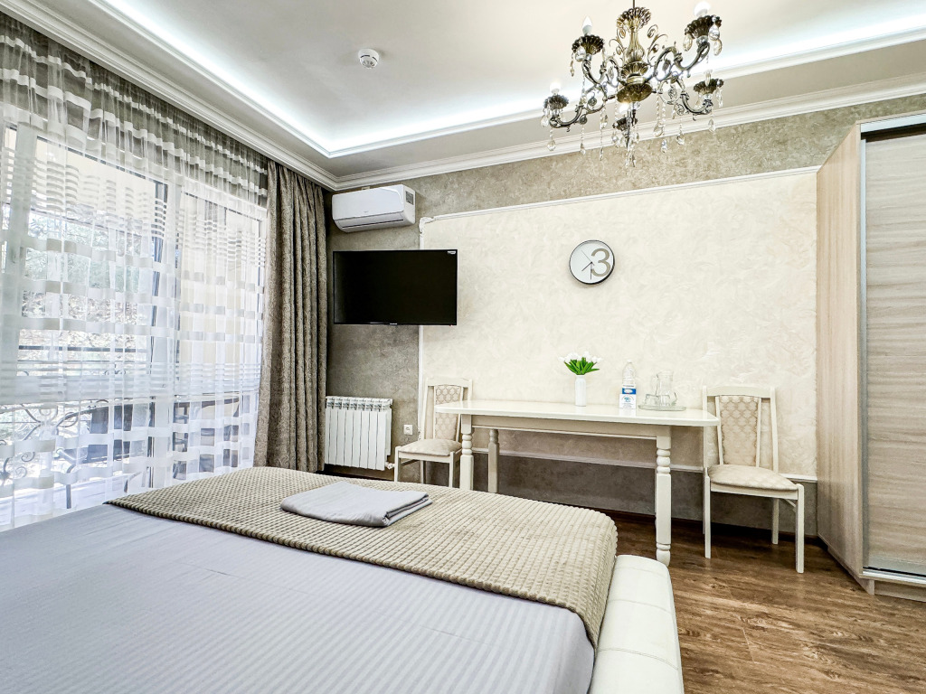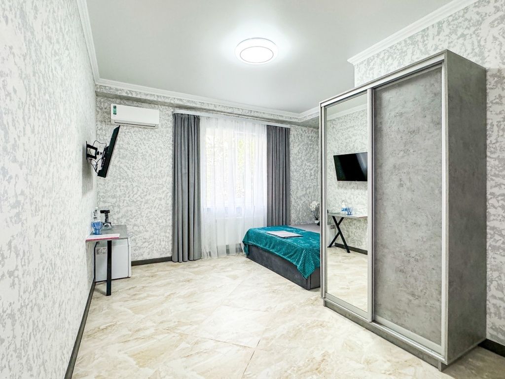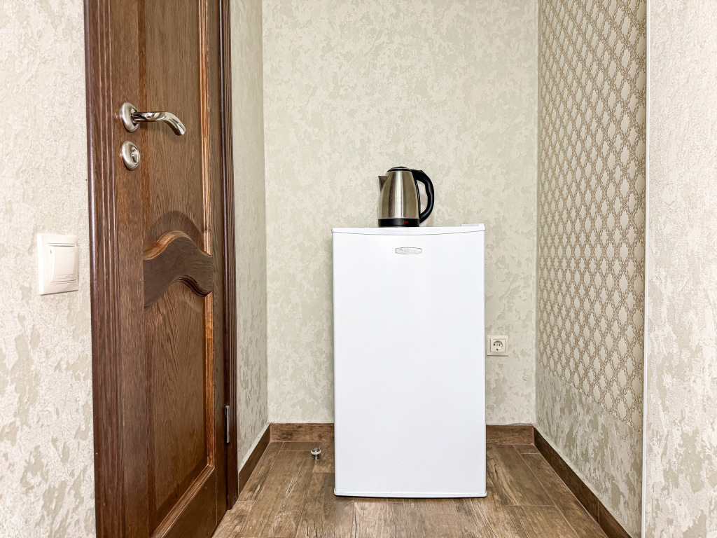 Однокомнатный номер, где можно разместить до 3 гостей. В номере двуспальная кровать + односпальная кровать. В номере, как и в остальных наших номерах обязательный набор удобств для комфортного отдыха: кондиционер, свой душ и туалет, телевизор, чайник с чашками и тарелочками, холодильник, шкаф, фен, тапочки. Особенность этого номера - из окна нет вида. Вид из окна либо в холл гостевого дома, либо на стену соседнего здания Таких номеров у нас 3. Построены июнь 2024. Все номера этой категории на 1 этажеУслуги и удобства