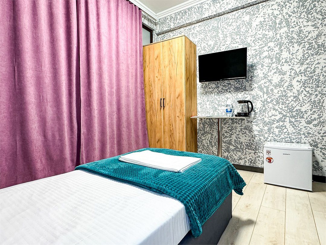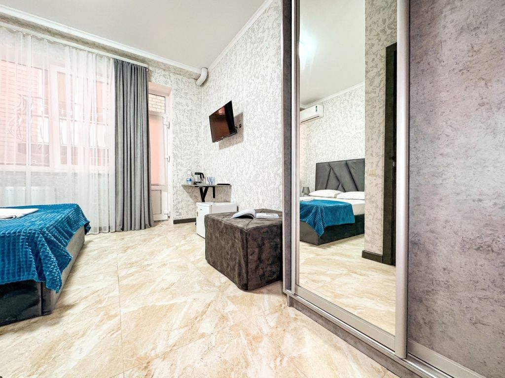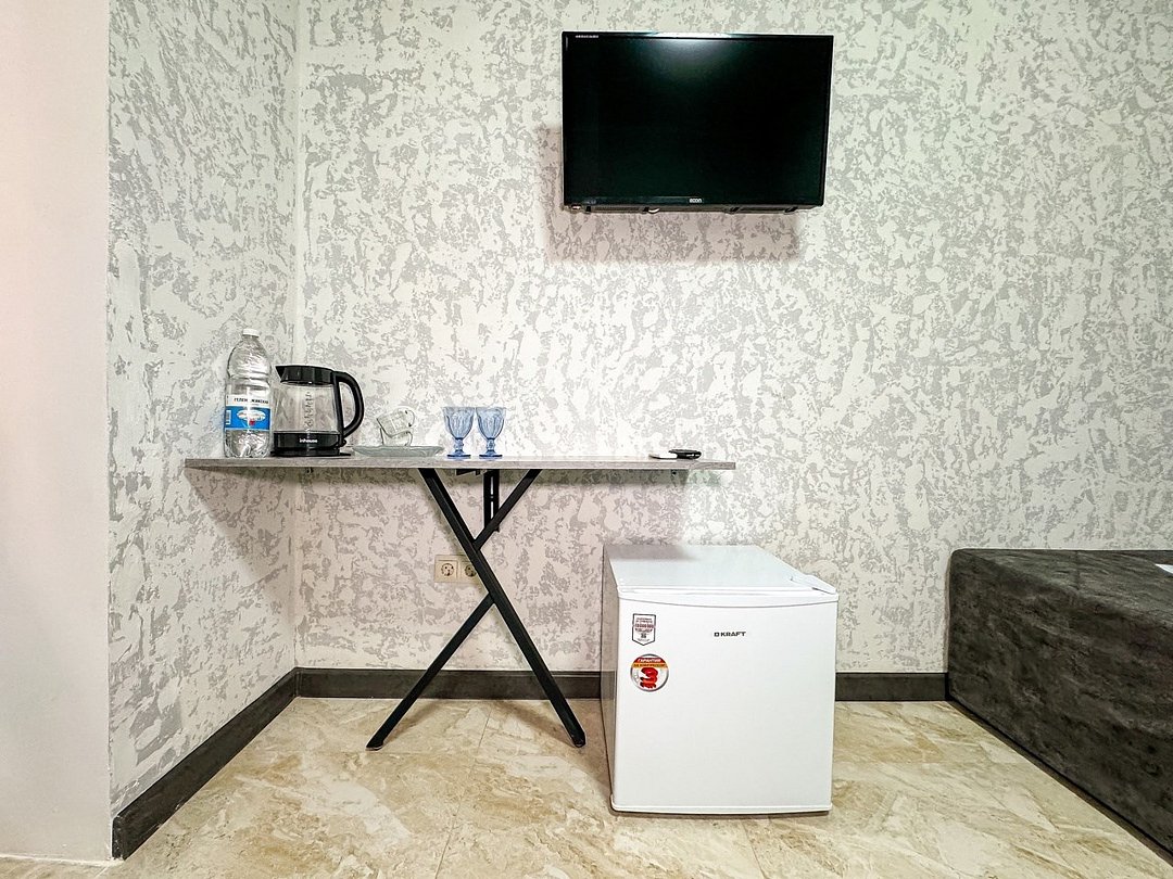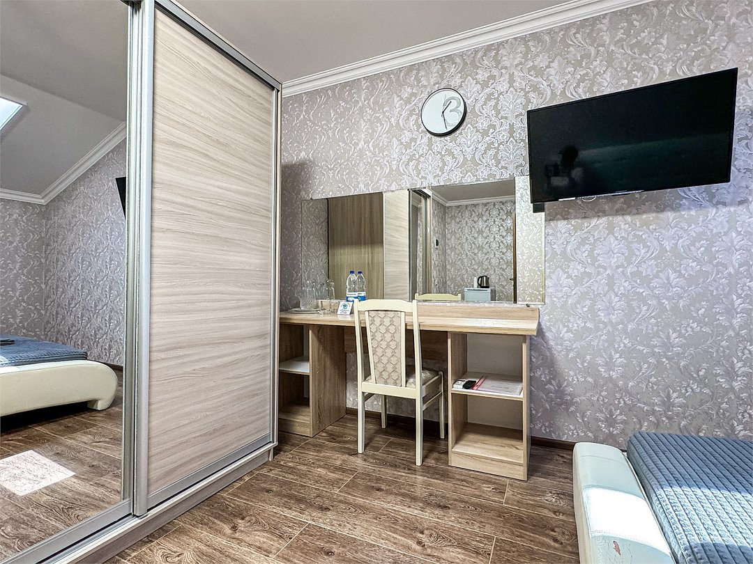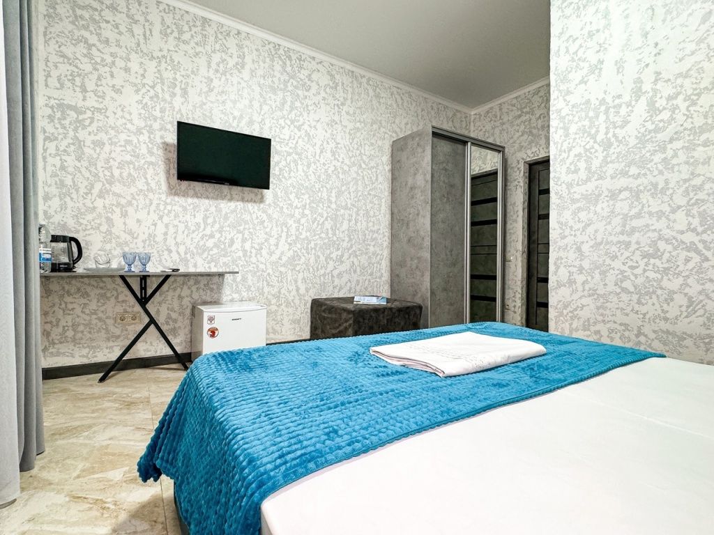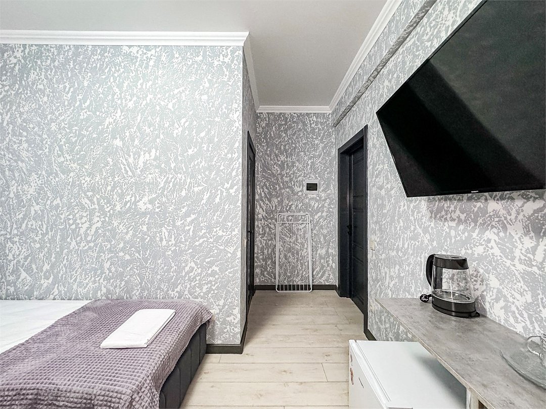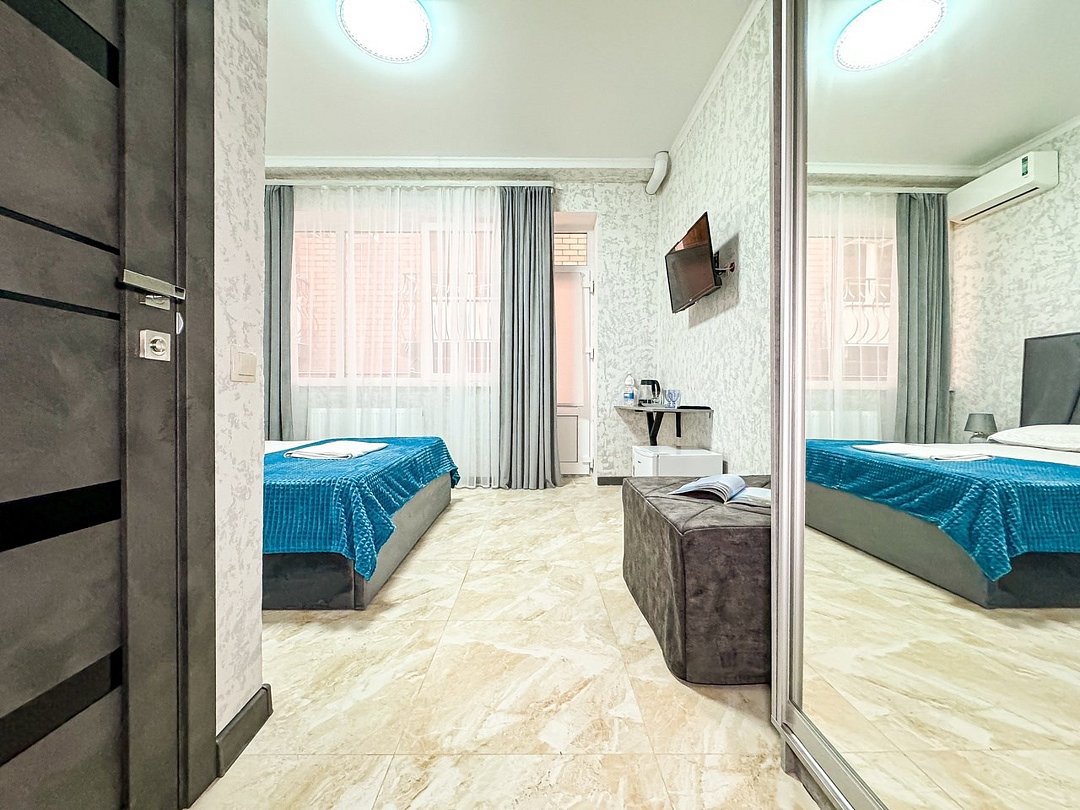 Однокомнатный номер, где можно разместить до 3 гостей. В номере двуспальная кровать + односпальная кровать. В номере, как и в остальных наших номерах обязательный набор удобств для комфортного отдыха: кондиционер, свой душ и туалет, телевизор, чайник с чашками и тарелочками, холодильник, шкаф, фен, тапочки. Особенность этого номера - из окна нет вида. Вид из окна либо в холл гостевого дома, либо на стену соседнего здания Таких номеров у нас 3. Построены июнь 2024. Все номера этой категории на 1 этажеУслуги и удобства