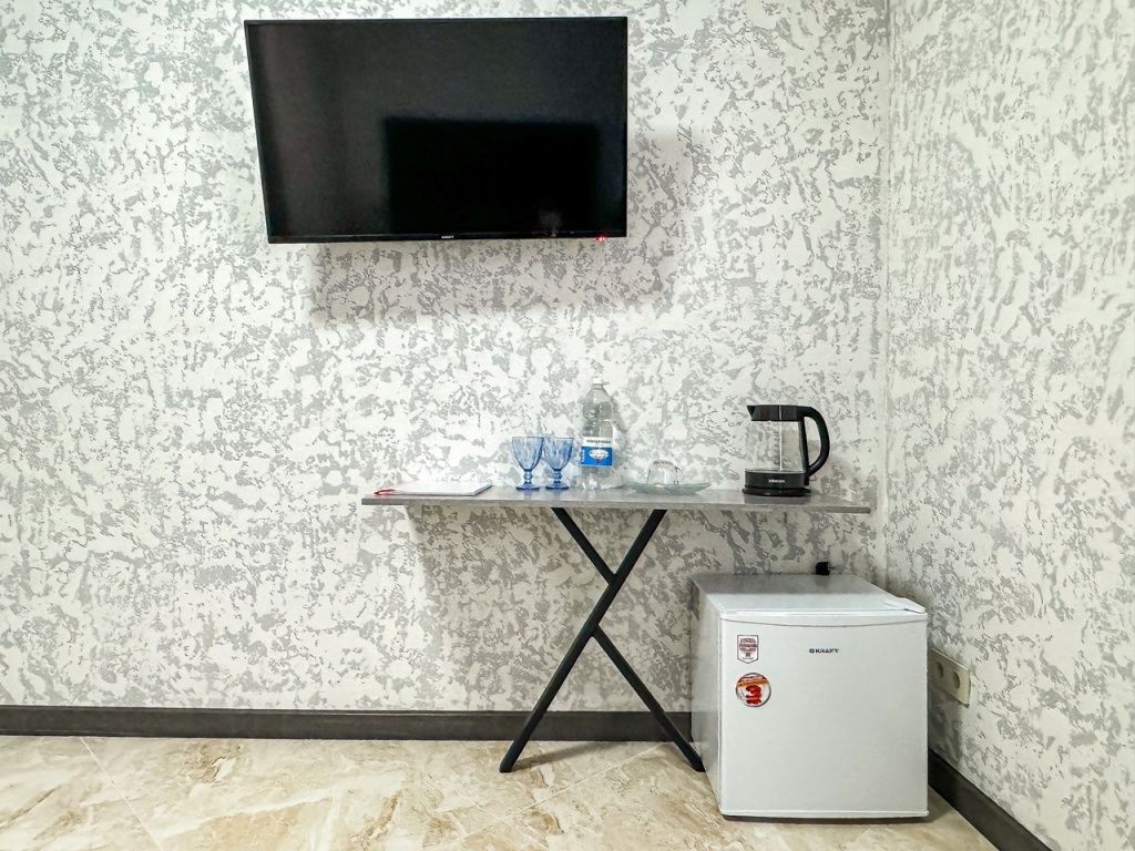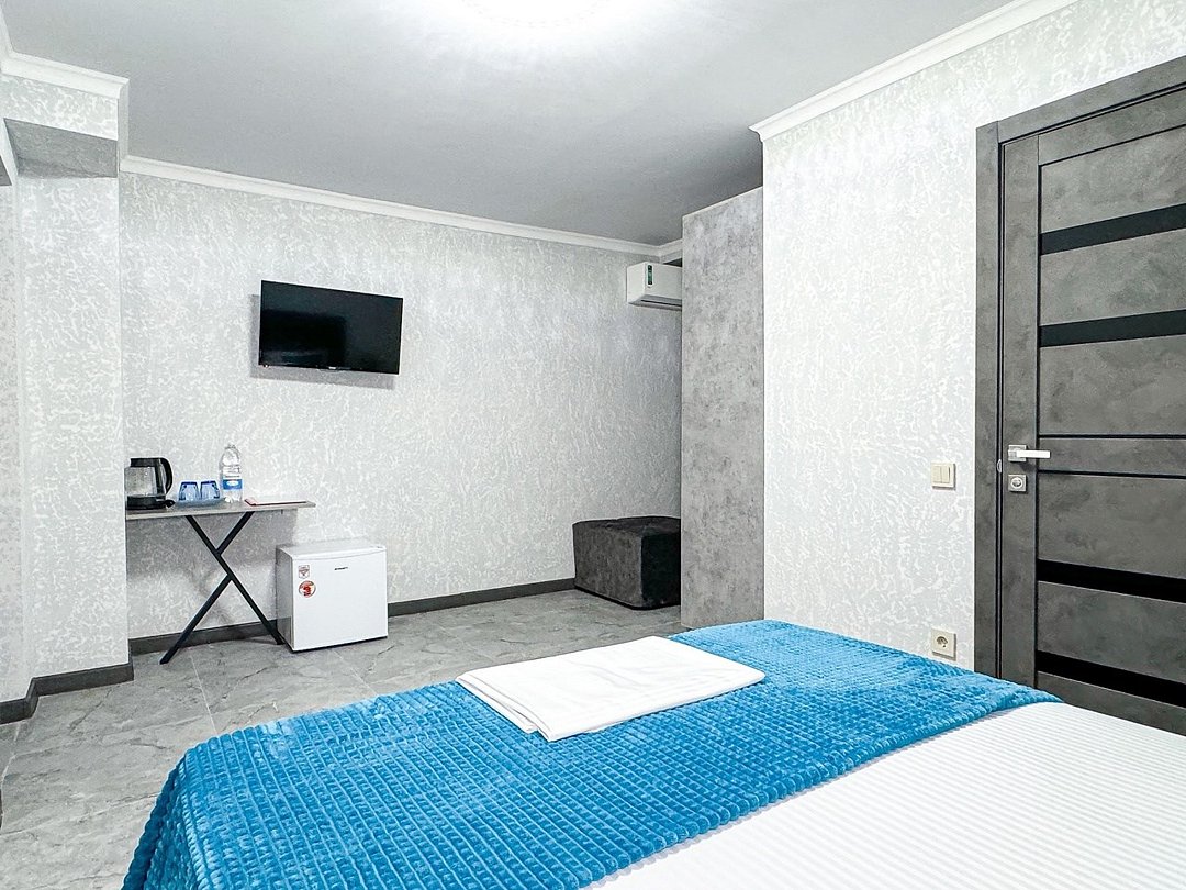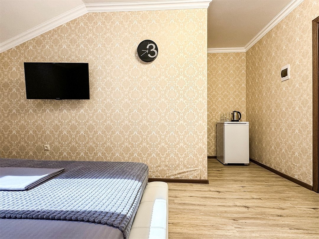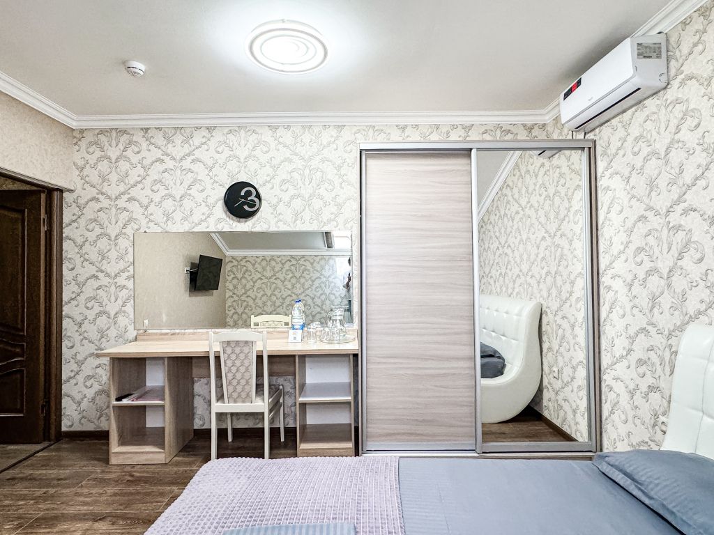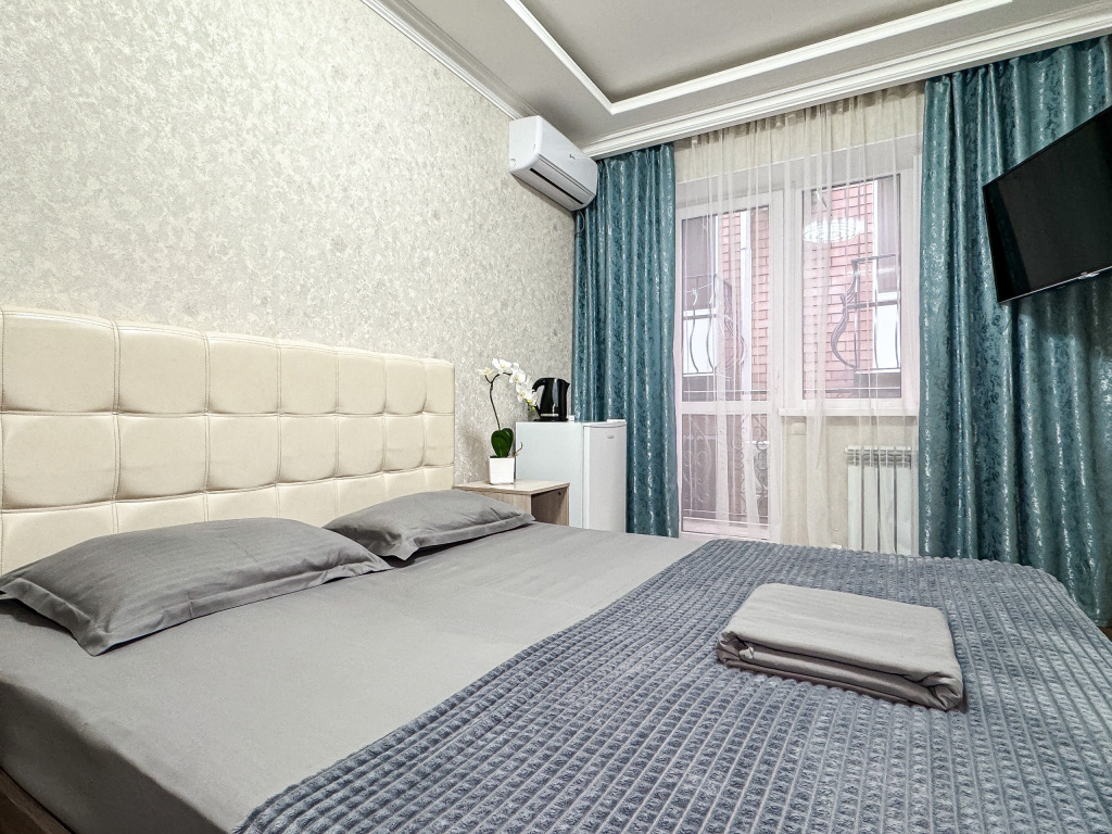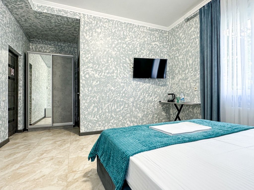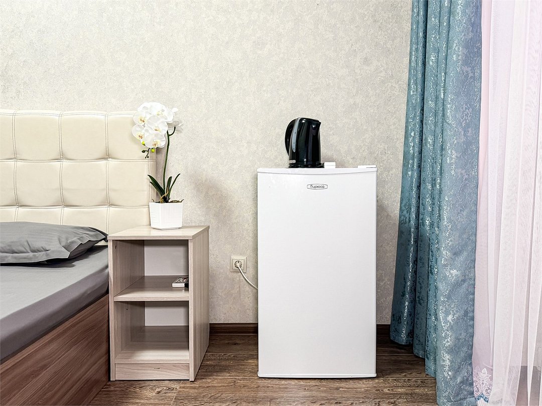 Однокомнатный номер, где можно разместить до 3 гостей. В номере двуспальная кровать + односпальная кровать. В номере, как и в остальных наших номерах обязательный набор удобств для комфортного отдыха: кондиционер, свой душ и туалет, телевизор, чайник с чашками и тарелочками, холодильник, шкаф, фен, тапочки. Особенность этого номера - из окна нет вида. Вид из окна либо в холл гостевого дома, либо на стену соседнего здания Таких номеров у нас 3. Построены июнь 2024. Все номера этой категории на 1 этажеУслуги и удобства