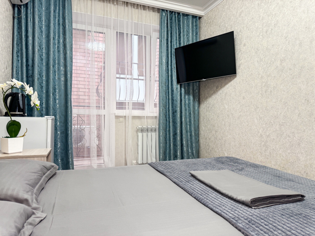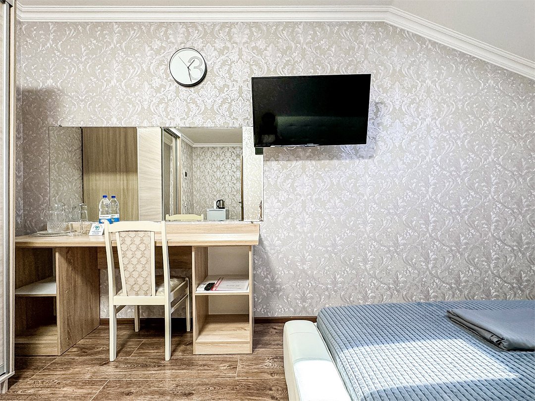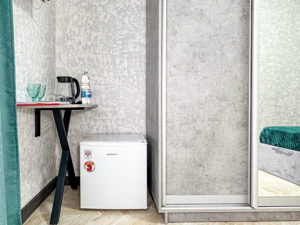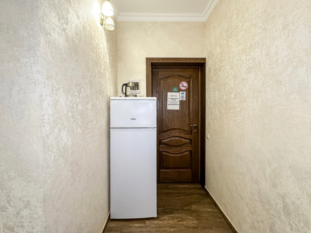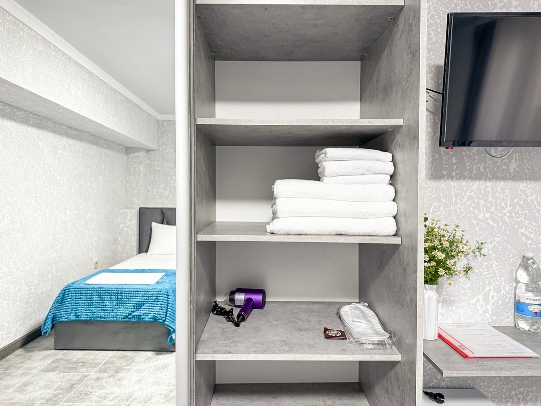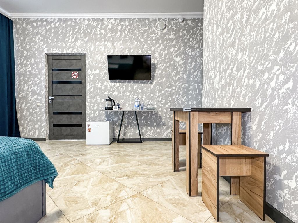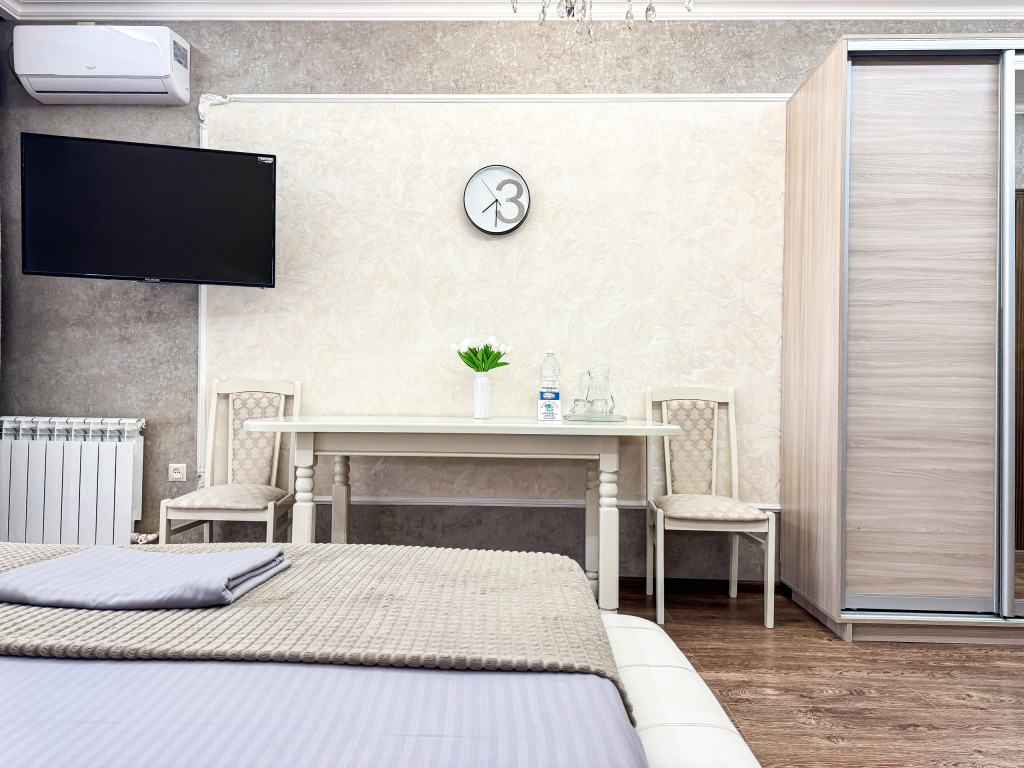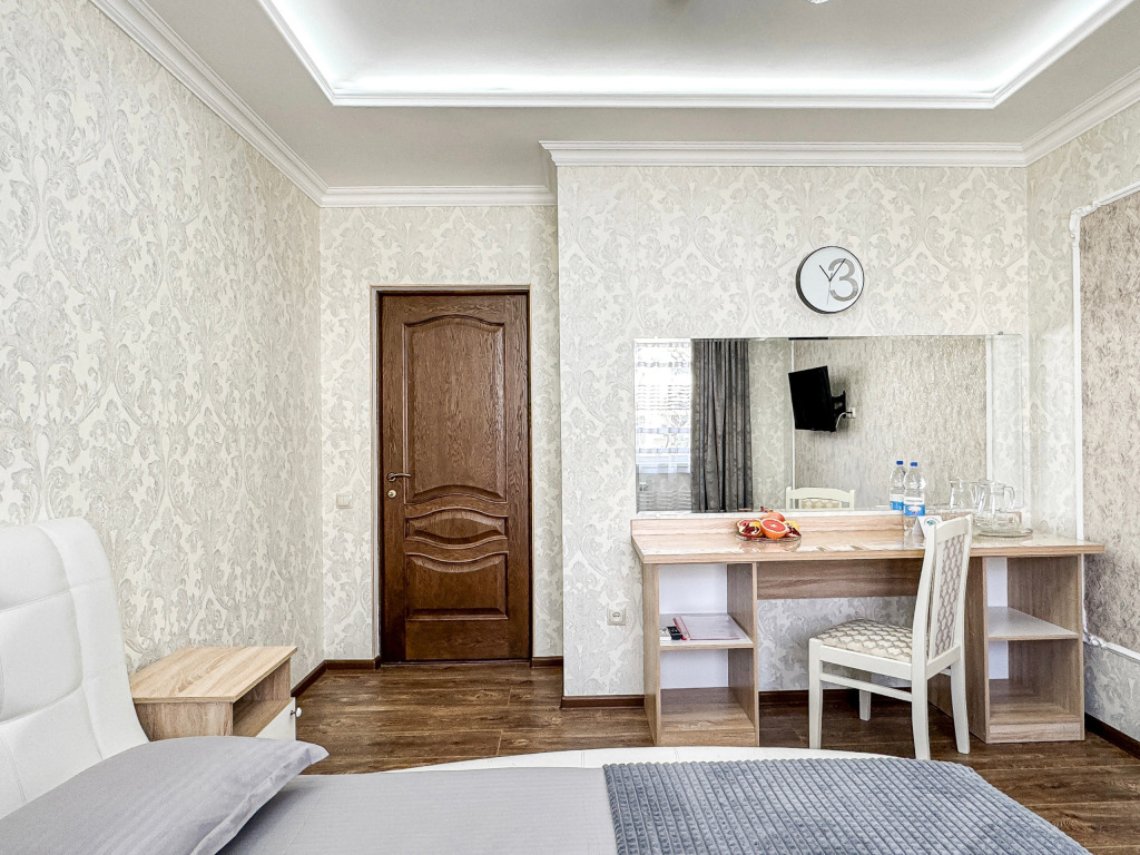 Однокомнатный номер, где можно разместить до 3 гостей. В номере двуспальная кровать + односпальная кровать. В номере, как и в остальных наших номерах обязательный набор удобств для комфортного отдыха: кондиционер, свой душ и туалет, телевизор, чайник с чашками и тарелочками, холодильник, шкаф, фен, тапочки. Особенность этого номера - из окна нет вида. Вид из окна либо в холл гостевого дома, либо на стену соседнего здания Таких номеров у нас 3. Построены июнь 2024. Все номера этой категории на 1 этажеУслуги и удобства