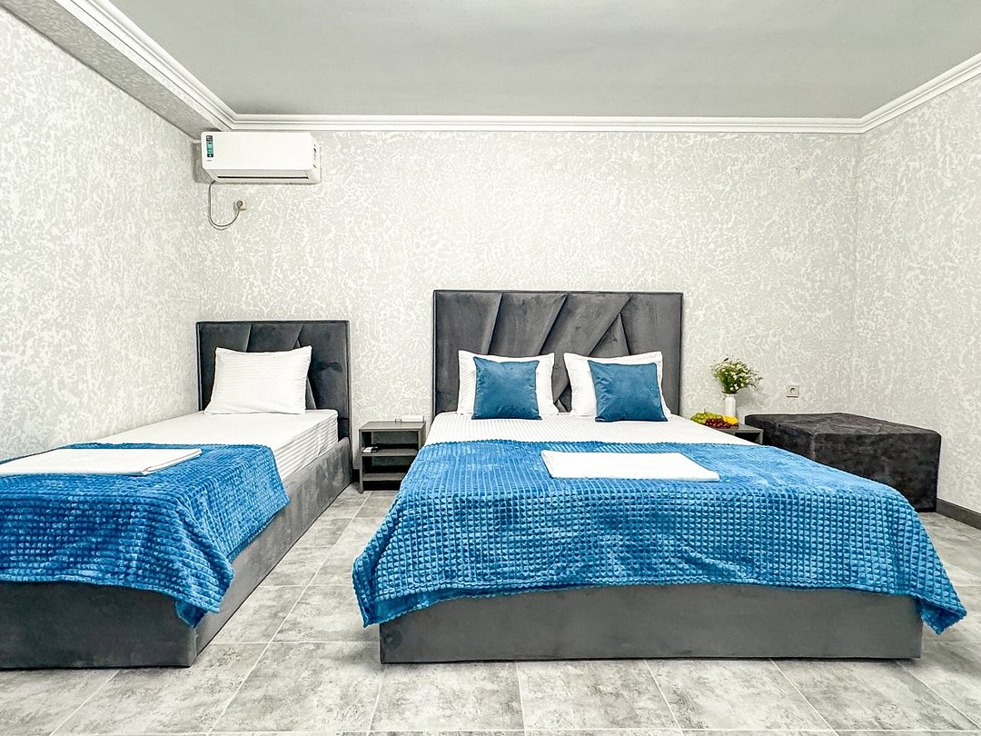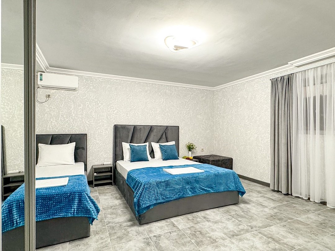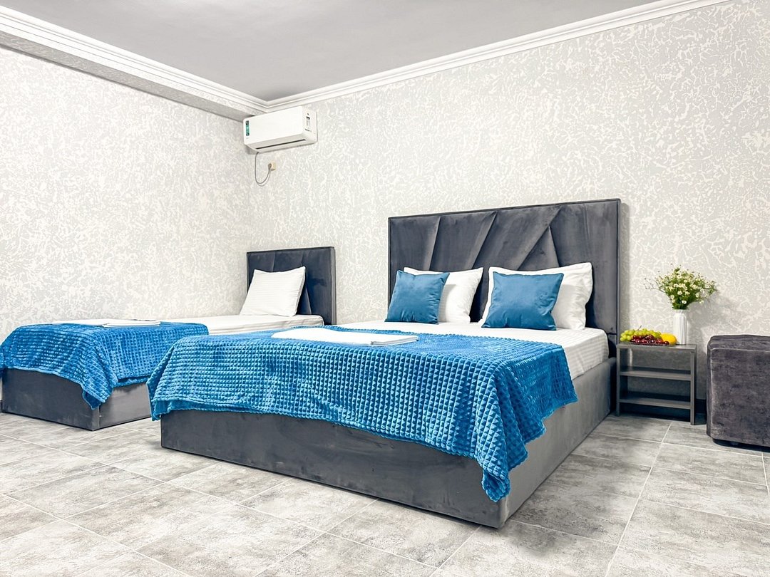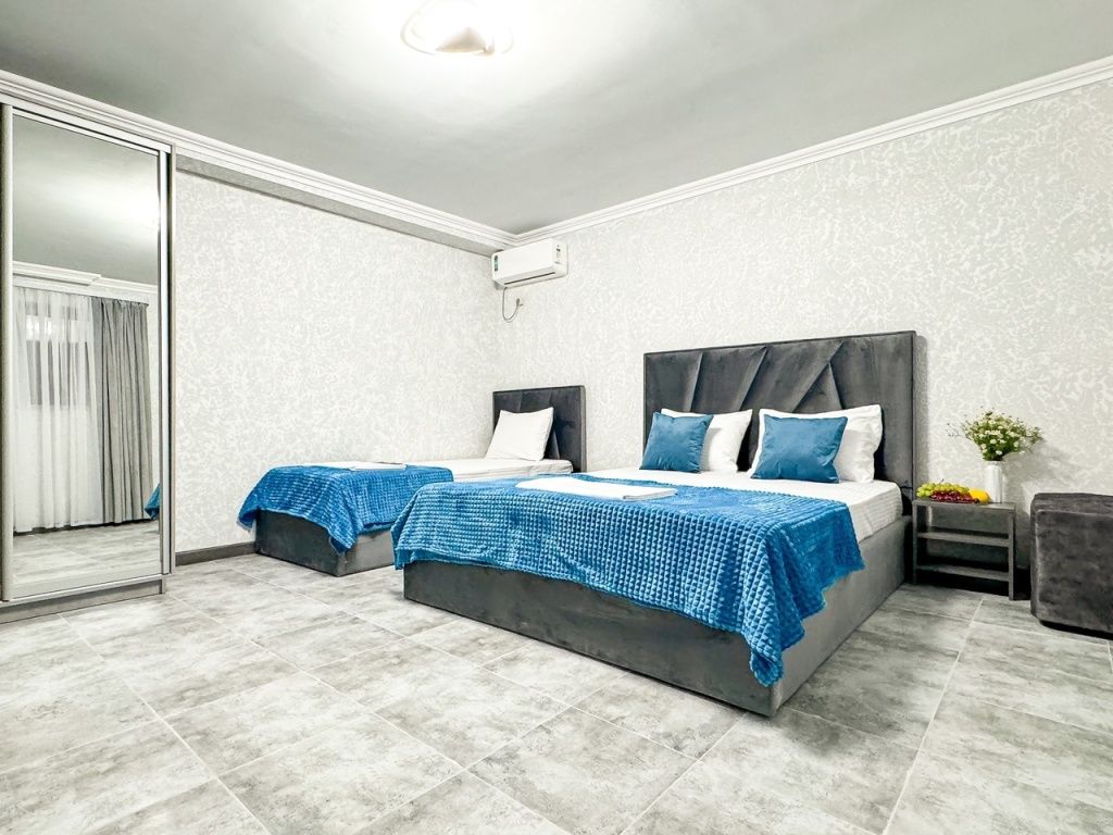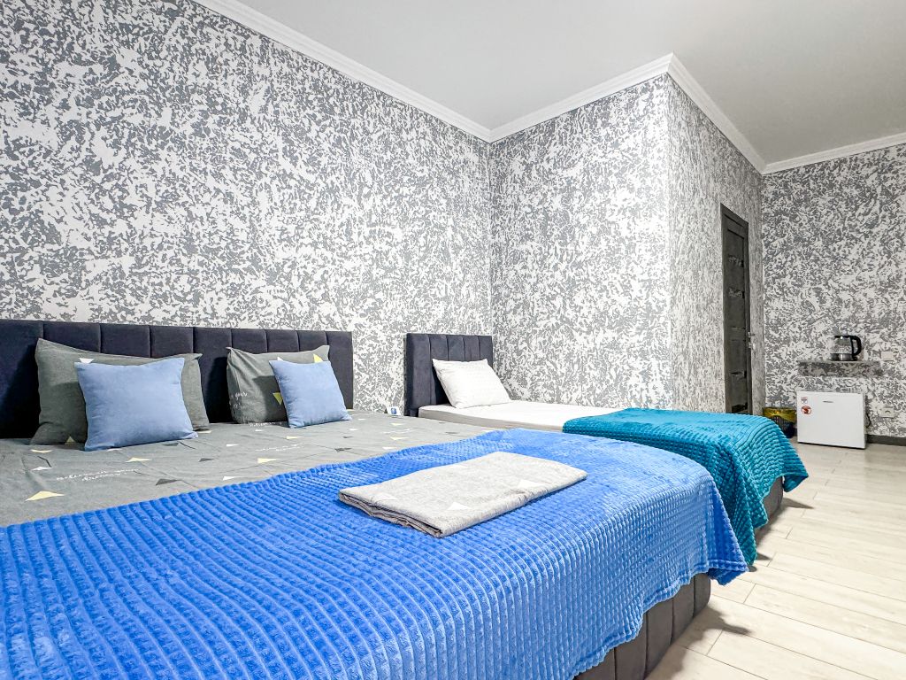 Самый недорогой семейный номер из наших имеющихся. Новый, построен 2024. Однокомнатный со своим душем и туалетом, кондиционер, холодильник, чайник, шкаф, фен - обязательные удобства всех наших номеров, и этот не исключение. В номере двуспальная кровать + односпальная + можно добавить 1 раскладное место. Итого семьей 4 гостя экономно, но комфортно можно разместиться.Услуги и удобства