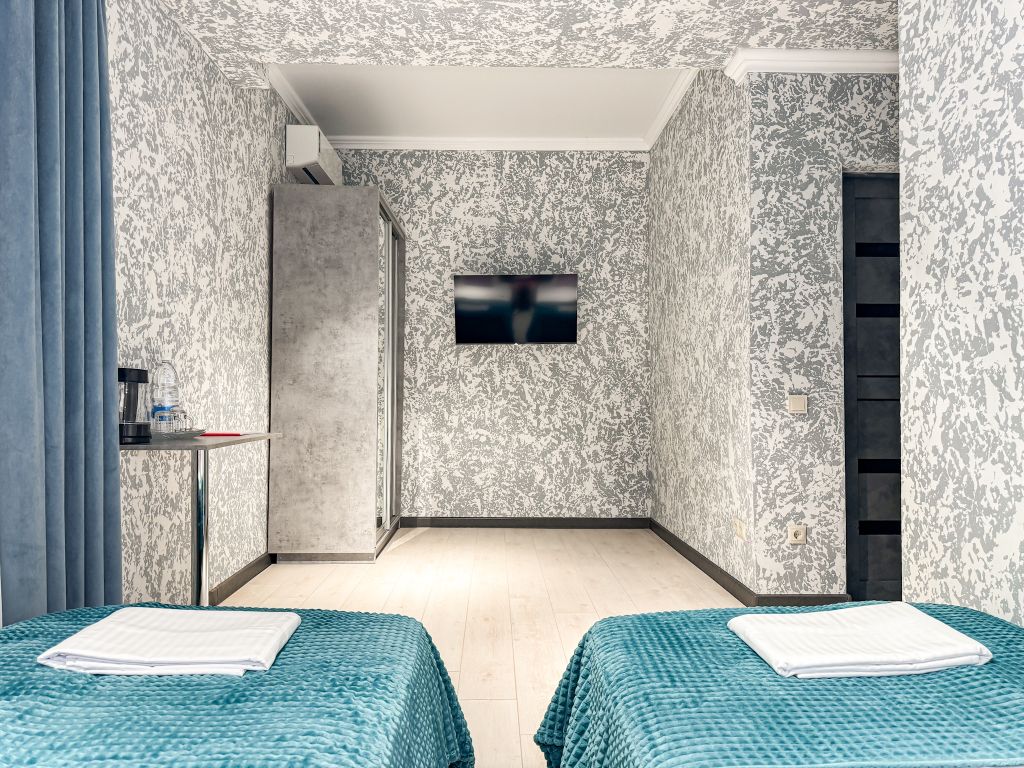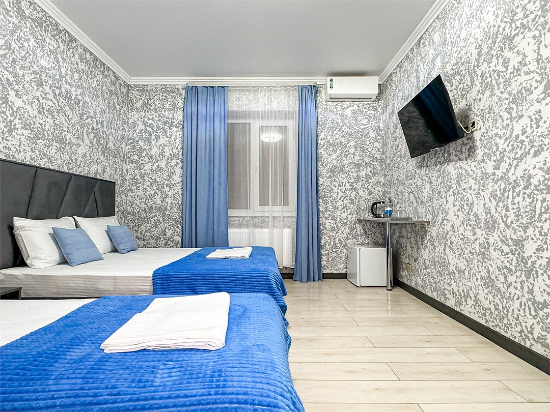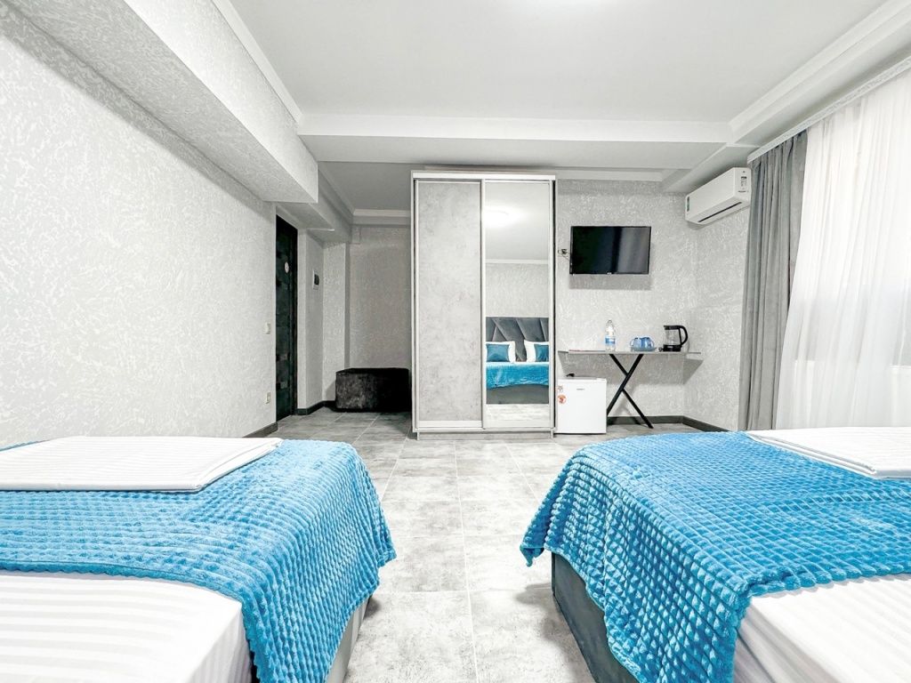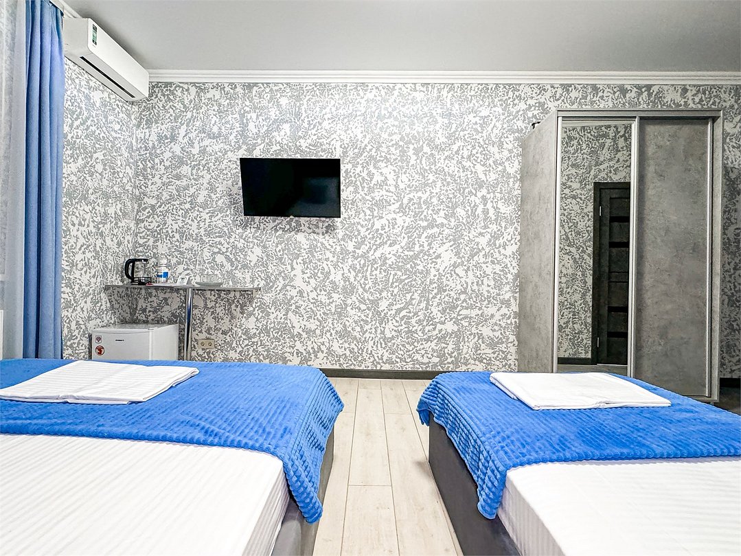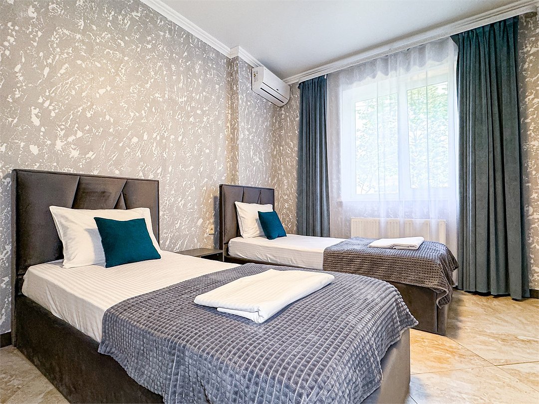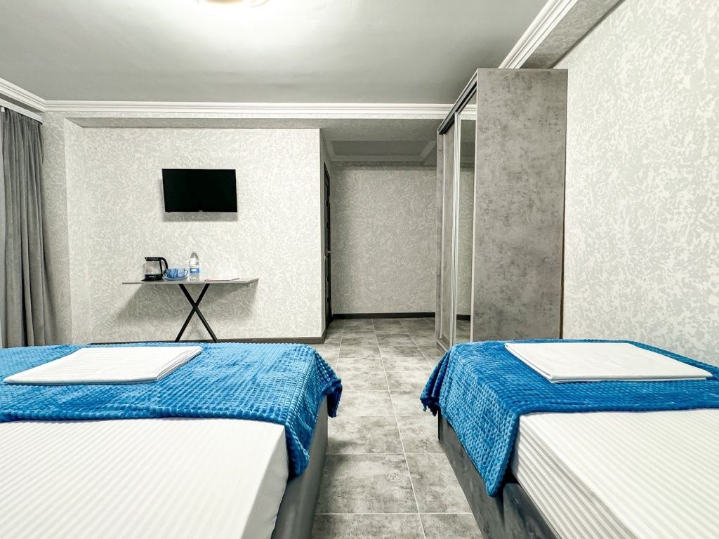 Номер со всеми необходимыми удобствами. Две односпальные кровати, шкаф с зеркалом в полный рост, кондиционер, плазменный большой телевизор, туалетная комната со своим душем и туалетом. В номере так же есть чайник, холодильник, небольшой набор посуды, фен, сейф. Банные полотенца и косметические средства, ложка для обуви. При желании можно добавить доп. место (или детскую кроватку) для одного ребёнка, это будет самый бюджетный вариант, чтобы разместиться небольшой семьей 2+1.