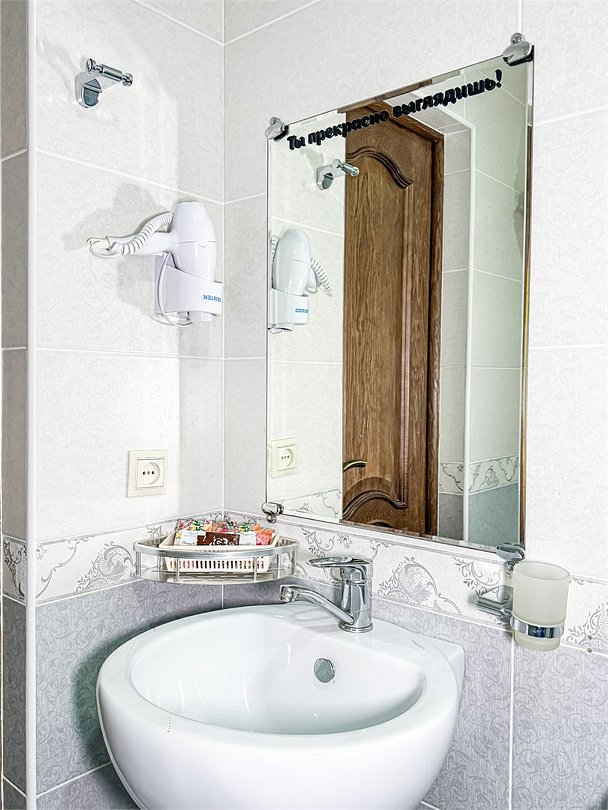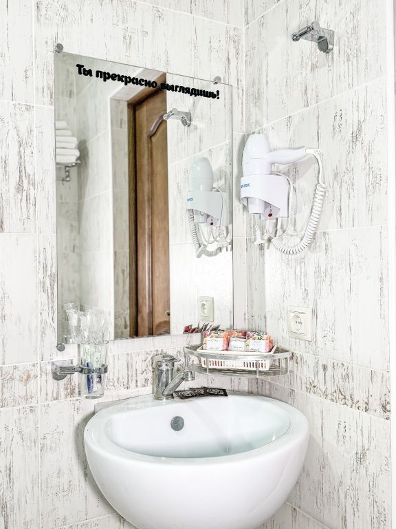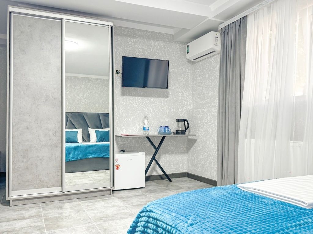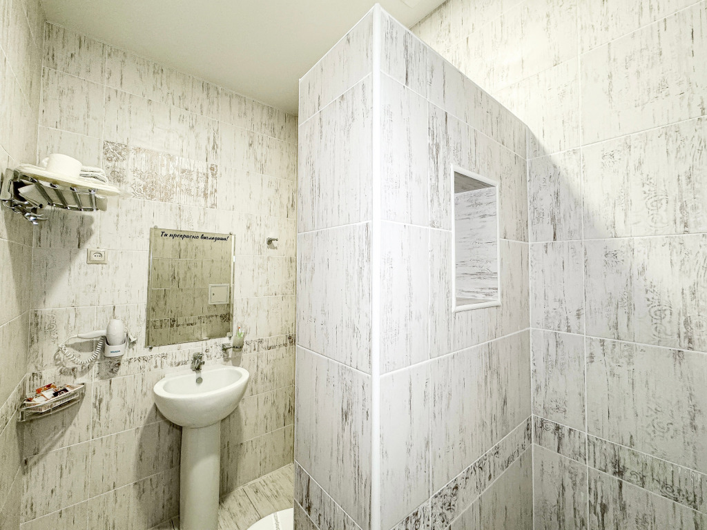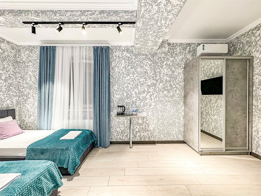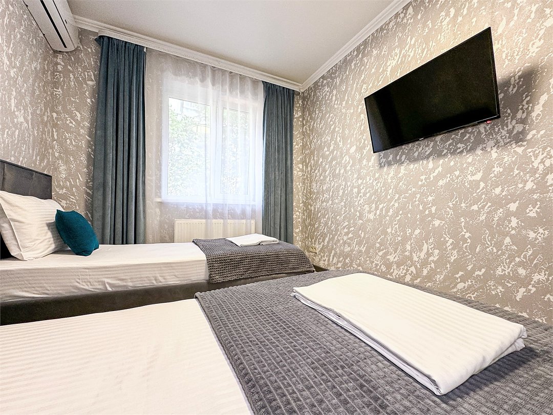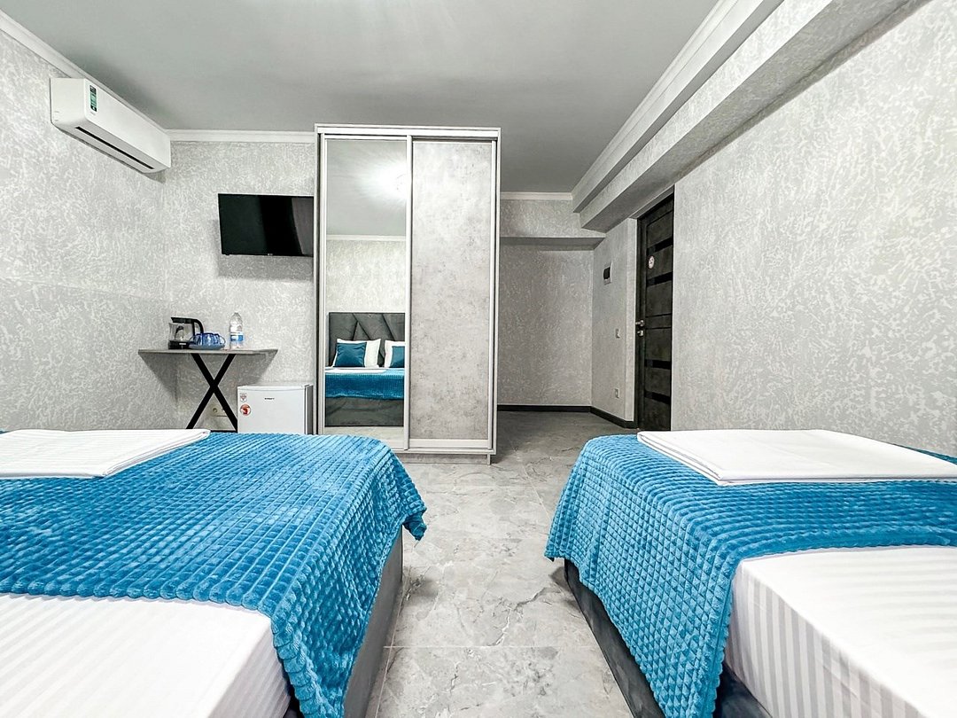 Номер со всеми необходимыми удобствами. Две односпальные кровати, шкаф с зеркалом в полный рост, кондиционер, плазменный большой телевизор, туалетная комната со своим душем и туалетом. В номере так же есть чайник, холодильник, небольшой набор посуды, фен, сейф. Банные полотенца и косметические средства, ложка для обуви. При желании можно добавить доп. место (или детскую кроватку) для одного ребёнка, это будет самый бюджетный вариант, чтобы разместиться небольшой семьей 2+1.