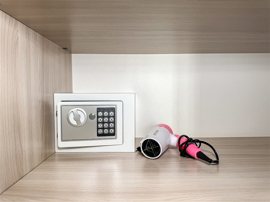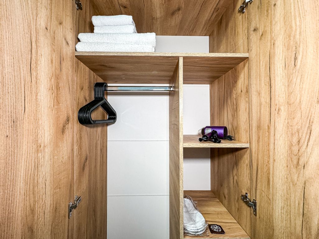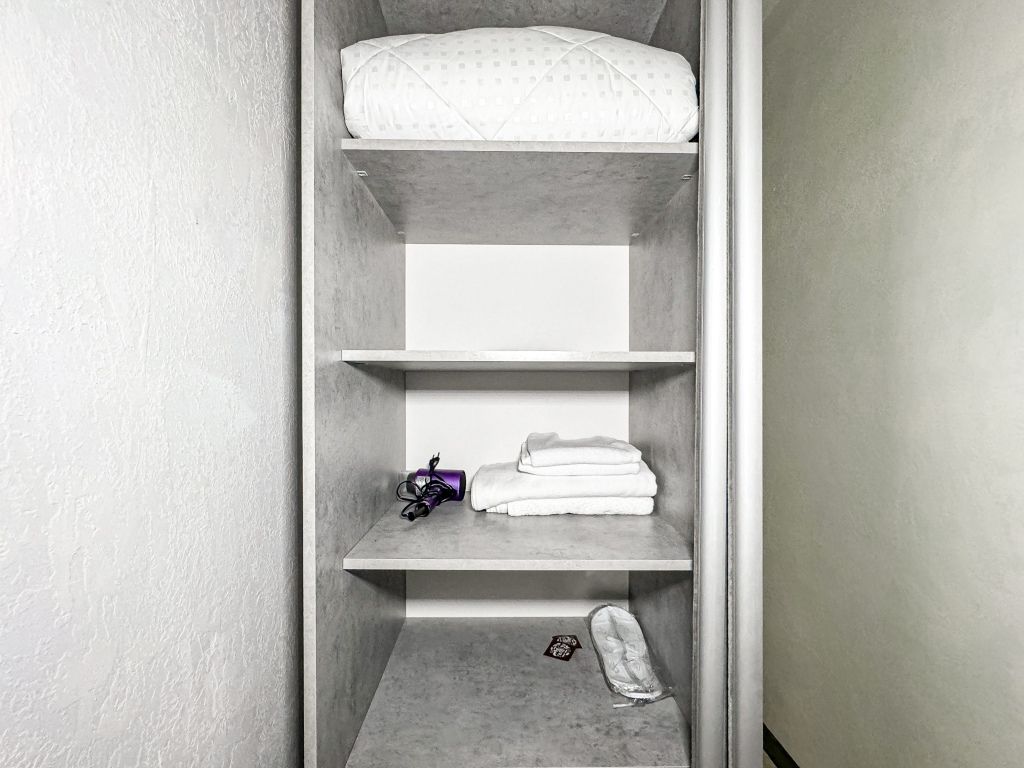 Две полноценно отдельные спальни, свой душ и туалет, кондиционер, телевизор в каждой спальне. Холодильник, чайник, небольшой набор посуды, стол, стулья, шкаф, фен, сейф. На окнах шторы плиссе, чтобы закрыть окно от солнечного света, каждое мансардное окно затонировано, так что комната от солнца не нагревается.