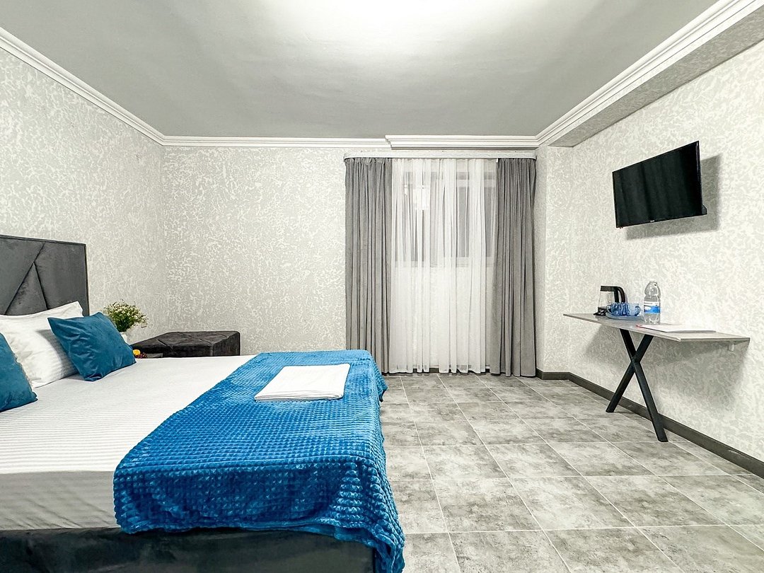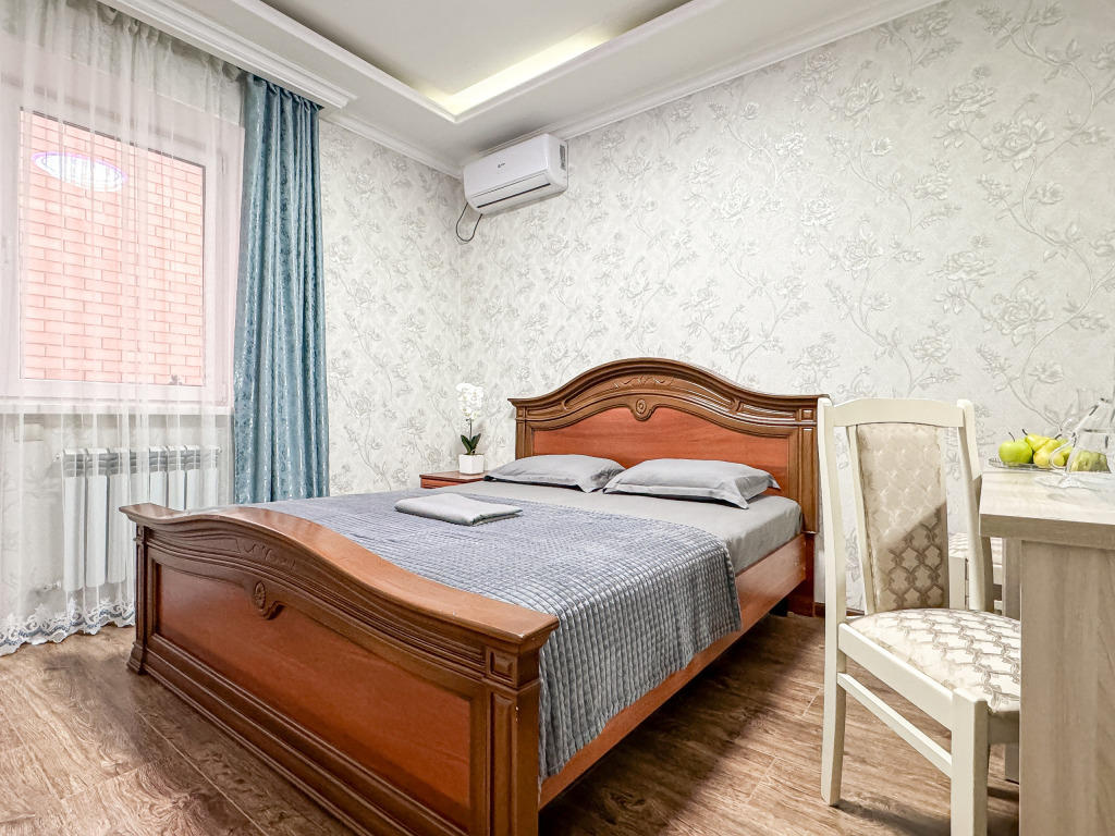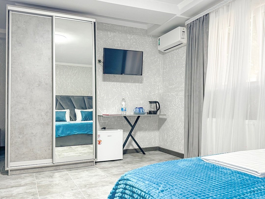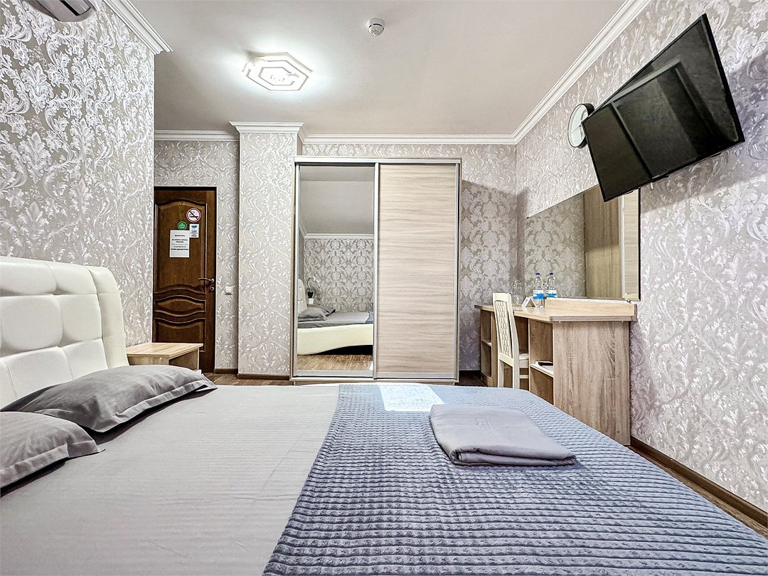 кондиционер, фен, двуспальная кровать, письменный стол, зеркало, набор посуды, сейф, чайник, отопление, душ, вид во двор, стул, туалетные средства, туалет, сушилка для белья, телевизор с плоским экраном, мини-холодильник, шкаф-купе, номер для некурящих, можно с питомцамиВ гостиничном номере