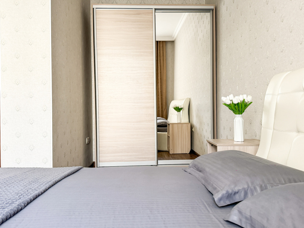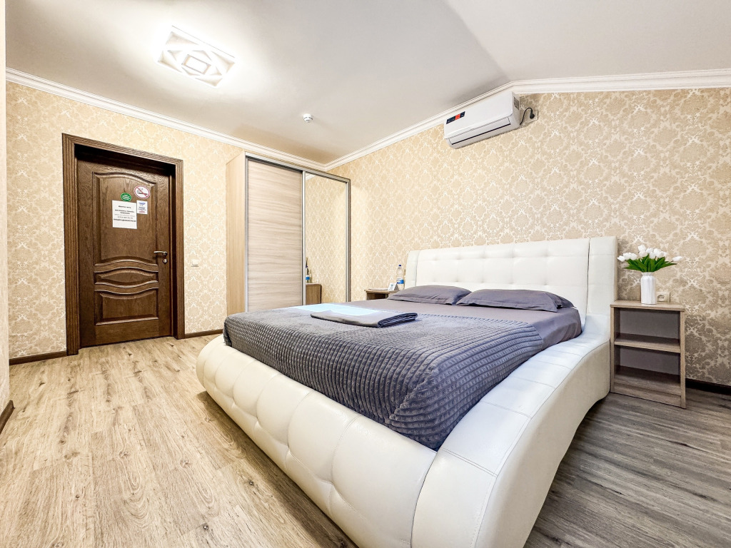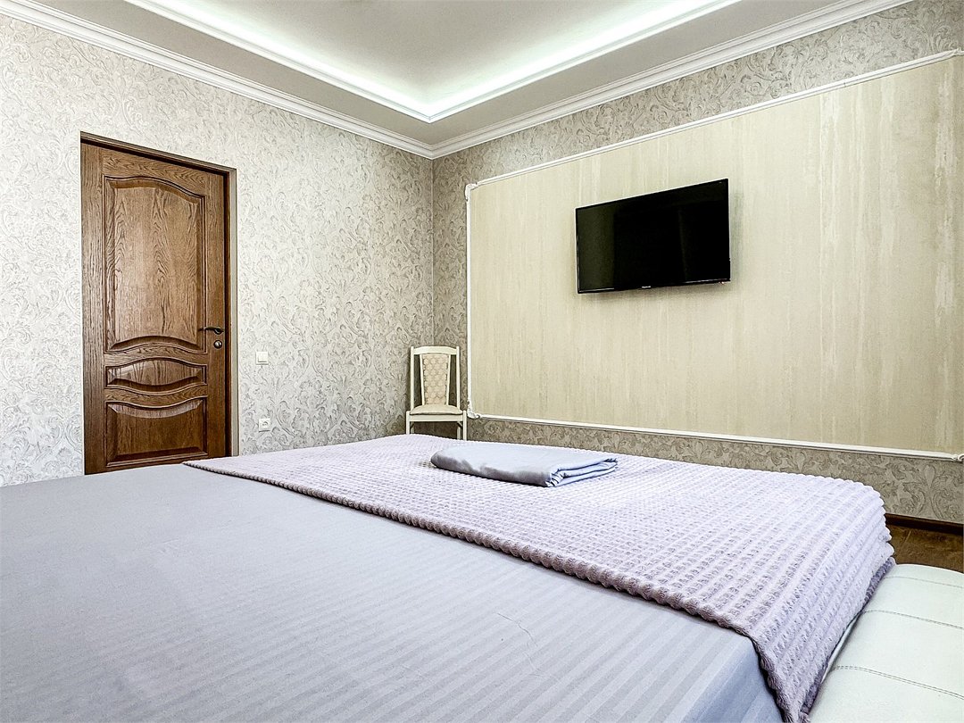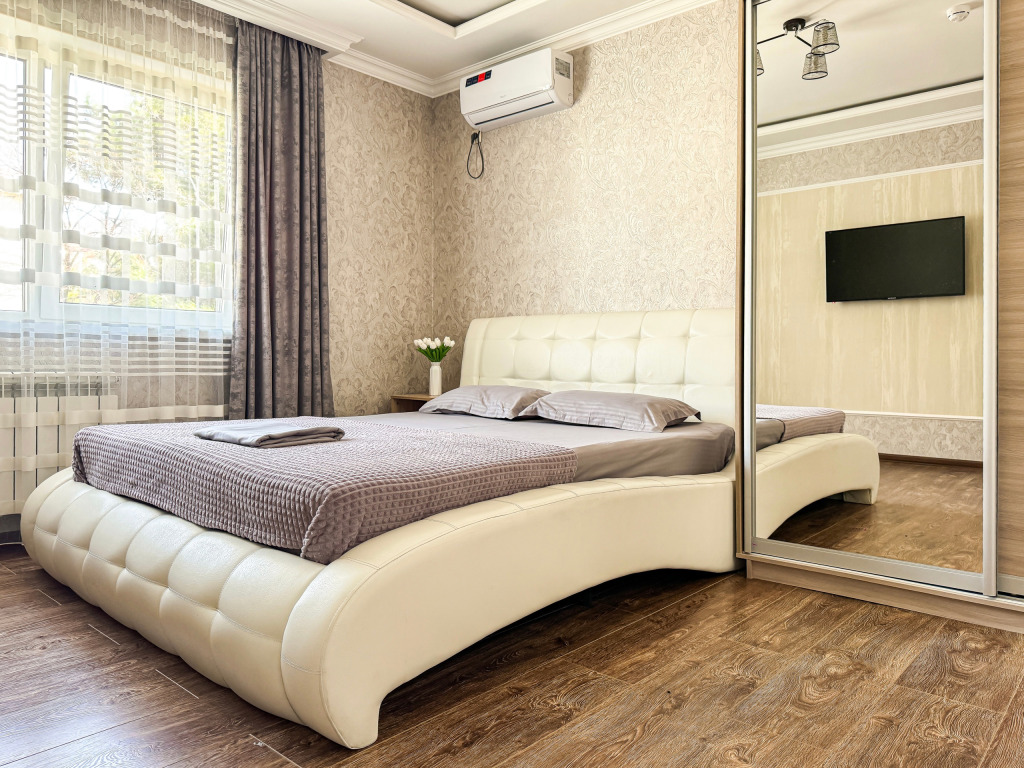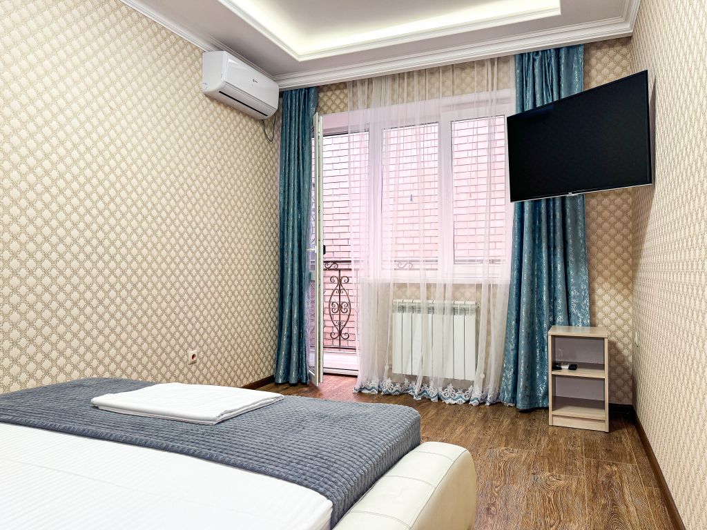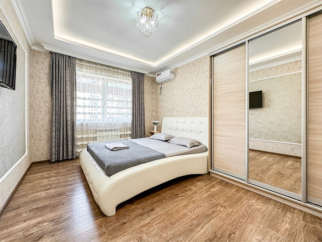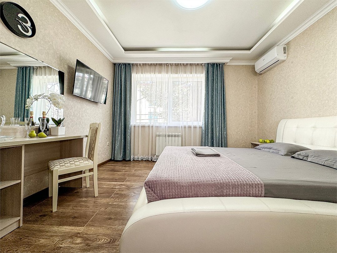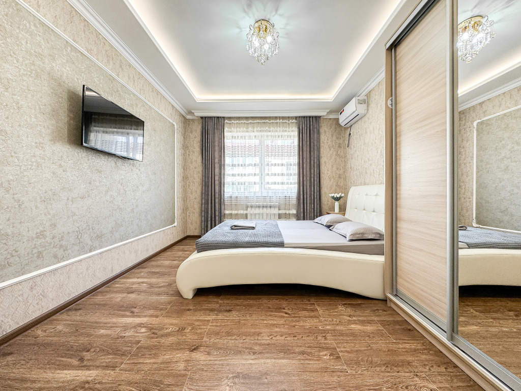Wi-Fi, холодильник, кондиционер, светильник, фен, санузел, банные полотенца, тапочки, гигиенические средства, балкон, балкон с красивым видом, две двуспальные кровати, стулья, шкаф для одежды, вешалки, письменный стол, зеркало, две комнаты, сейф, чайник, раковина, душ, вид на город, паркет, кухонная посуда, стол, сушилка для белья, телевизор с плоским экраном, шкаф-купе, морозильная камера, вешалки-плечики, мыло, затемняющая штора, зеркало в полный рост, дождевой и ручной душ, можно с питомцамиВ гостиничном номере