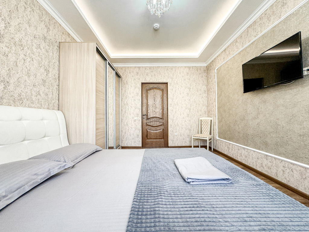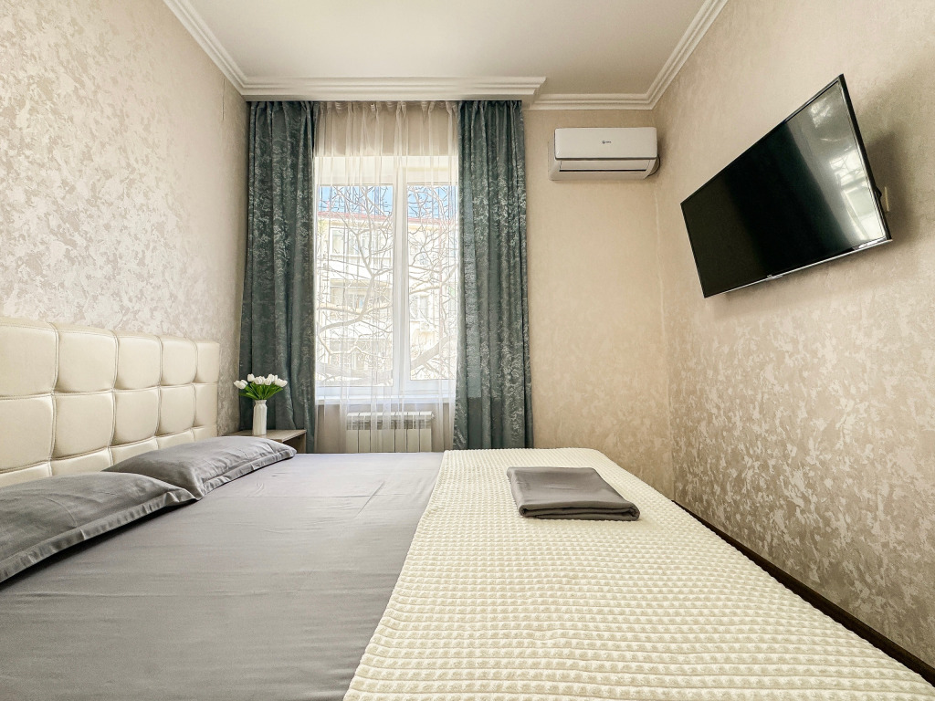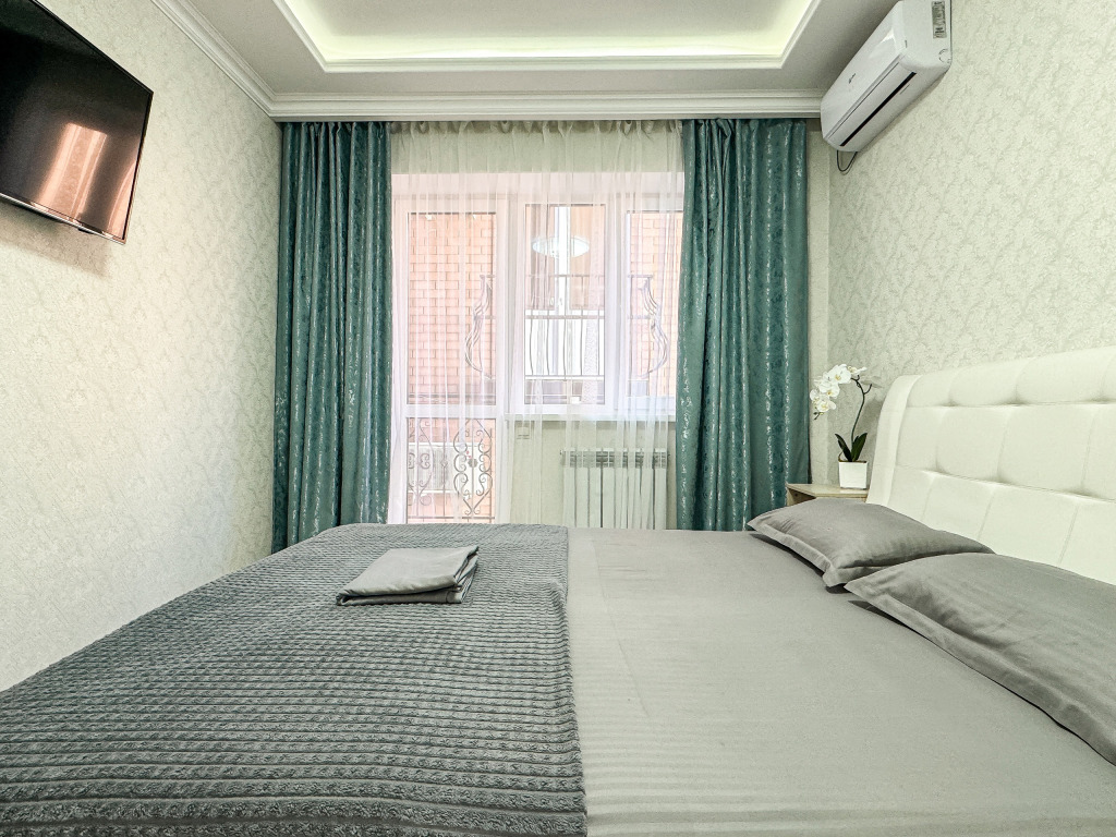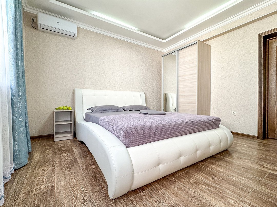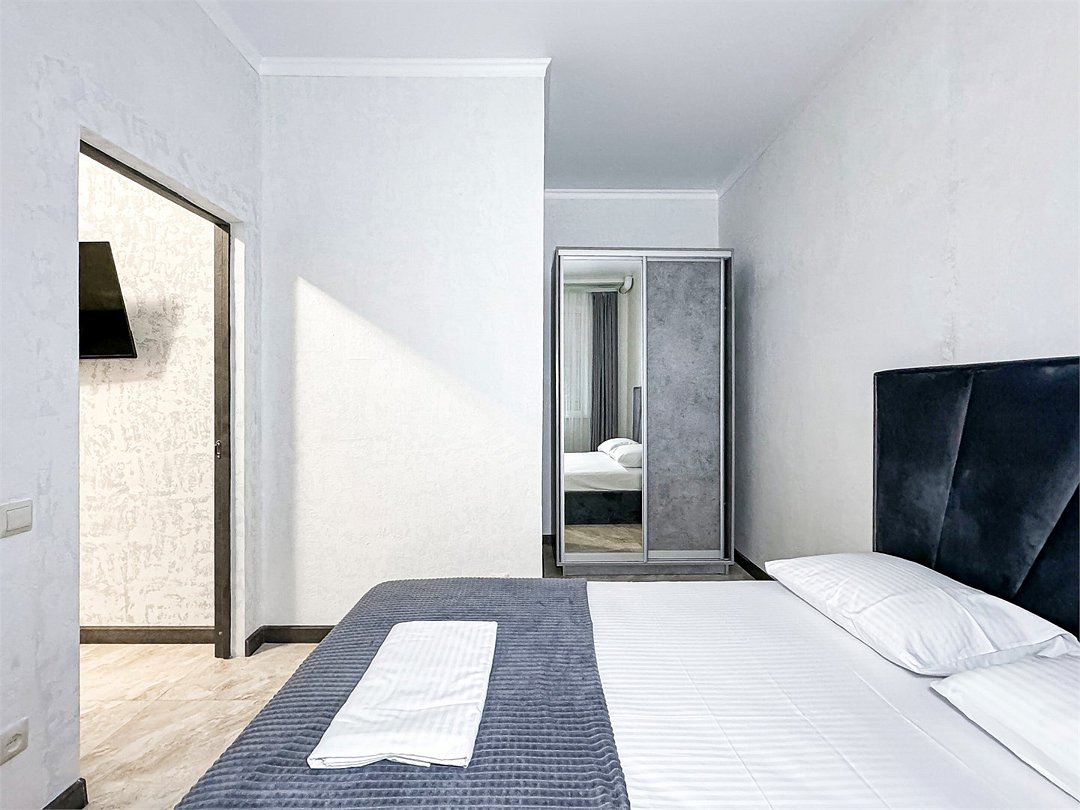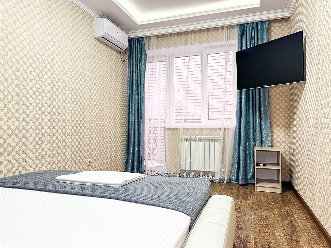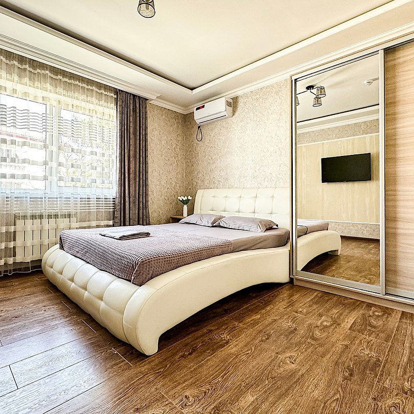Wi-Fi, холодильник, кондиционер, светильник, фен, санузел, банные полотенца, тапочки, гигиенические средства, балкон, балкон с красивым видом, две двуспальные кровати, стулья, шкаф для одежды, вешалки, письменный стол, зеркало, две комнаты, сейф, чайник, раковина, душ, вид на город, паркет, кухонная посуда, стол, сушилка для белья, телевизор с плоским экраном, шкаф-купе, морозильная камера, вешалки-плечики, мыло, затемняющая штора, зеркало в полный рост, дождевой и ручной душ, можно с питомцамиВ гостиничном номере