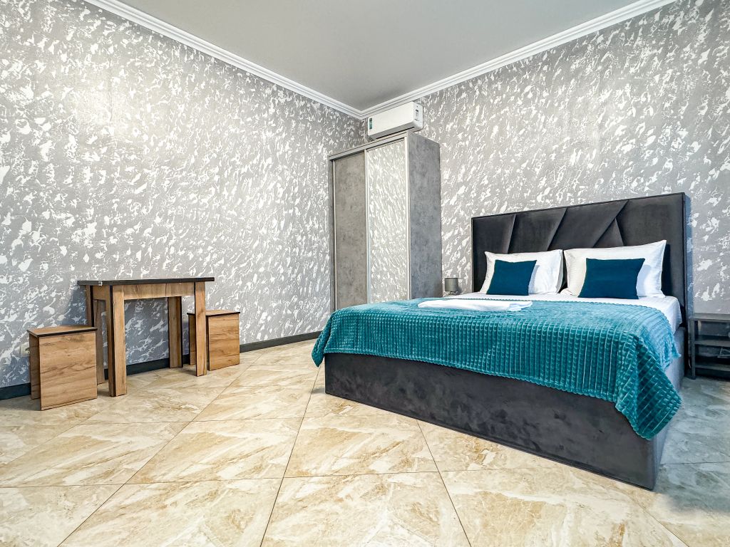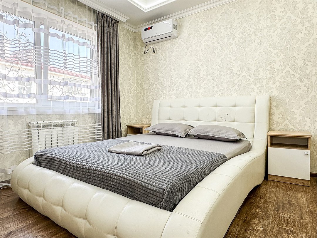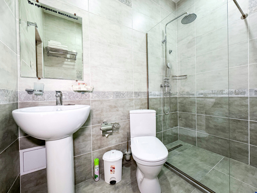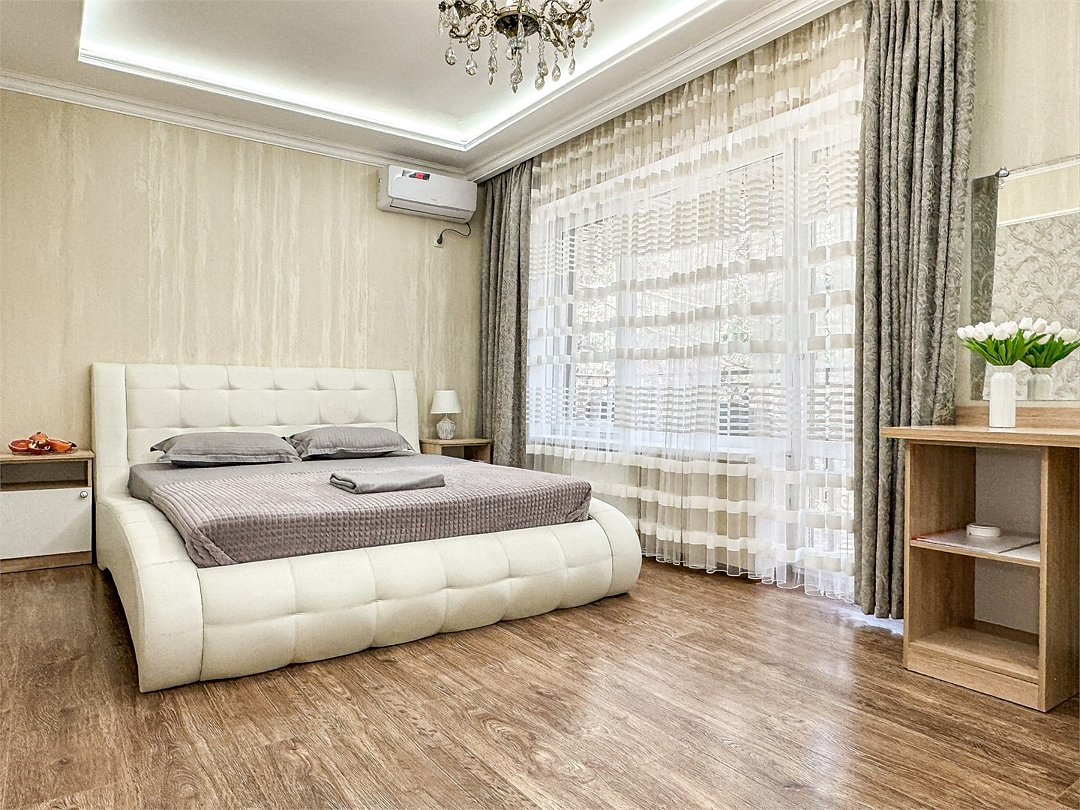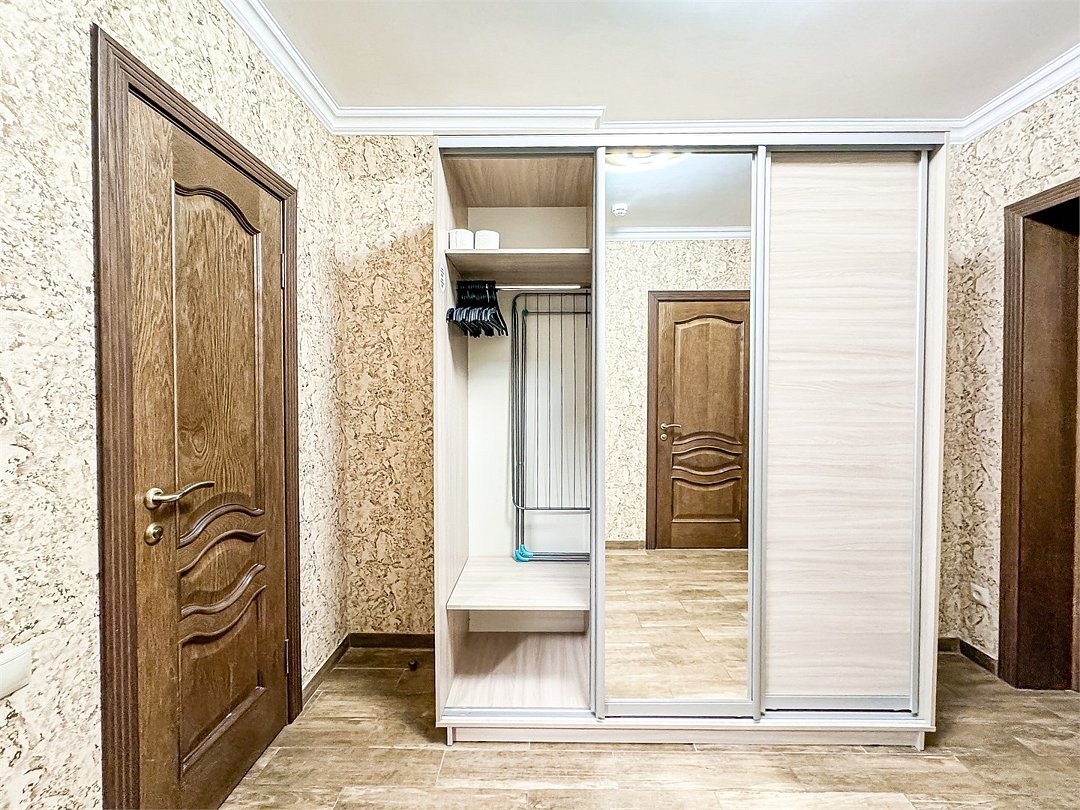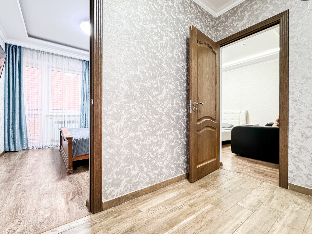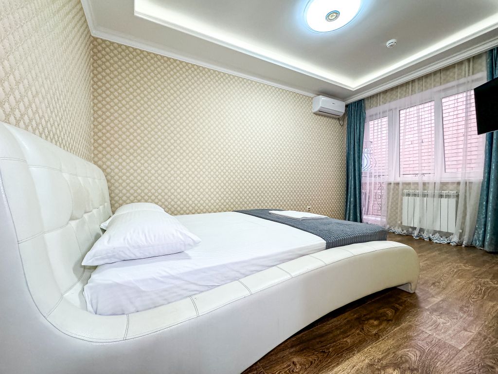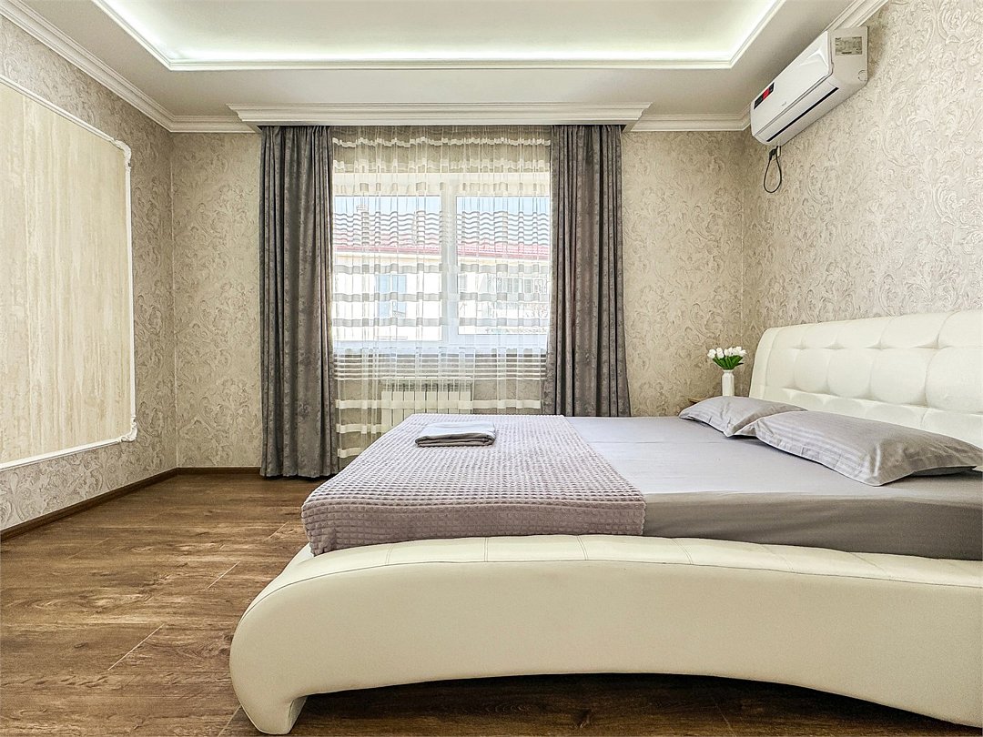 Wi-Fi, холодильник, кондиционер, светильник, фен, санузел, банные полотенца, тапочки, гигиенические средства, балкон, балкон с красивым видом, две двуспальные кровати, стулья, шкаф для одежды, вешалки, письменный стол, зеркало, две комнаты, сейф, чайник, раковина, душ, вид на город, паркет, кухонная посуда, стол, сушилка для белья, телевизор с плоским экраном, шкаф-купе, морозильная камера, вешалки-плечики, мыло, затемняющая штора, зеркало в полный рост, дождевой и ручной душ, можно с питомцамиВ гостиничном номере