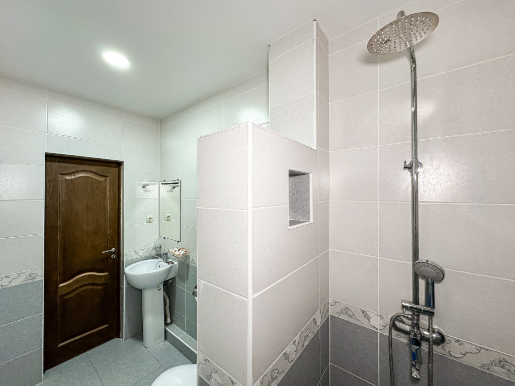 Корпус отеля – это отдельно стоящее здание на 18 номеров разной вместимостью от 2 до 6 гостей. В каждом номере имеется кондиционер, душ, туалет, балкон (не во всех), телевизор, холодильник, чайник, чашки – обязательные удобства в каждом номере. 10 из 18 номеров – двухкомнатные. Имеется оборудованная кухня, доступ дается индивидуально.