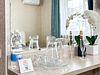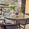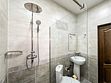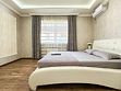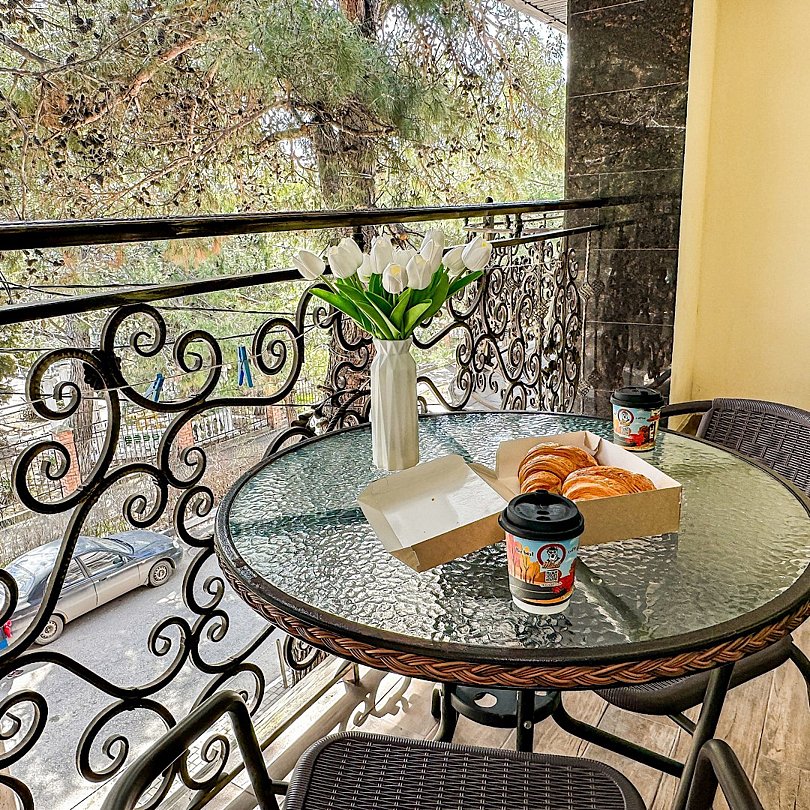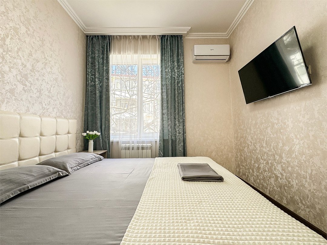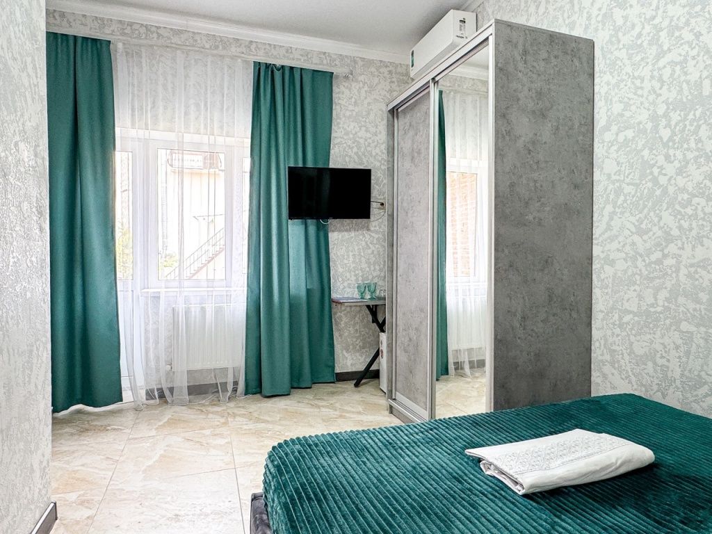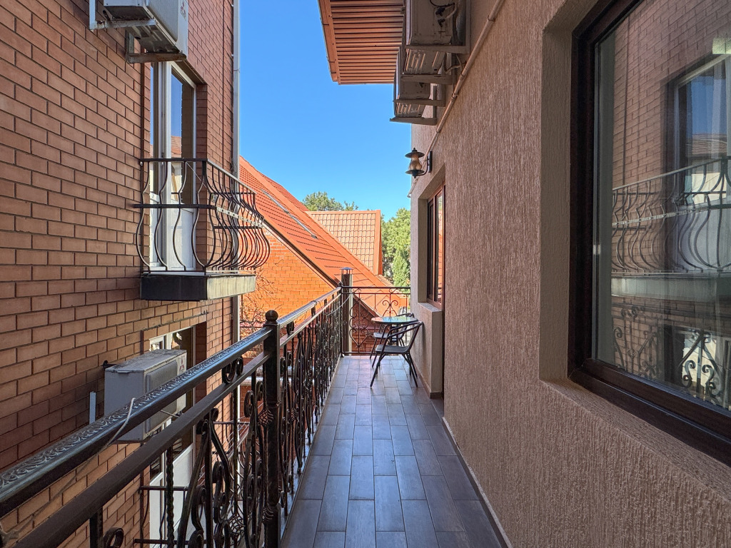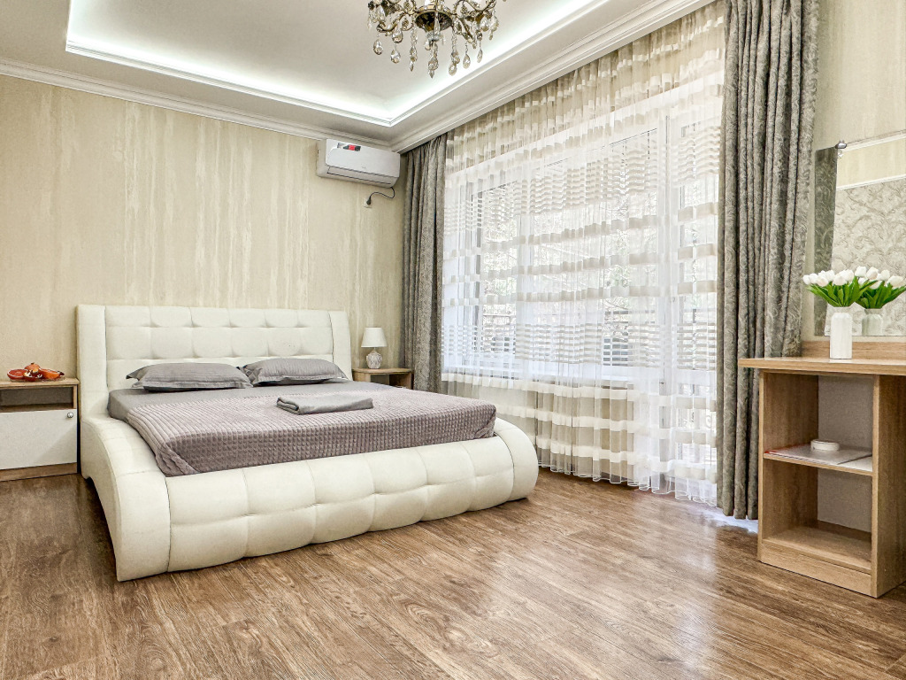 В обеих спальнях номера свой кондиционер и большой плазменный телевизор, свой душ и туалет. Также шкаф-купе с зеркалом в полный рост, фен, холодильник, чайник, небольшой набор посуды, стол, стулья. Вид в зеленый двор.