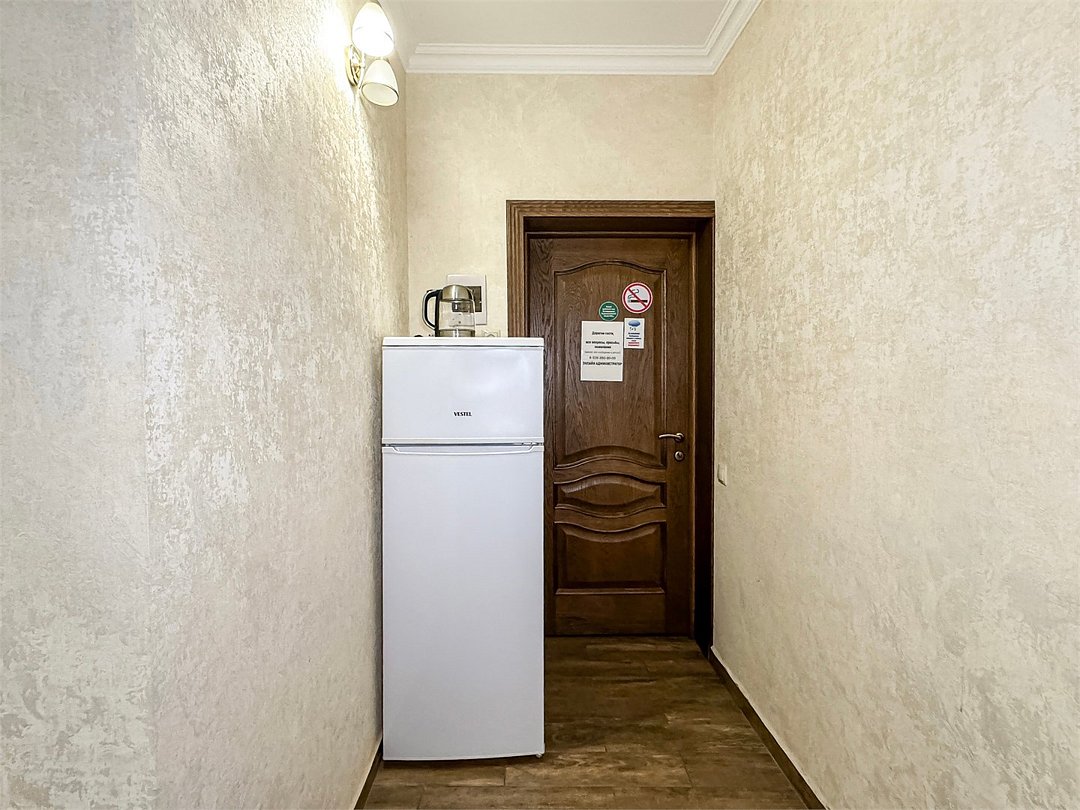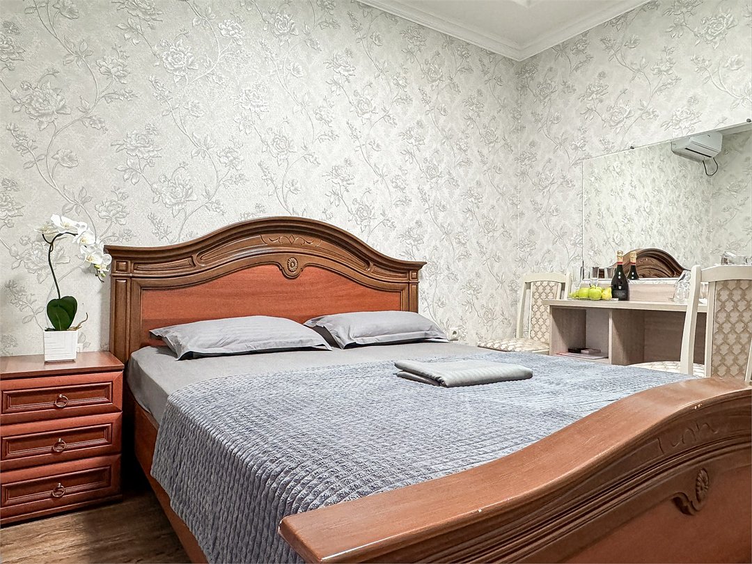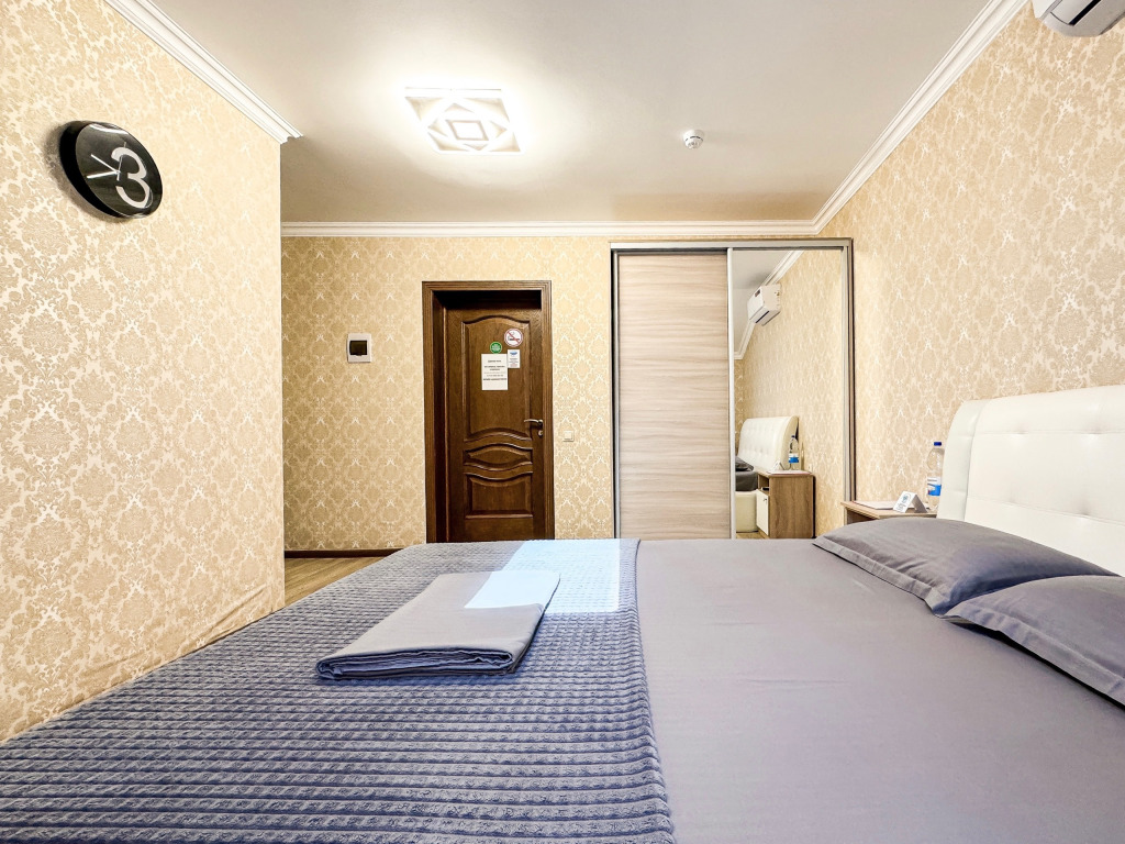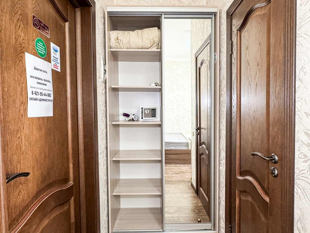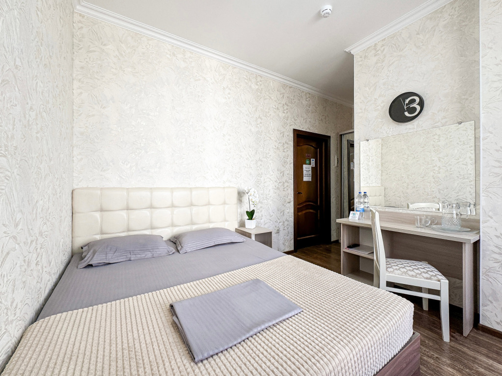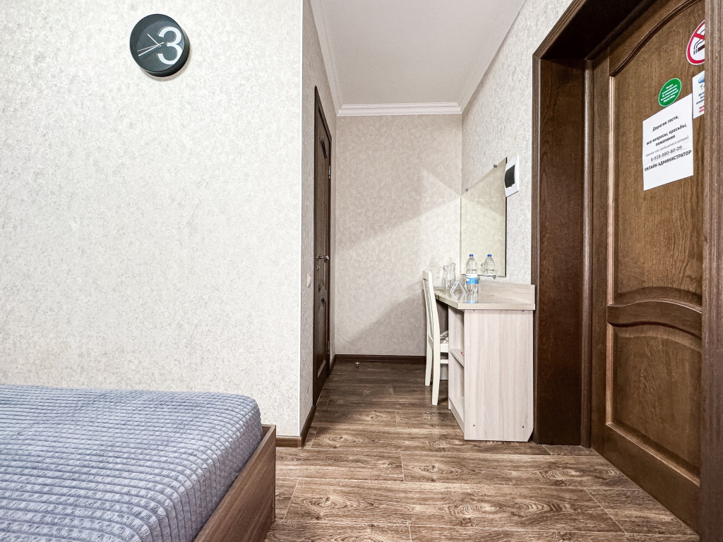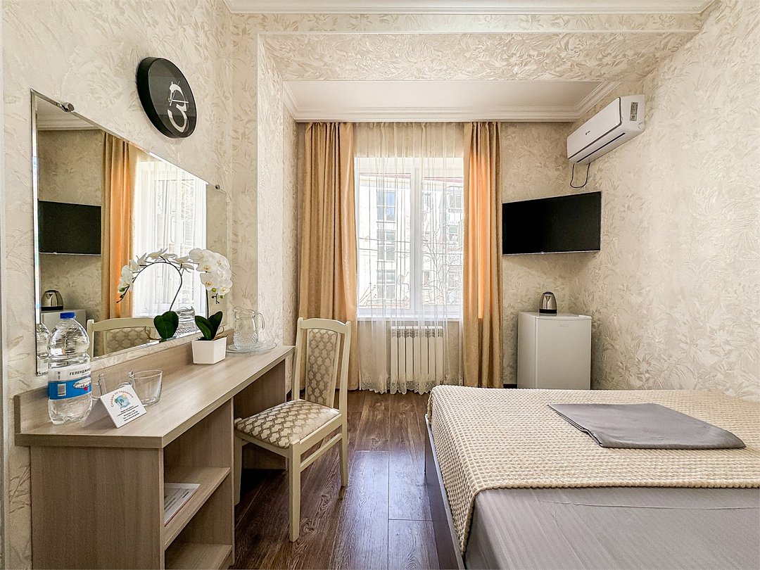 Двухместный стандартный номер - 18-20 кв м Однокомнатный номер для двоих со всеми необходимыми удобствами. Широкая двуспальная кровать, шкаф с зеркалом в полный рост, стол, стул, кондиционер, плазменный большой телевизор, туалетная комната со своим душем и туалетом. В номере так же есть чайник, холодильник, небольшой набор посуды, фен, сейф. Банные полотенца и косметические средства, ложка для обуви. Таких номеров у нас всего 3. Только один из них имеет балкон, который смотрит на соседнее здание. Это #8. Запрашивайте этот номер при бронировании, если Вам нужен принципиально балкон Запросите видеообзор своего номера при бронировании +7-921-55-44-982Услуги и удобства