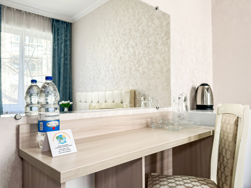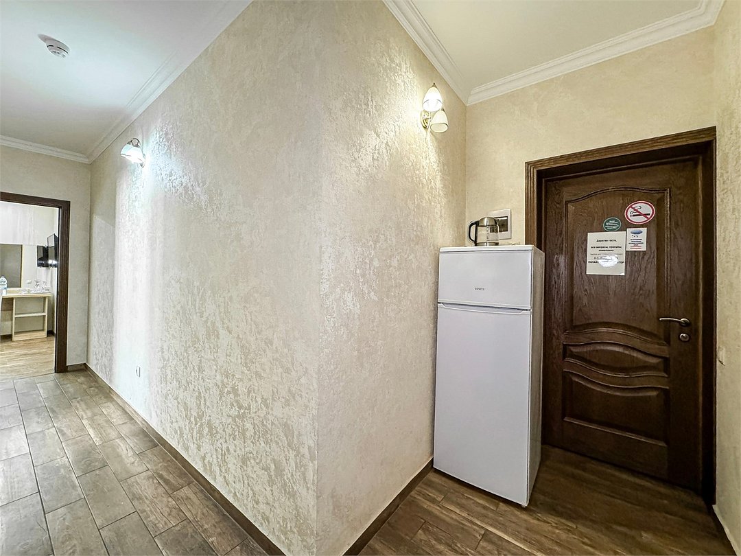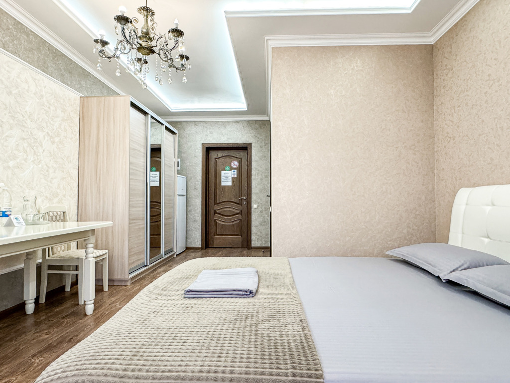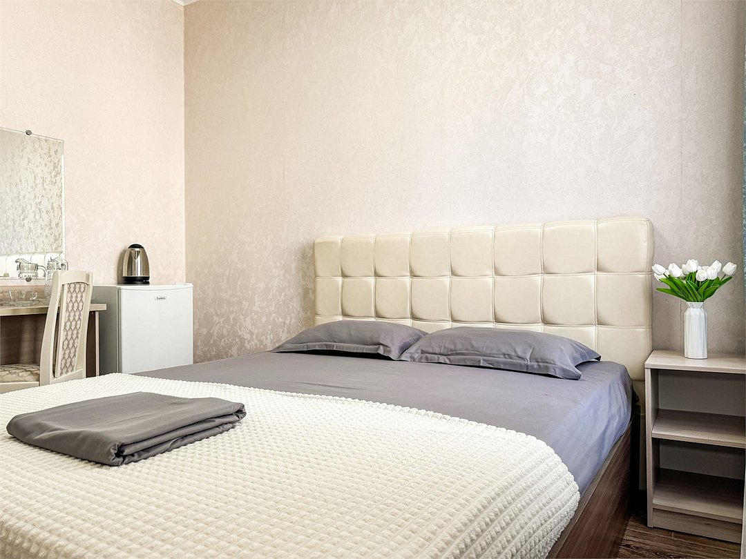 Улучшенный однокомнатный номер для двоих 20-22 кв.м. Номер больше площади, чем стандартные двухместные номера. В номере большое светлое окно с видом в зеленый двор. Номер со всеми необходимыми удобствами. Широкая двуспальная кровать. На кровати дополнительно удобный высокий топпер, улучшающий комфорт матраса. Так же шкаф с зеркалом в полный рост, стол, стул, кондиционер, плазменный большой телевизор, туалетная комната со своим душем и туалетом. Имеется чайник, холодильник, небольшой набор посуды, фен, сейф. Банные полотенца и косметические средства, ложка для обуви. При желании (!!!) можно поставить доп место или детскую кроватку, для размещения семьи с одним ребёнком. В 2024 добавлены несколько номеров улучшенной категории (построены 2024. Актуальные фото будут в мае 2024) Запросите видеообзор своего номера при бронировании +7-921-55-44-982Услуги и удобства