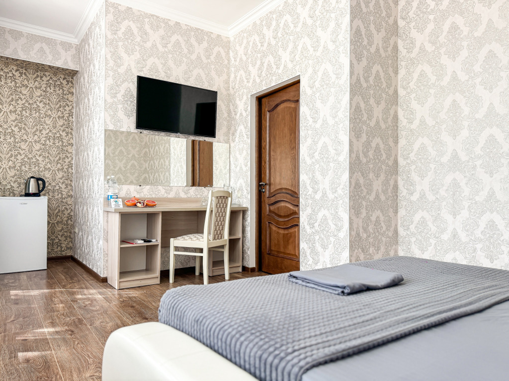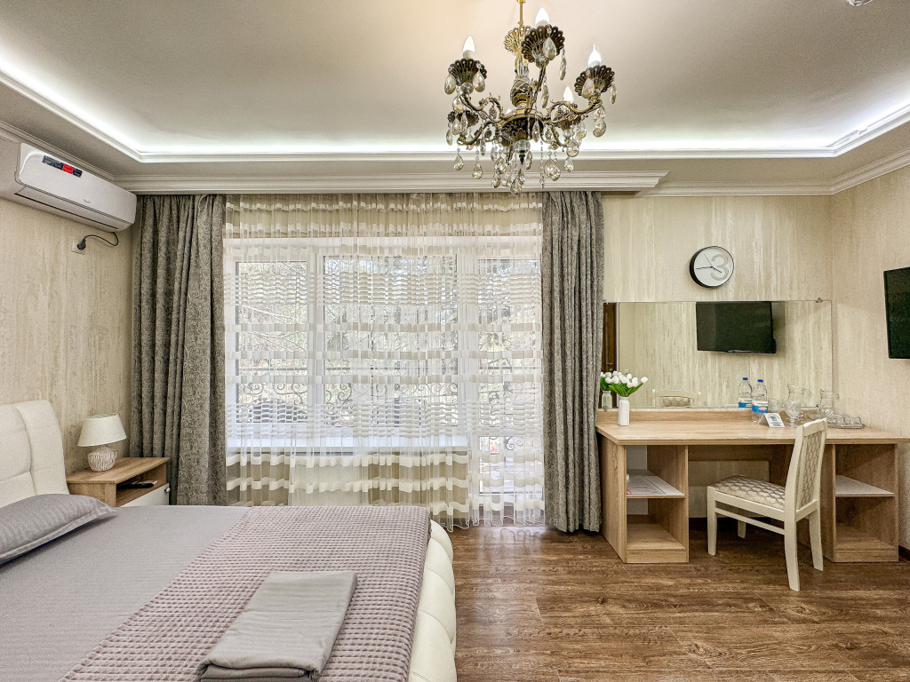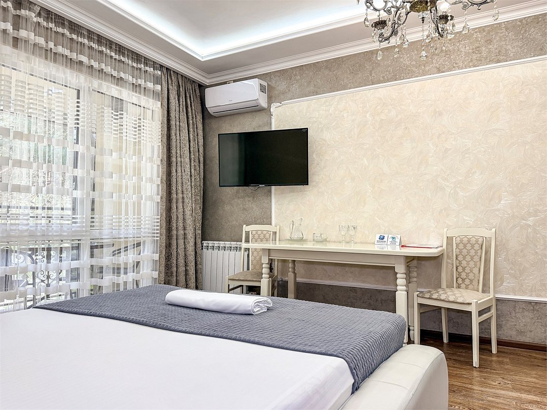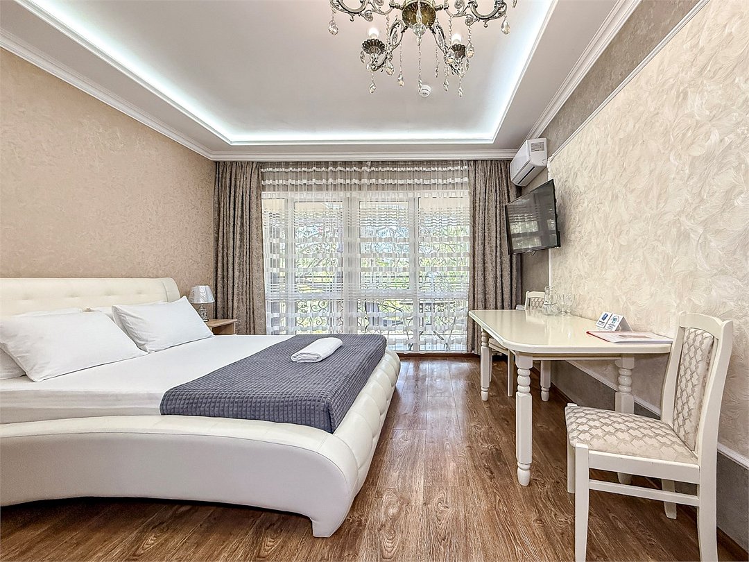 Wi-Fi, холодильник, кондиционер, светильник, фен, банные полотенца, тапочки, гигиенические средства, косметические средства, балкон, балкон с красивым видом, двуспальная кровать, кресла, тумбы, письменный стол, эксклюзивная мебель, набор посуды, сейф, чайник, унитаз, раковина, душ, паркет, стаканы, кофейный столик, стул, туалетные средства, туалет, сушилка для белья, телевизор с плоским экраном, шкаф-купе, мыло, дождевой и ручной душ, можно с питомцамиВ гостиничном номере