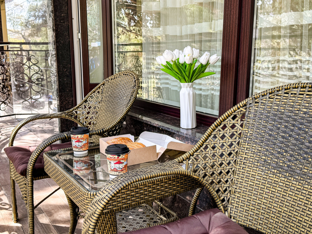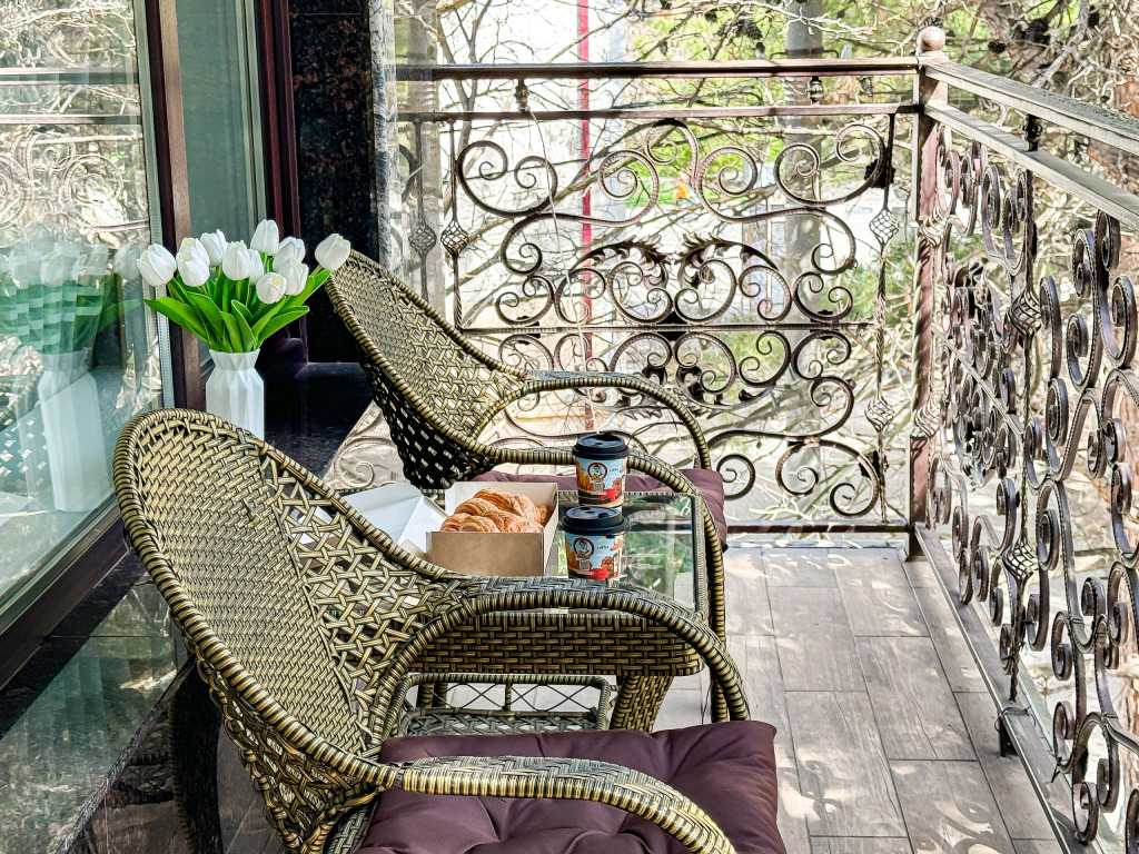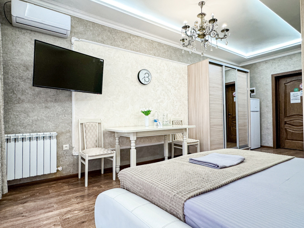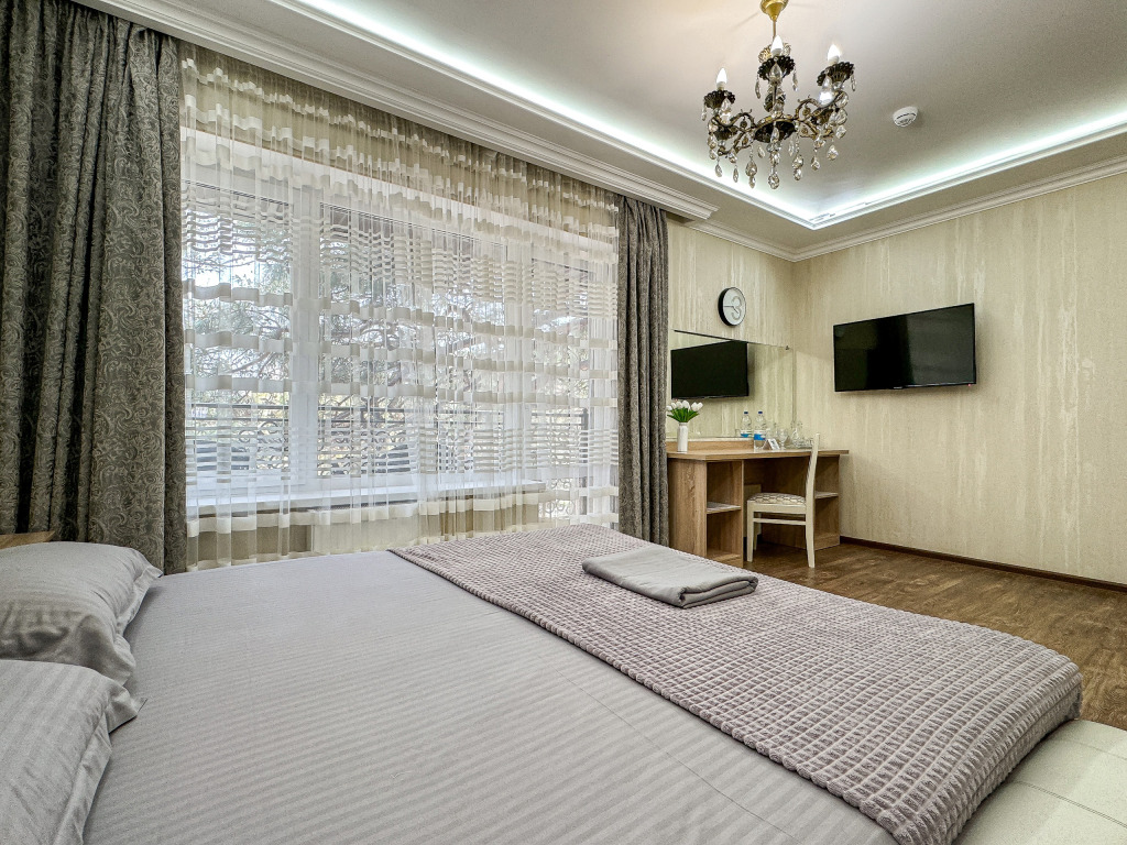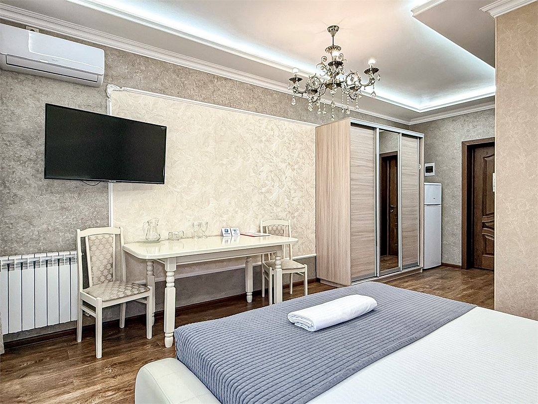 Wi-Fi, холодильник, кондиционер, светильник, фен, банные полотенца, тапочки, гигиенические средства, косметические средства, балкон, балкон с красивым видом, двуспальная кровать, кресла, тумбы, письменный стол, эксклюзивная мебель, набор посуды, сейф, чайник, унитаз, раковина, душ, паркет, стаканы, кофейный столик, стул, туалетные средства, туалет, сушилка для белья, телевизор с плоским экраном, шкаф-купе, мыло, дождевой и ручной душ, можно с питомцамиВ гостиничном номере