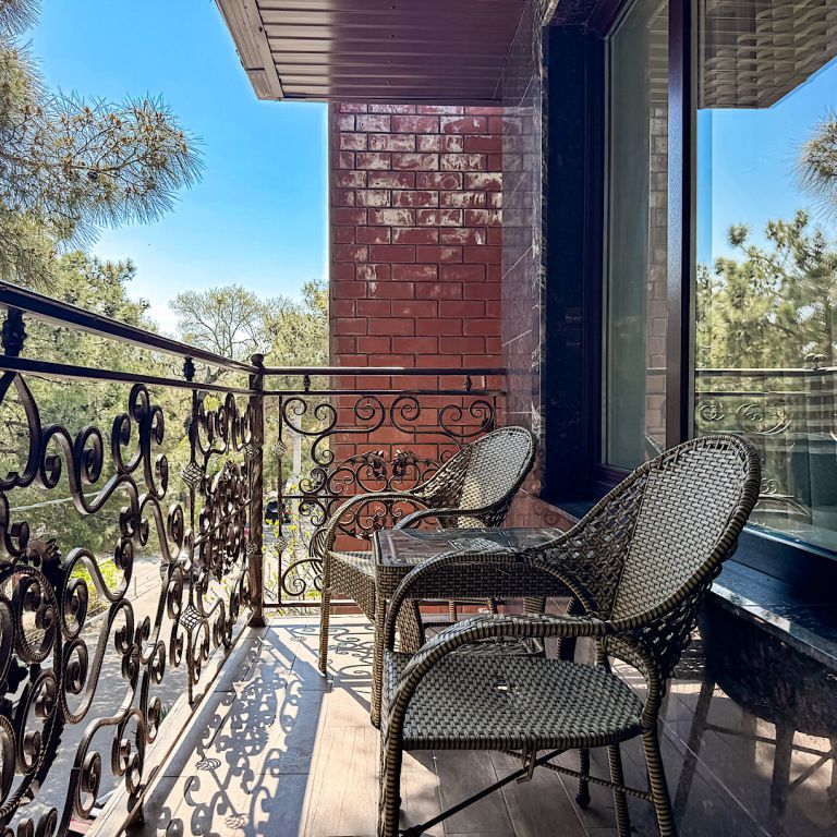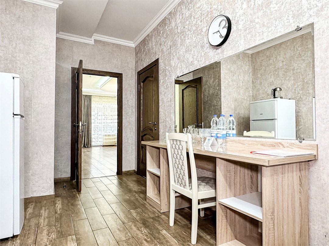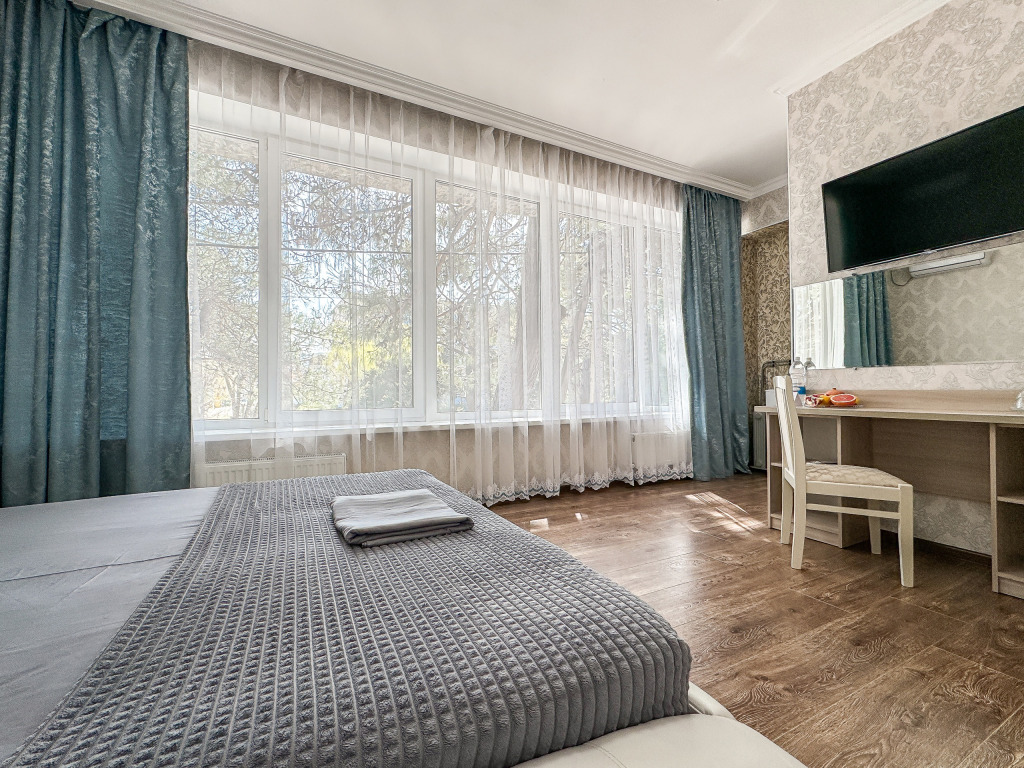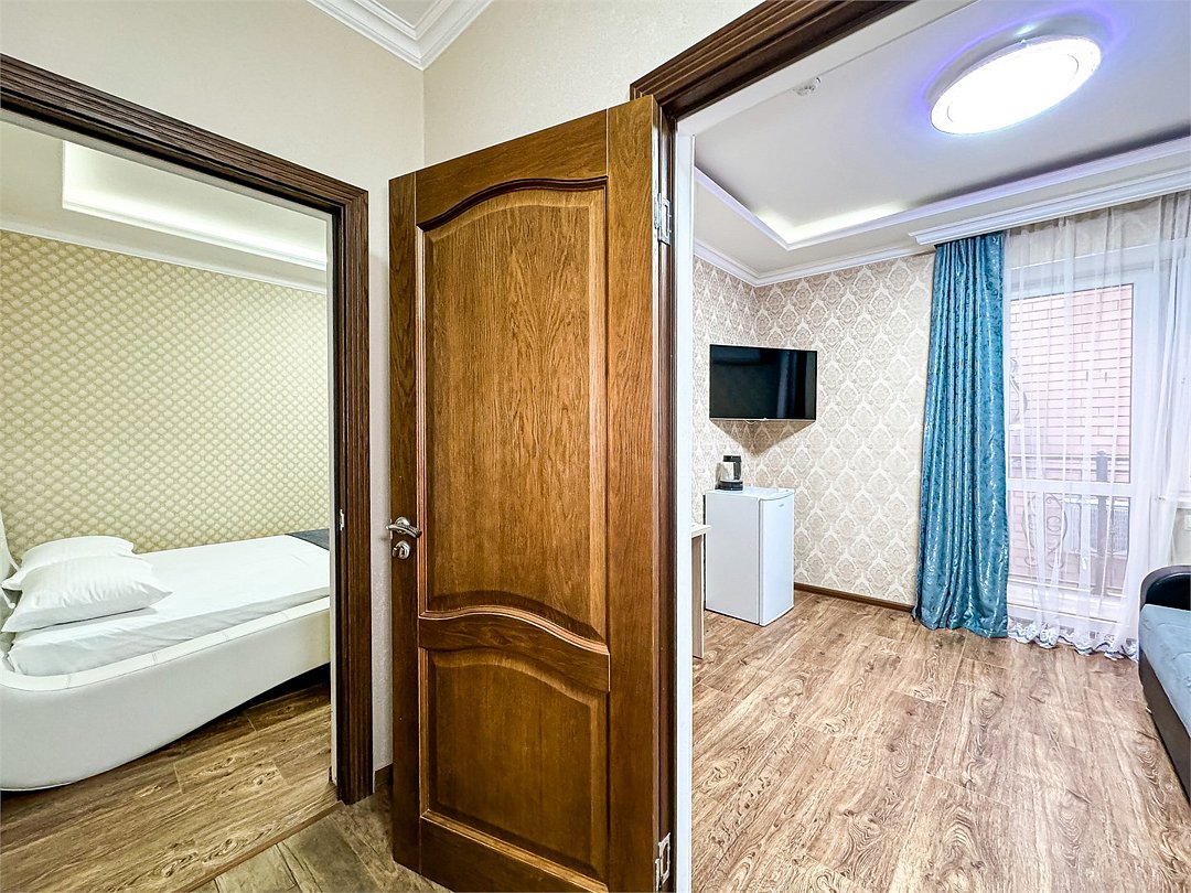 Большой балкон на зелёные сосны – изюминка этого номера, огромная площадь – комфорт для большой семьи или компании. Полноценные 2 отдельные спальни с двуспальными кроватями, кондиционер и большой телевизор в каждой, прихожая, большой стол, стулья, фен, сейф, холодильник, чайник. Большой гардеробный шкаф с зеркалом в полный рост. Душ, туалет.