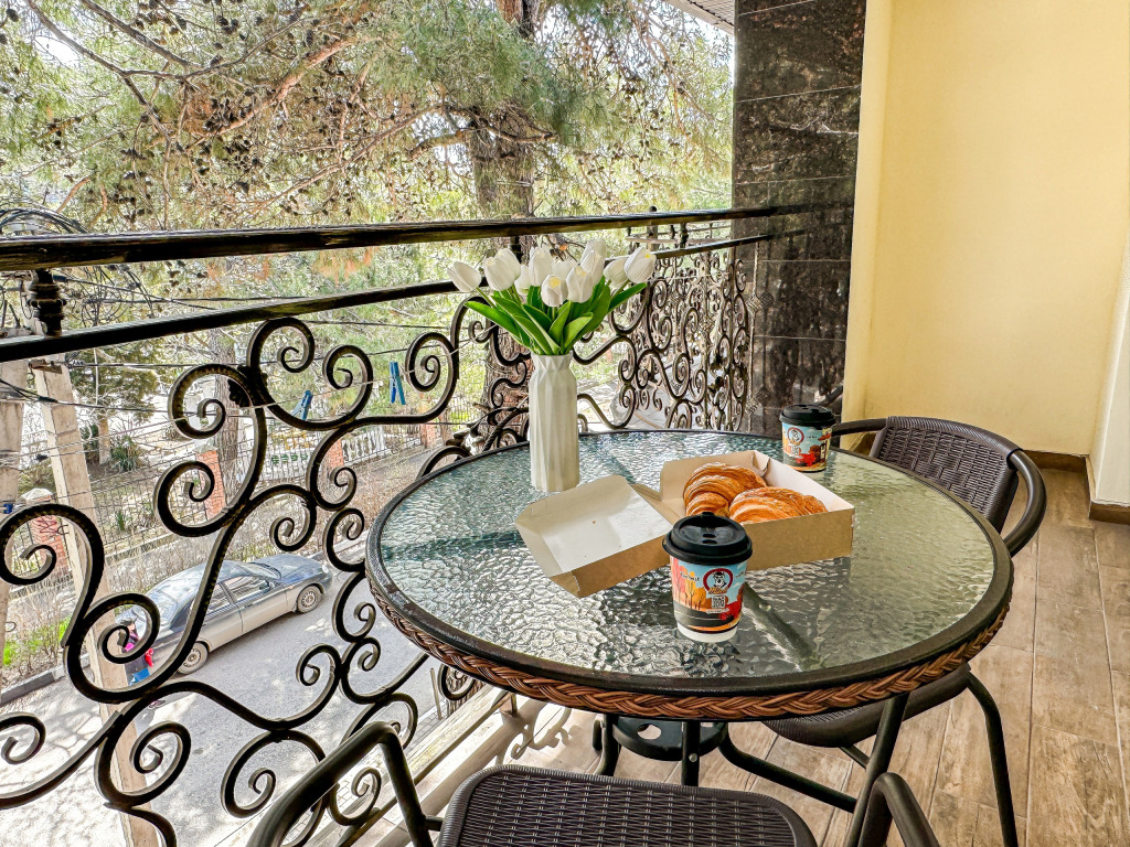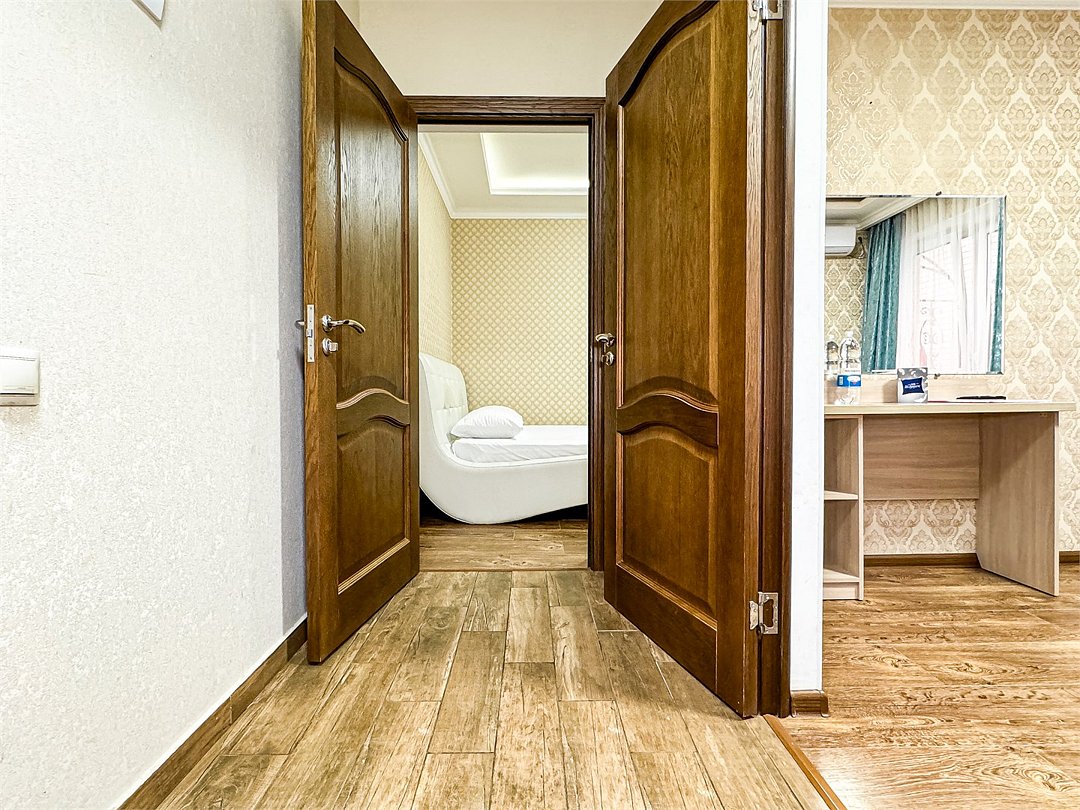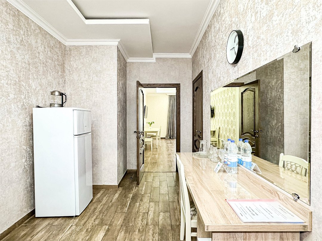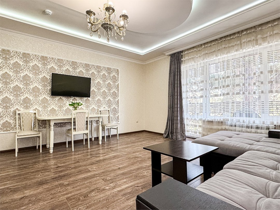 Большой балкон на зелёные сосны – изюминка этого номера, огромная площадь – комфорт для большой семьи или компании. Полноценные 2 отдельные спальни с двуспальными кроватями, кондиционер и большой телевизор в каждой, прихожая, большой стол, стулья, фен, сейф, холодильник, чайник. Большой гардеробный шкаф с зеркалом в полный рост. Душ, туалет.