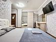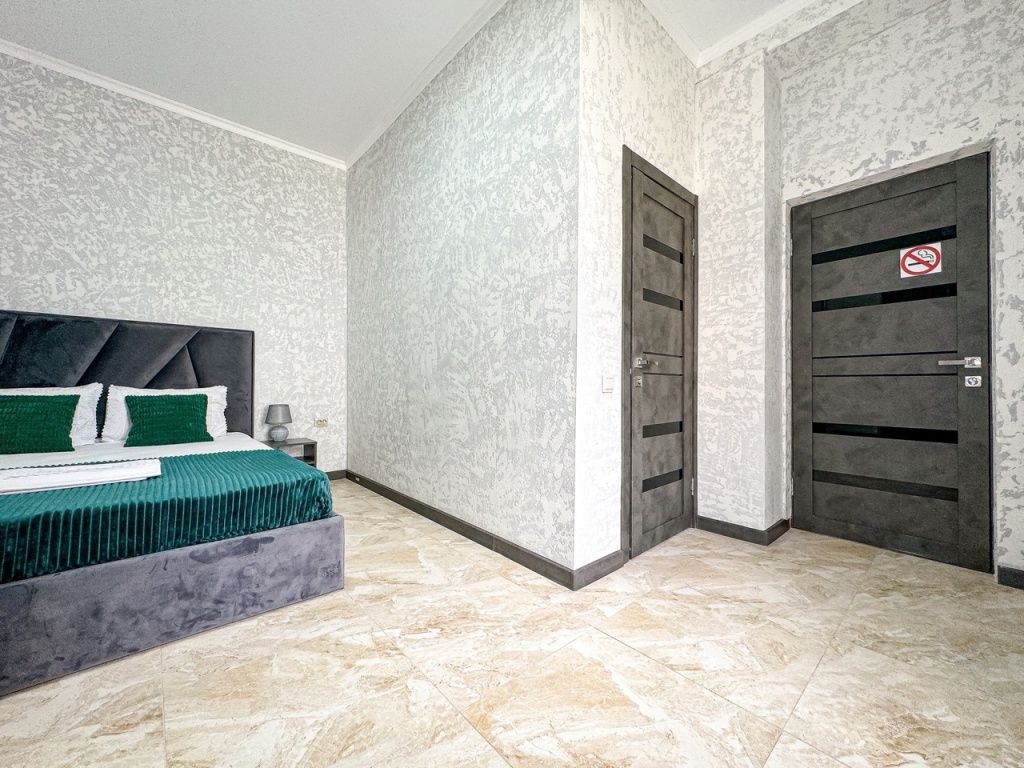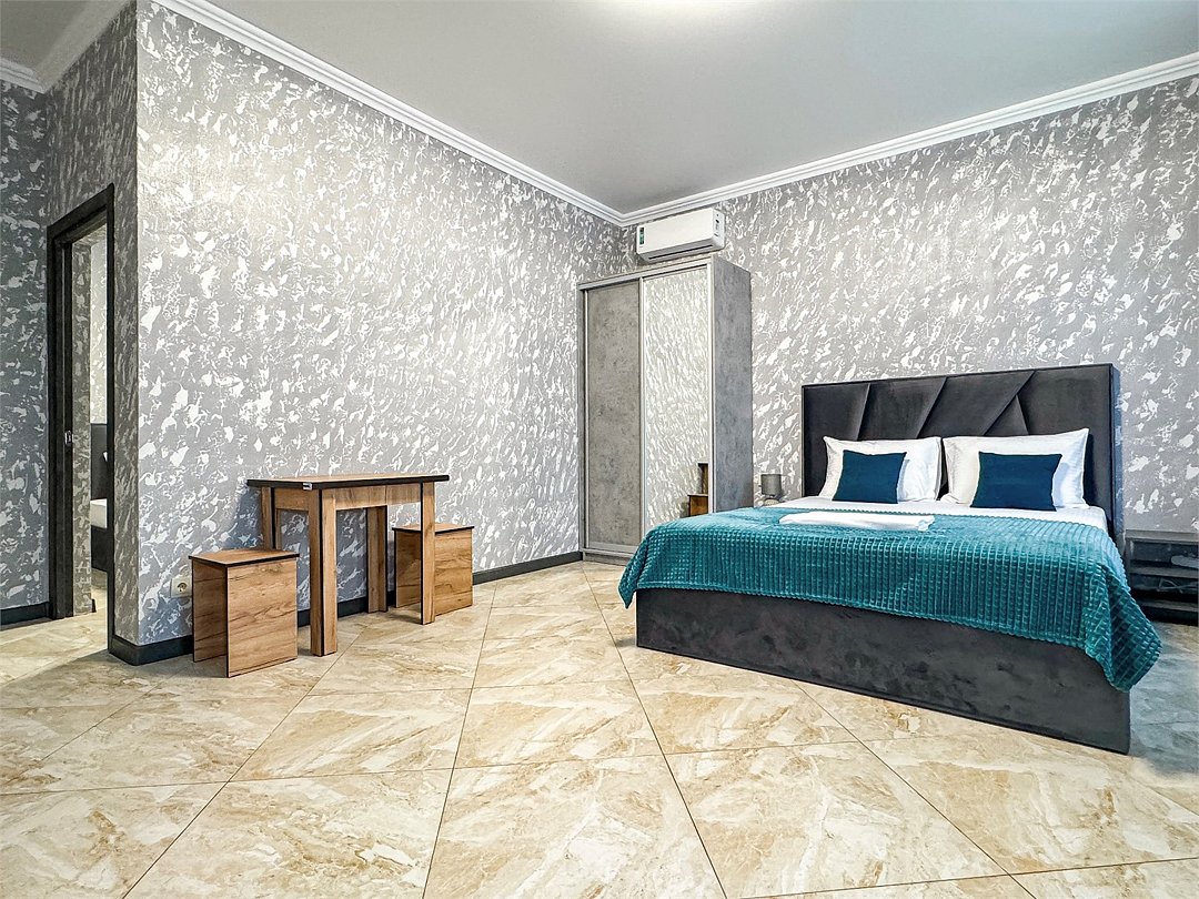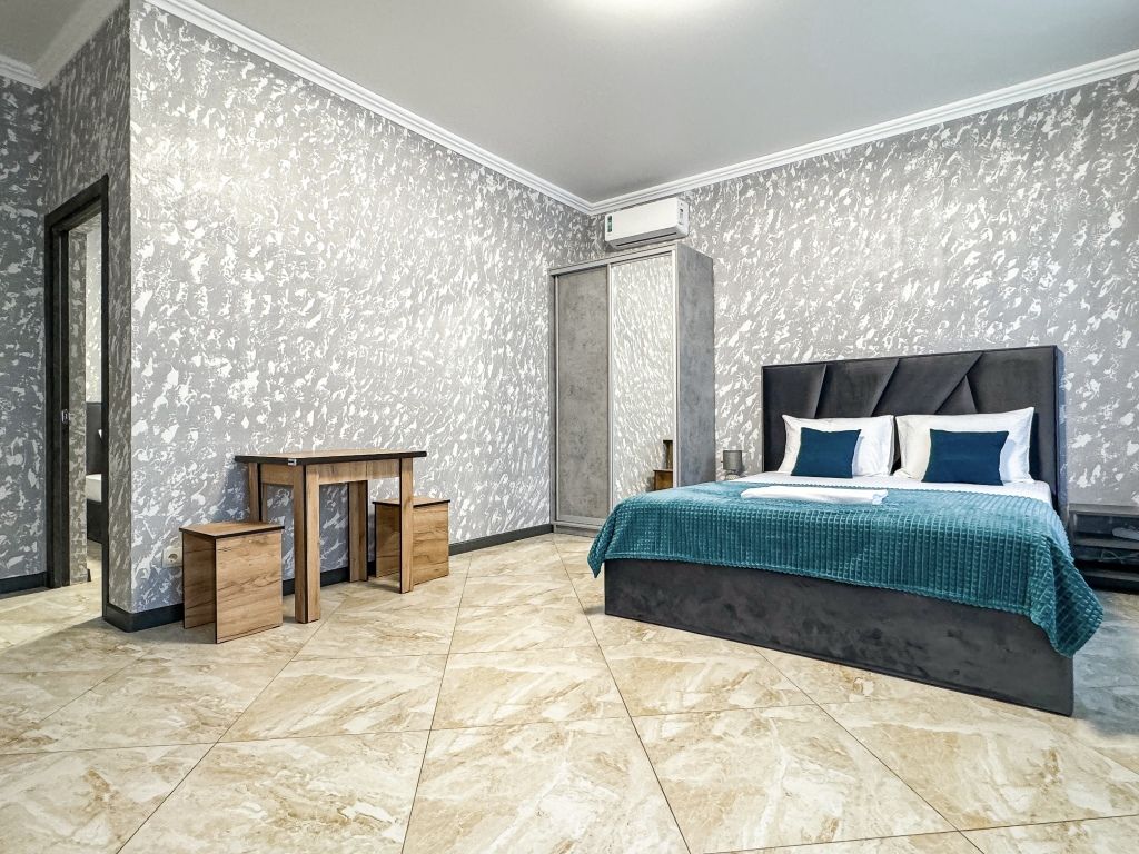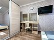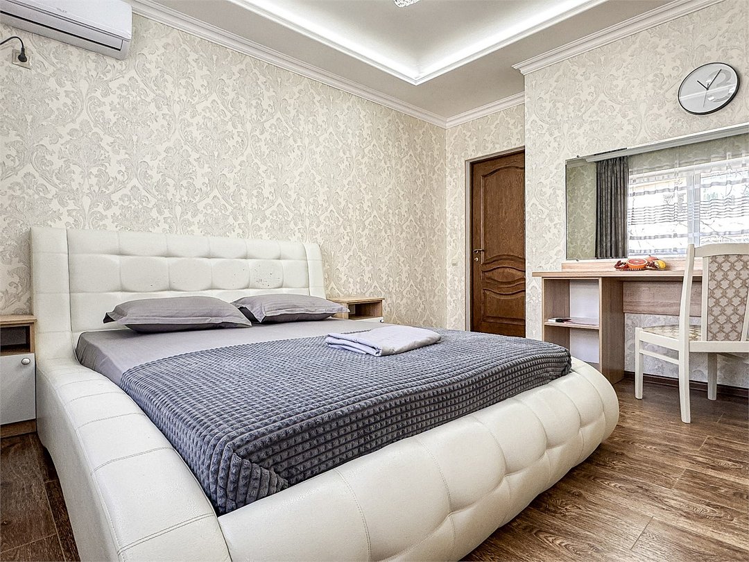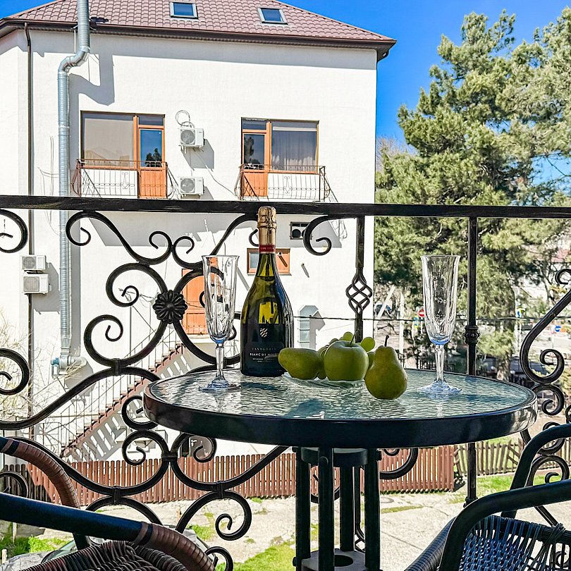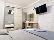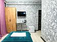 Таких номеров у нас - 2. На 1 этаже и на 2. Однокомнатные апартаменты со своей кухней. Разместить можно семью 2 взрослых и ребенка, учитывая 1 дополнительное место в номере, не считая очень широкой двуспальной кровати размером 180 на 200. Свой душ, туалет, фен, тапочки, шкаф, телевизор, кондиционер - обязательные удобства всех наших номеров. Кухня - полностью оборудована с необходимым набором посуды для семьи из 3 человек или 4, если кто то из детей будет спать вместе с родителями На кухне: холодильник с небольшой морозильной камерой, электроплита, чайник, кофеварка, бокалы, чашки, стаканы, ложки, вилки, штопор, кастрюля, сковорода.Услуги и удобства