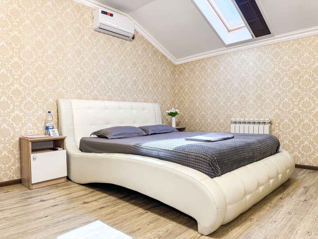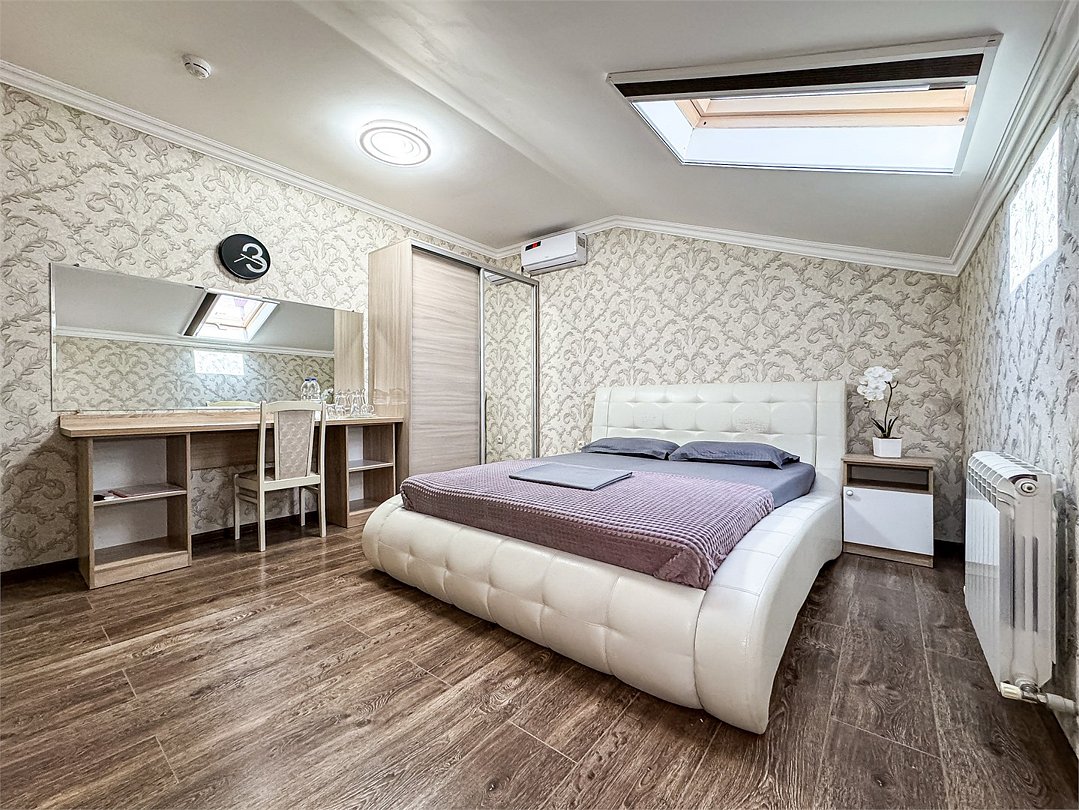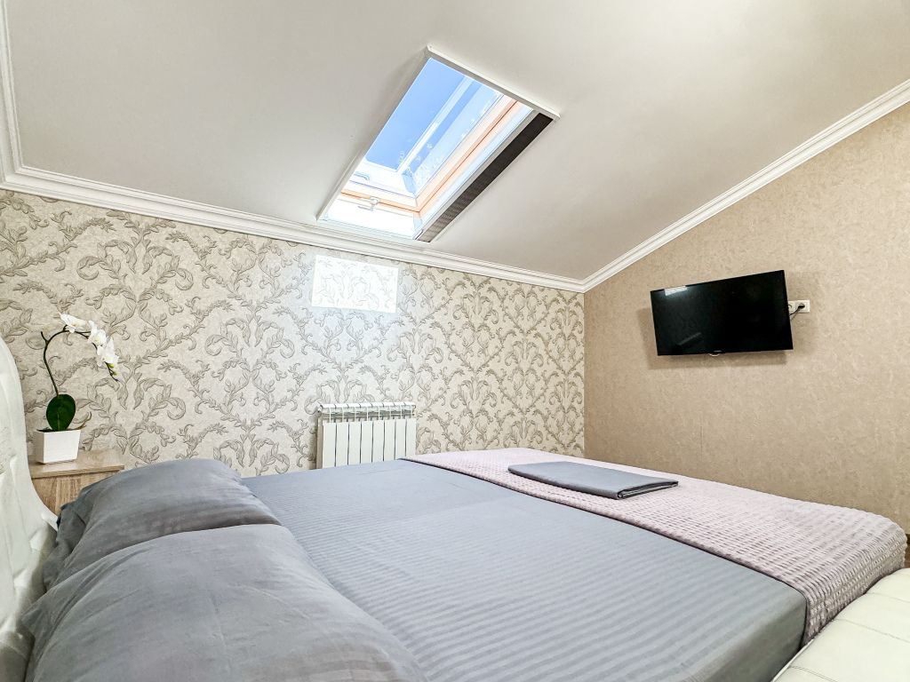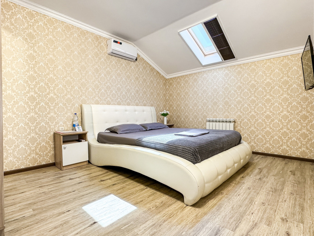 Двухкомнатный мансардный номер 35-45 кв м - идеальный выбор для размещения семьи 4 чел Две полноценно отдельные спальни, свой душ и туалет, кондиционер в каждой спальне, так же как и телевизор. Холодильник, чайник, небольшой набор посуды, стол, стулья, шкаф, фен, сейф. На окнах шторы плиссе, чтобы закрыть окно от солнечного света, так же каждое мансардное окно затонировано, так что комната от солнца не нагревается. Таких номеров - 3 Из 3-х таких номеров в одном во второй спальне диван, вместо кровати Запросите видеообзор своего номера при бронировании +7-921-55-44-982Услуги и удобства
