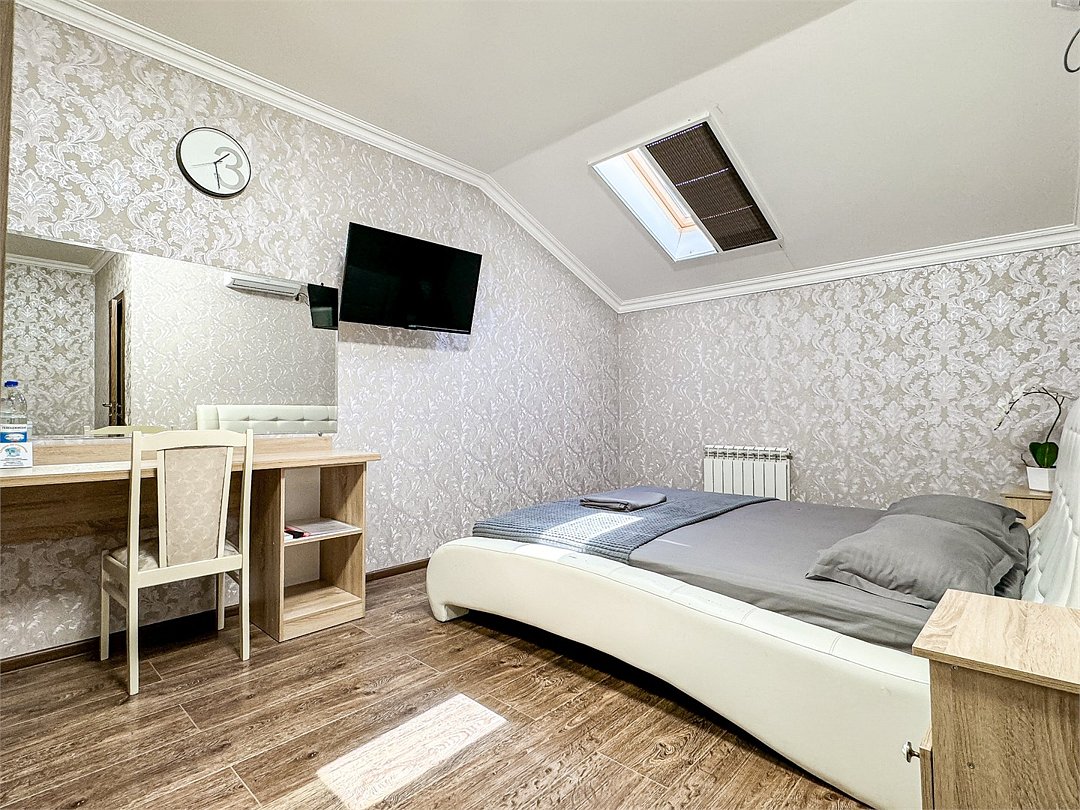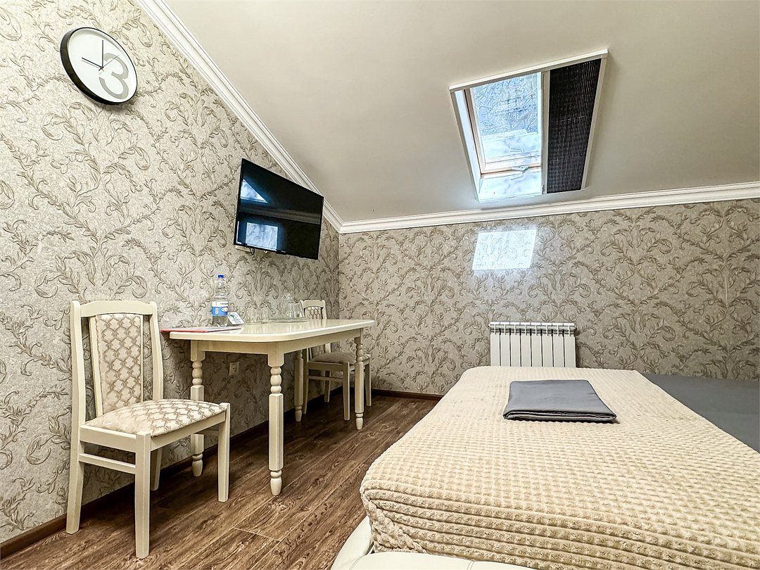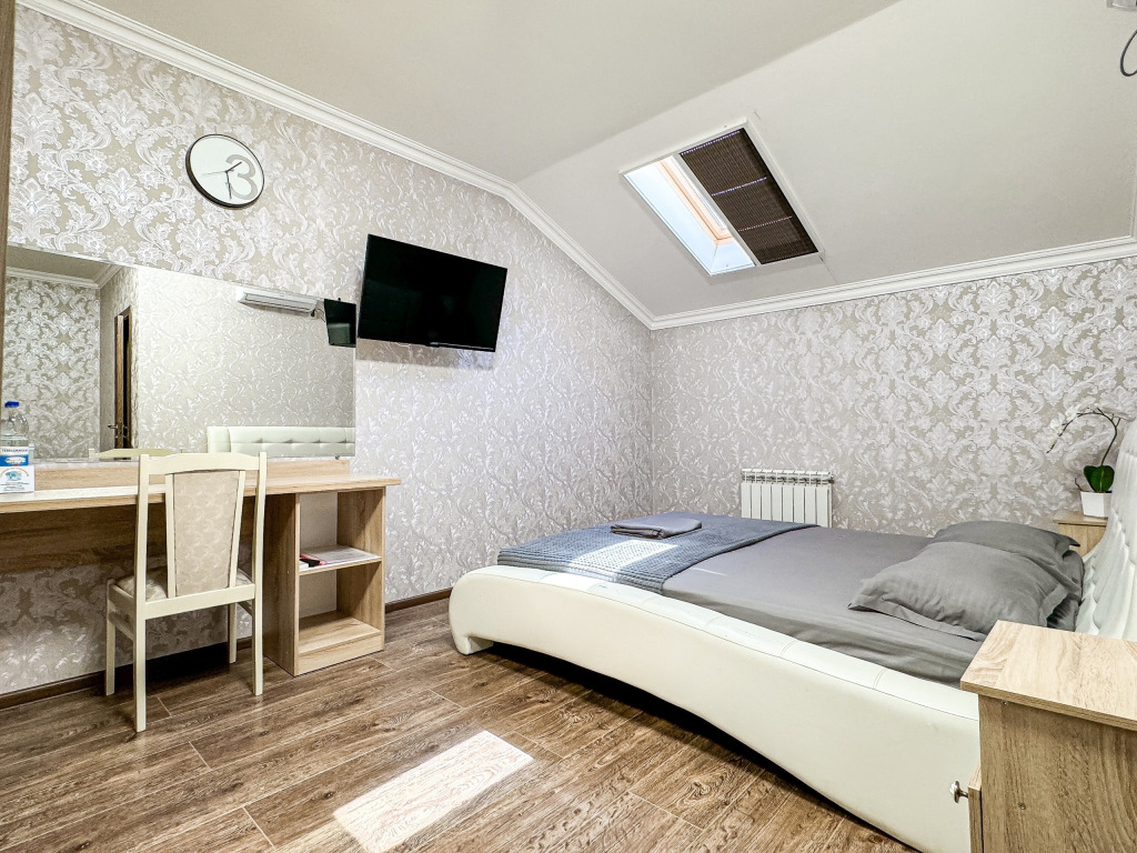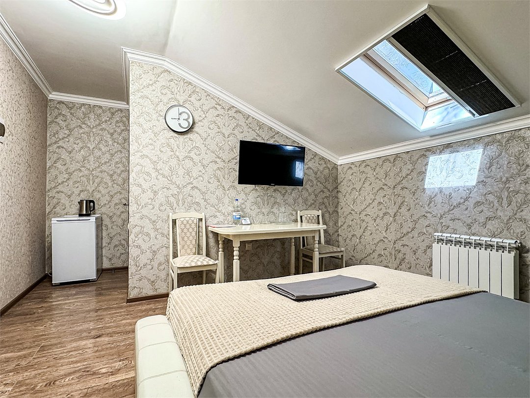 Однокомнатный номер для двоих 18- 20 кв м . Нет номера романтичнее - чем уютная мансарда Мансардные окна затонированы от жары южного солнца, чтобы Ваш номер не нагревался и всегда был комфортным. На окнах так же удобные шторы плиссе, чтобы Вы могли закрыть окно от солнечного света для комфортного сна. Номер со всеми необходимыми удобствами. Широкая двуспальная кровать, шкаф с зеркалом в полный рост, кондиционер, плазменный большой телевизор, туалетная комната со своим душем и туалетом. В номере так же есть чайник, холодильник, небольшой набор посуды, фен, сейф. Банные полотенца и косметические средства, ложка для обуви. При желании можно добавить доп место (или детскую кроватку) для одного ребёнка, это будет самый бюджетный вариант, чтобы разместиться небольшой семьей 2+1 Таких номеров - 3. только один из них не имеет стола в номере - это №16. Дополнительное место можно добавить только в 2 номера из 3х (в №14 и №16), запрашивайте данную услугу при бронировании Запросите видеообзор своего номера при бронировании +7-921-55-44-982Услуги и удобства