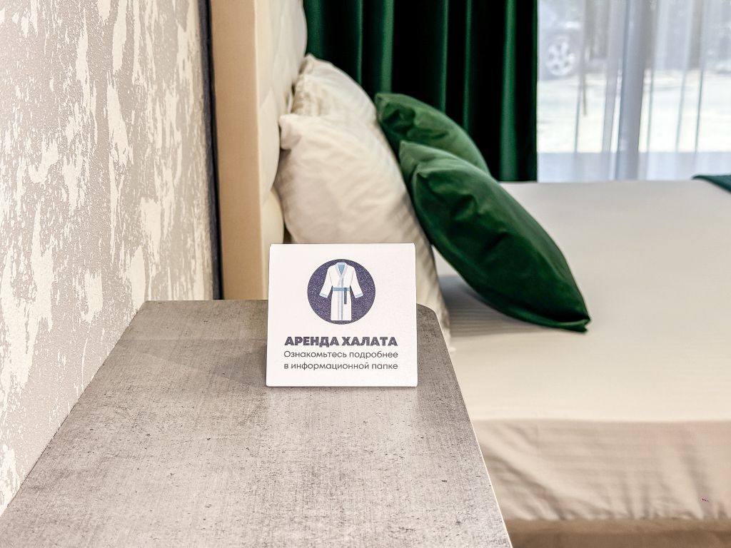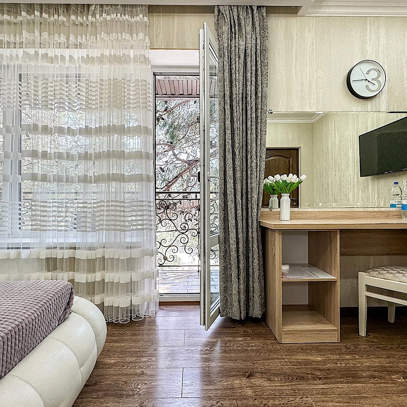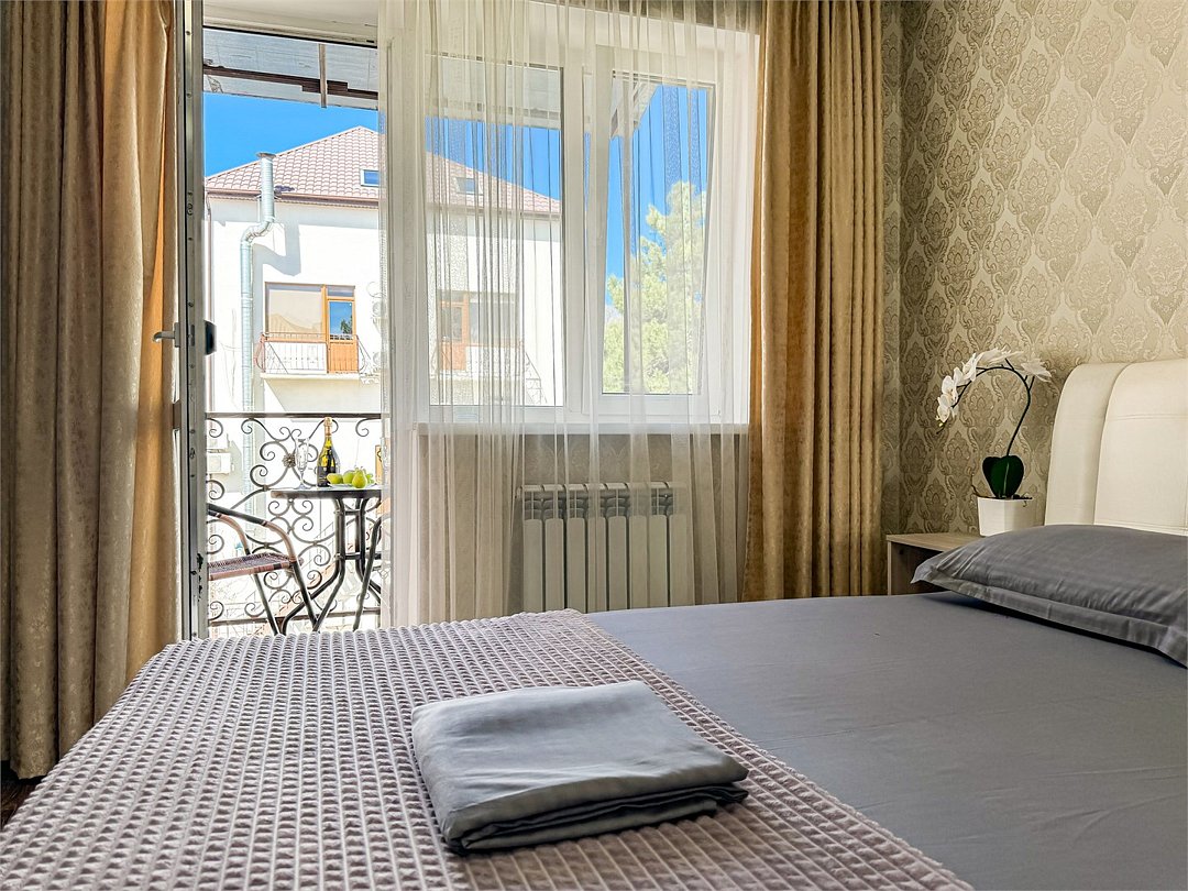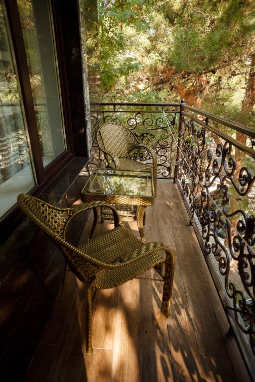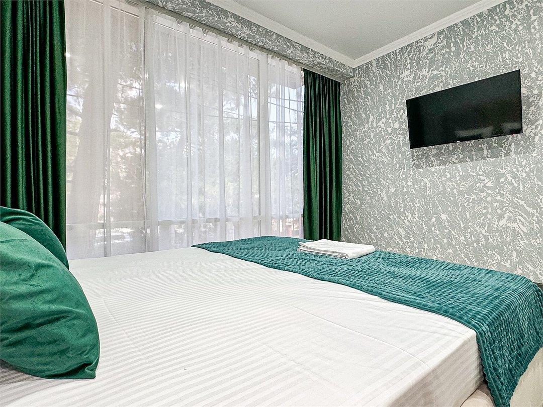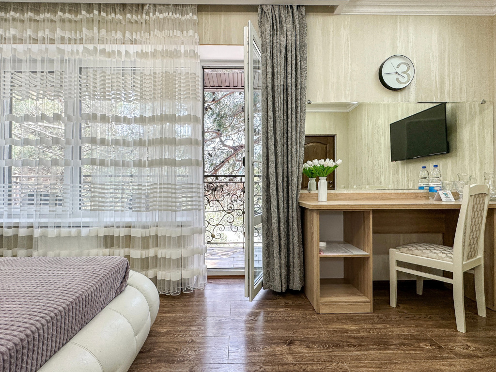 Балкон с видом на сосны - исключительная изюминка этого номера. Удобнейшая широкая двуспальная кровать с высоким топпером, мини прихожая, большой плазменный телевизор, кондиционер, холодильник, шкаф-купе с зеркалом в полным рост, стол, стулья, сейф, настольный торшер, небольшой набор посуды, два бокала. Душ, туалет в номере. С июня по конец сентября при бронировании от 3 суток в стоимость номера предоставляются халаты и тапочки Можно поставить доп. место для одного ребенка или детскую кроватку.