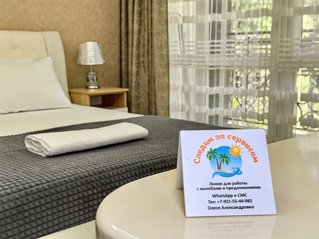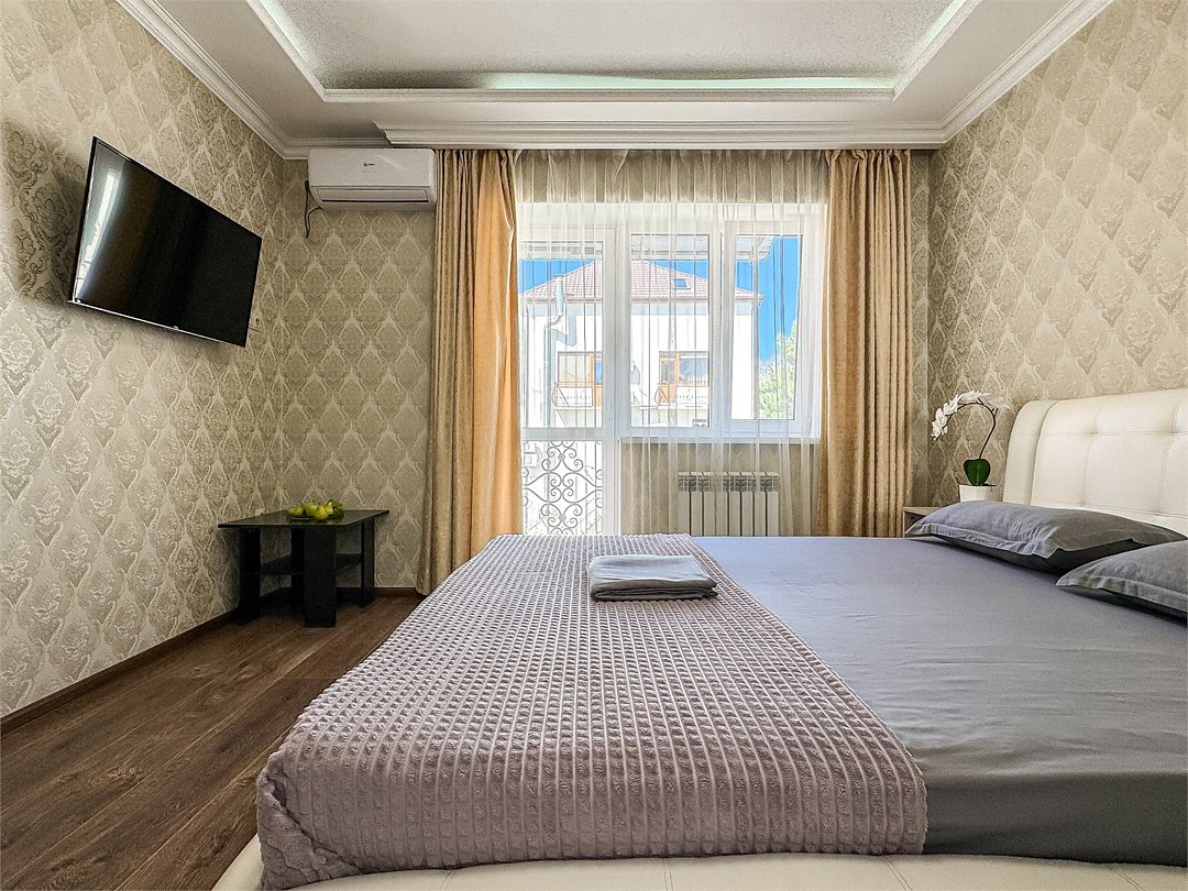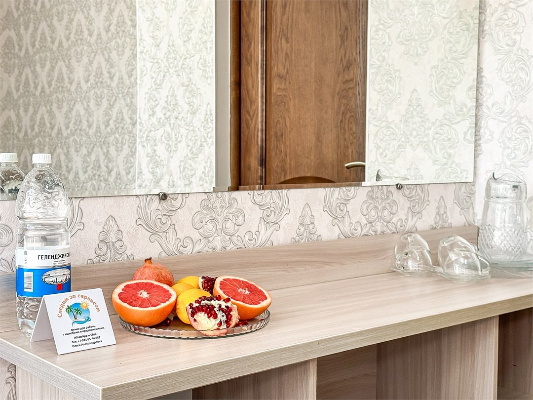 НАШ ЛИДЕР ПРОДАЖ Роскошный двухкомнатный номер 50 кВ м - с красивым балконом на геленджикские сосны. Не удивляйтесь если с веток деревьев спустится к Вам нежданная гостья Две спальни, в каждой свой кондиционер и большой плазменный телевизор. Холодильник, чайник, шкаф, фен, сейф, стол, стулья. Душ и туалет в номере, как и в любом из наших номеров. При желании можно добавить доп место, итого вместимость 2+2+1 Запросите видеообзор своего номера при бронировании +7-921-55-44-982Услуги и удобства