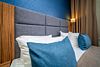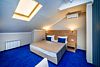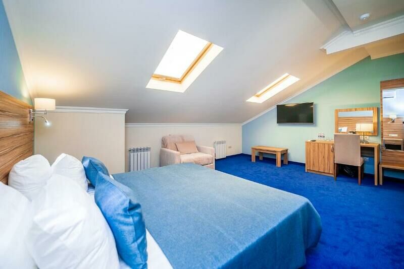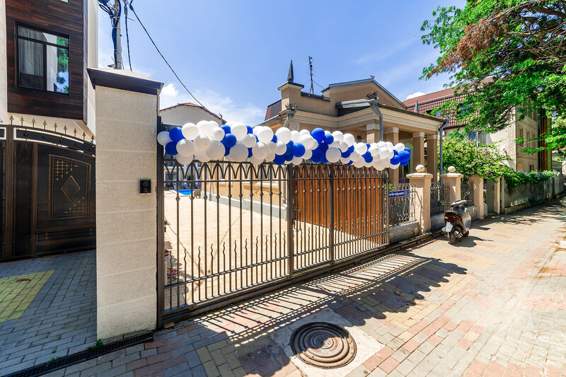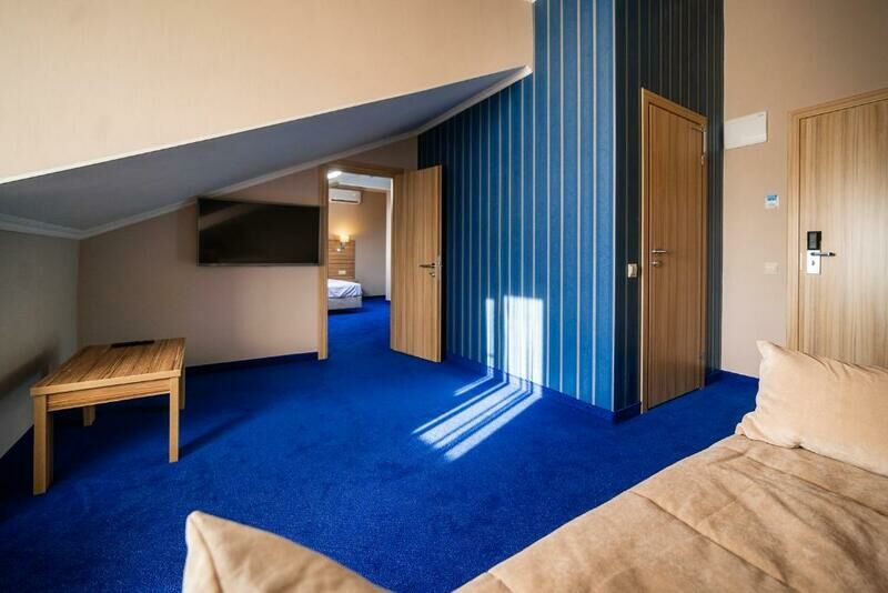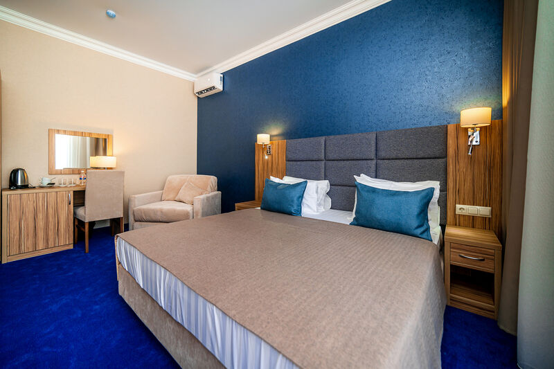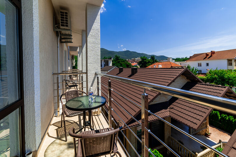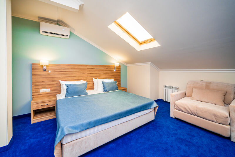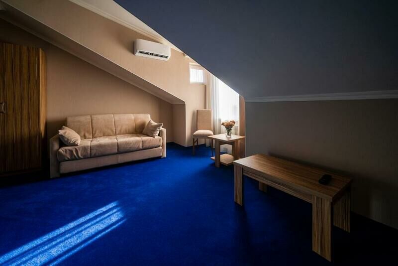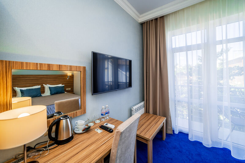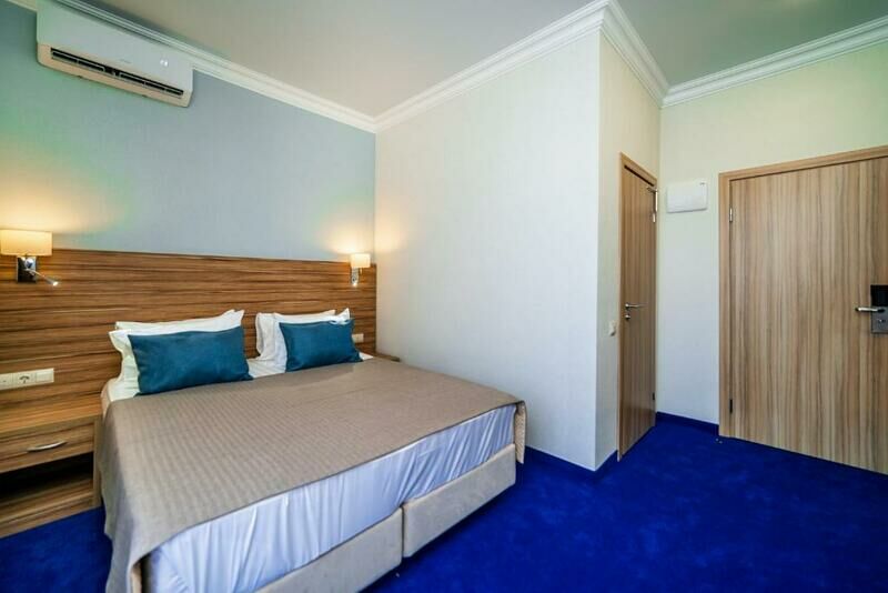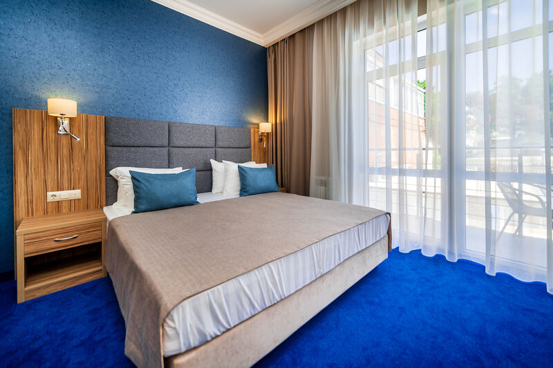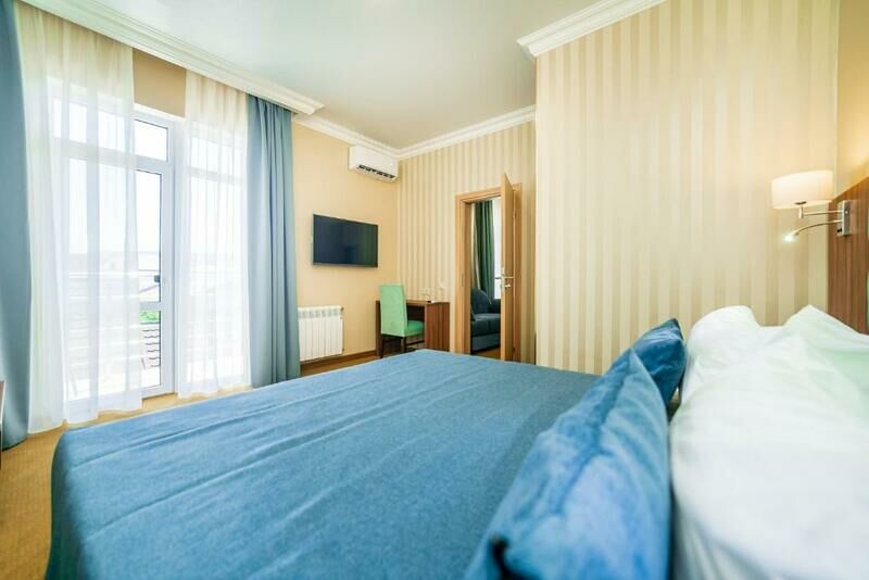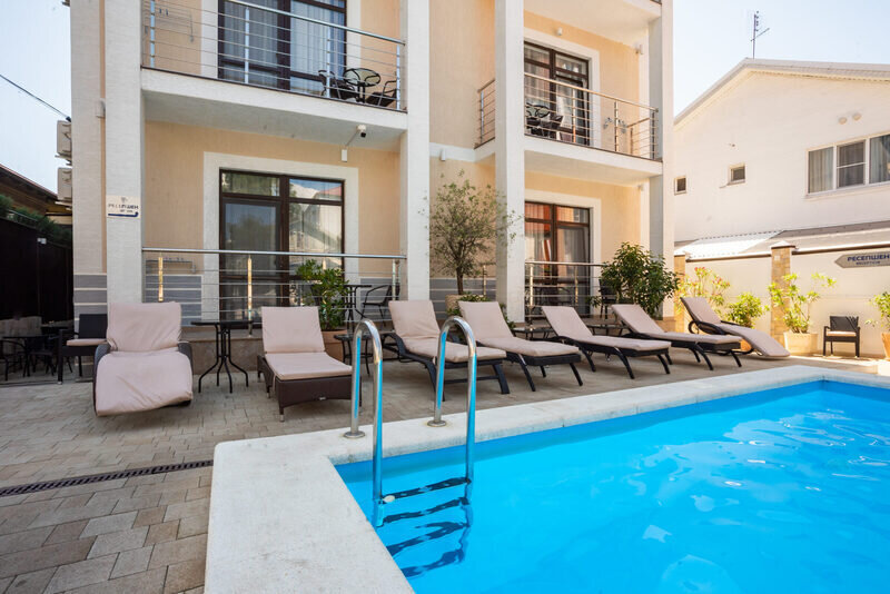 Трехэтажный корпус с мансардой расположен среди малоэтажной застройки в глубине тенистой улицы. Гостей ожидают комфортабельные номера с современном ремонтом, вмещающие в общей сложности более 70 человек. В комнатах стильный интерьер, насыщенная ультрамариновая цветовая гамма сочетается в нем с приятными пастельными оттенками. Все номера оснащены кондиционером, собственным санузлом с душем, везде есть плазменный телевизор, фен, электрочайник. В ряде номеров предусмотрены балконы.
