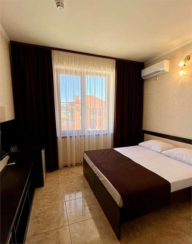1 комнатный номер с большой кроватью, или с двумя отдельными кроватями ,прикроватные тумбочки, шкаф купе, сан узел и душ совмещен( фен, банные и гигиенические принадлежности.) Номер оборудован: индивидуальной системой кондиционирования, TV, мини-бар.Услуги и удобства