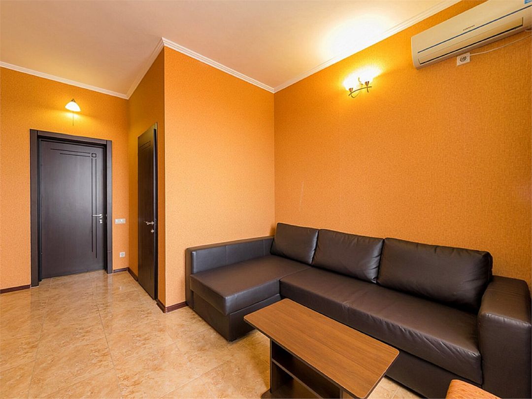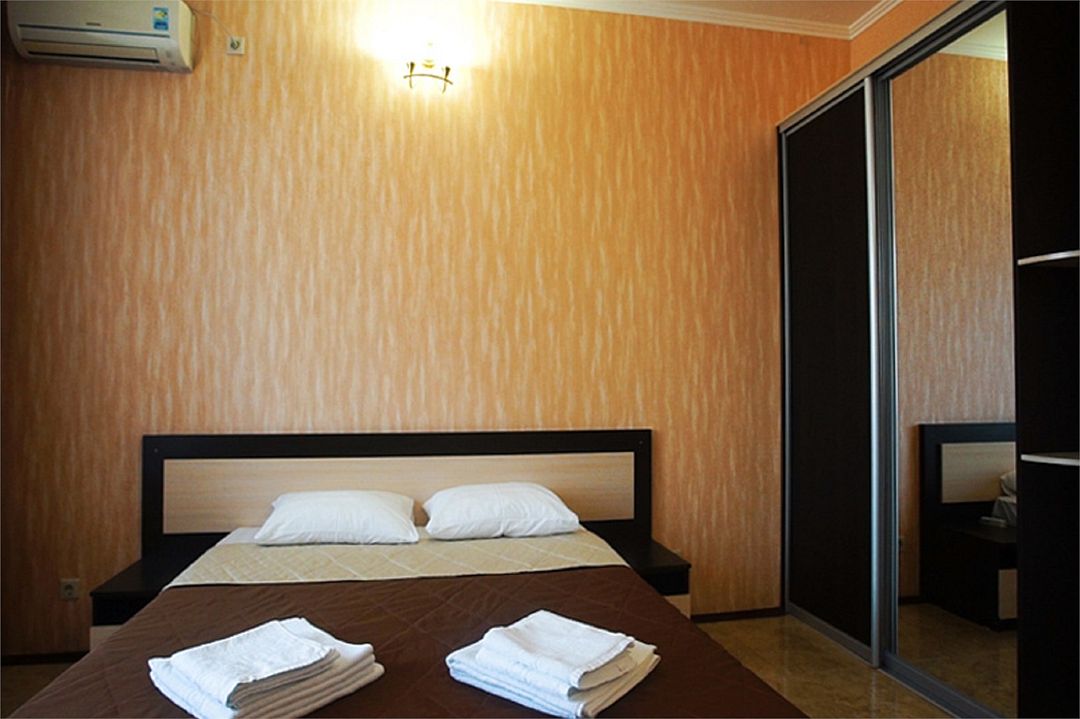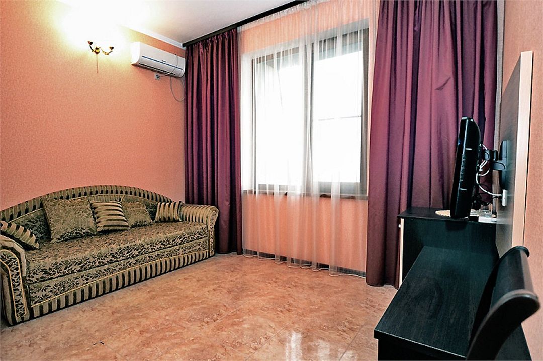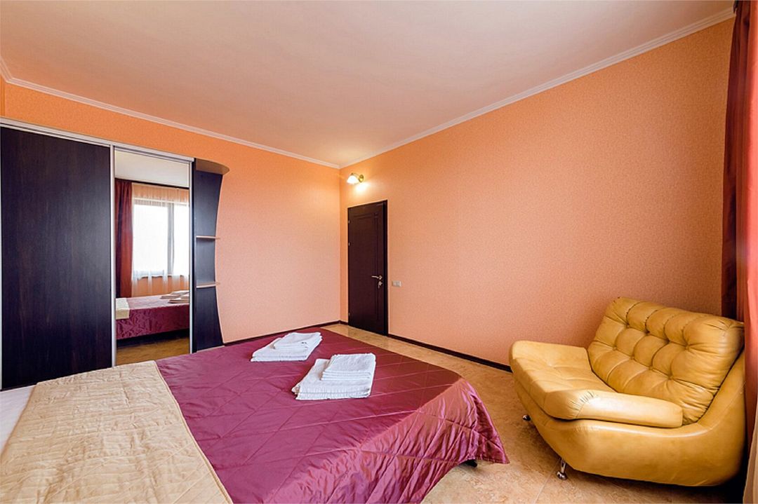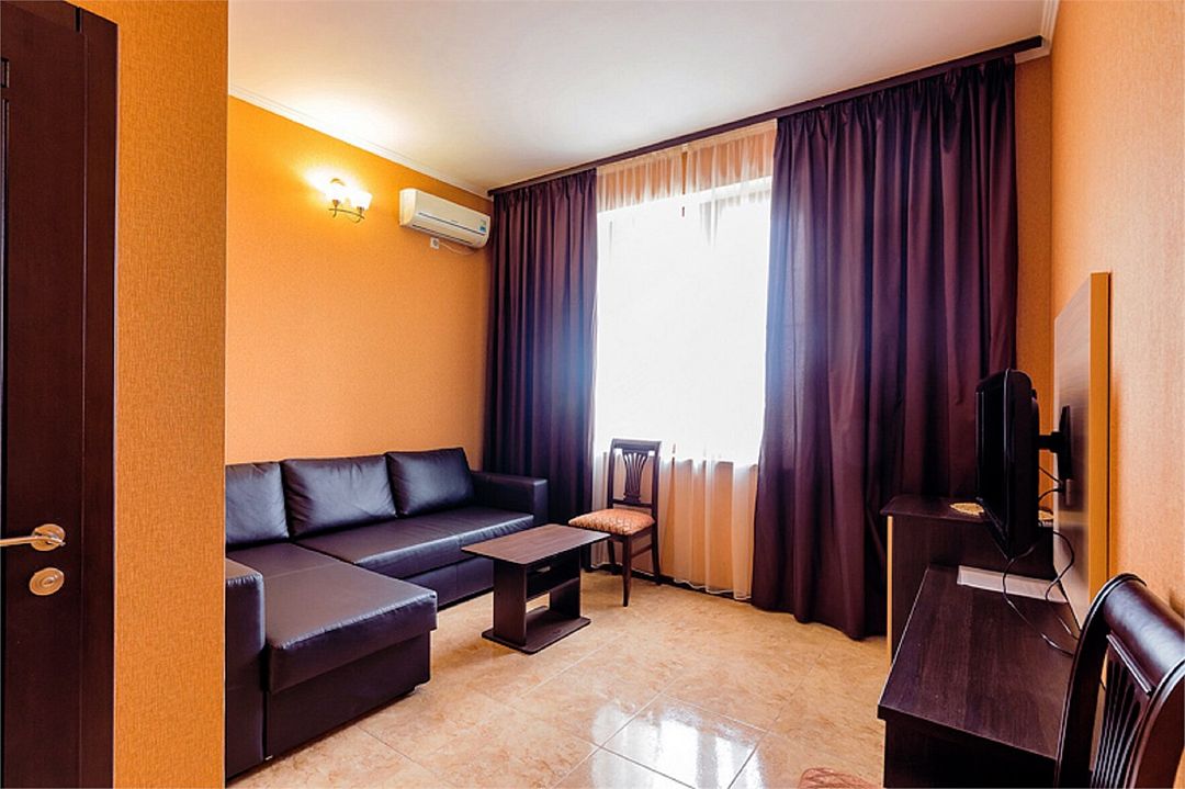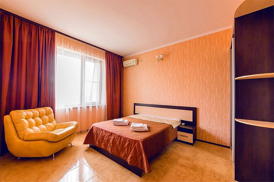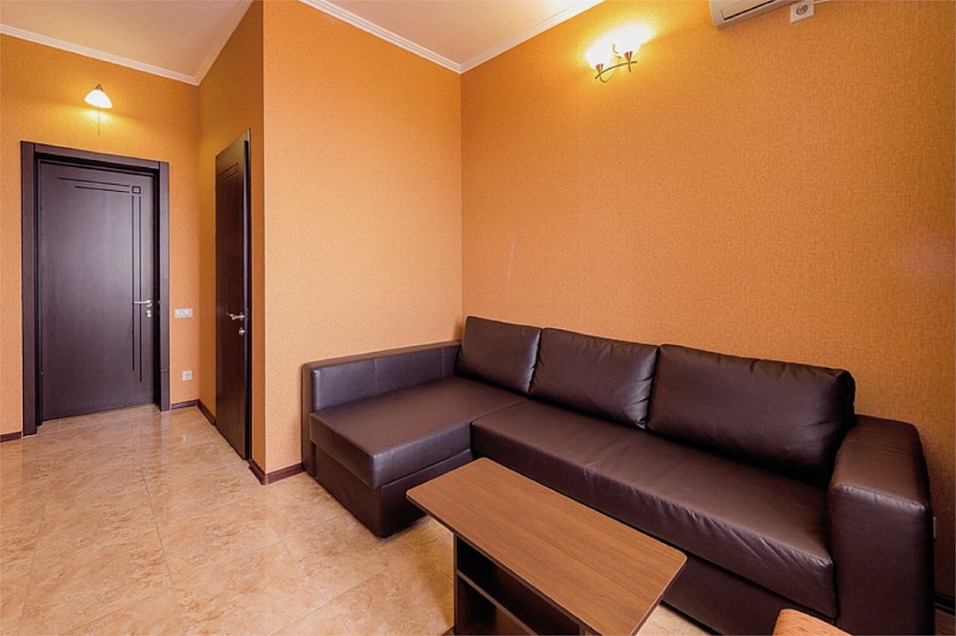 2-х комнатные наиболее просторные и комфортабельные номера с широкими двуспальной кроватью, прикроватными тумбочками, шкаф купе, диваном трансформер , кресло, телевизор, мини бар , кондиционером. Совмещенный сан узел и душевая,( фен, банные и гигиенические принадлежности.)Услуги и удобства