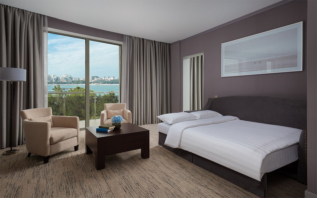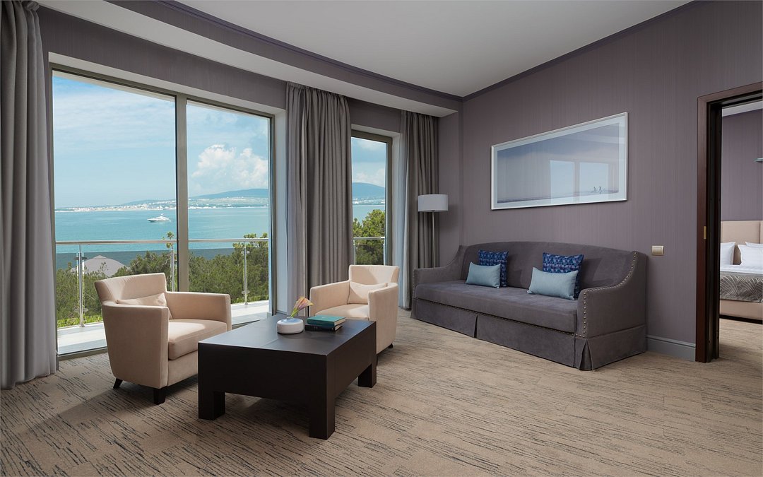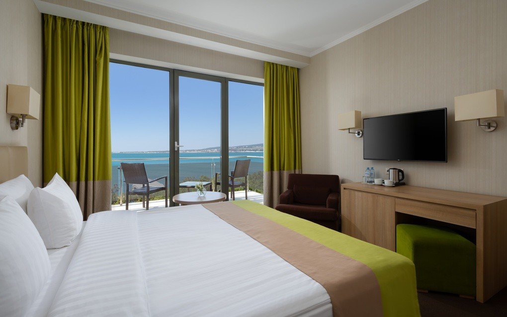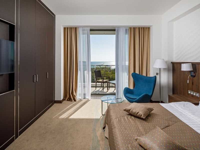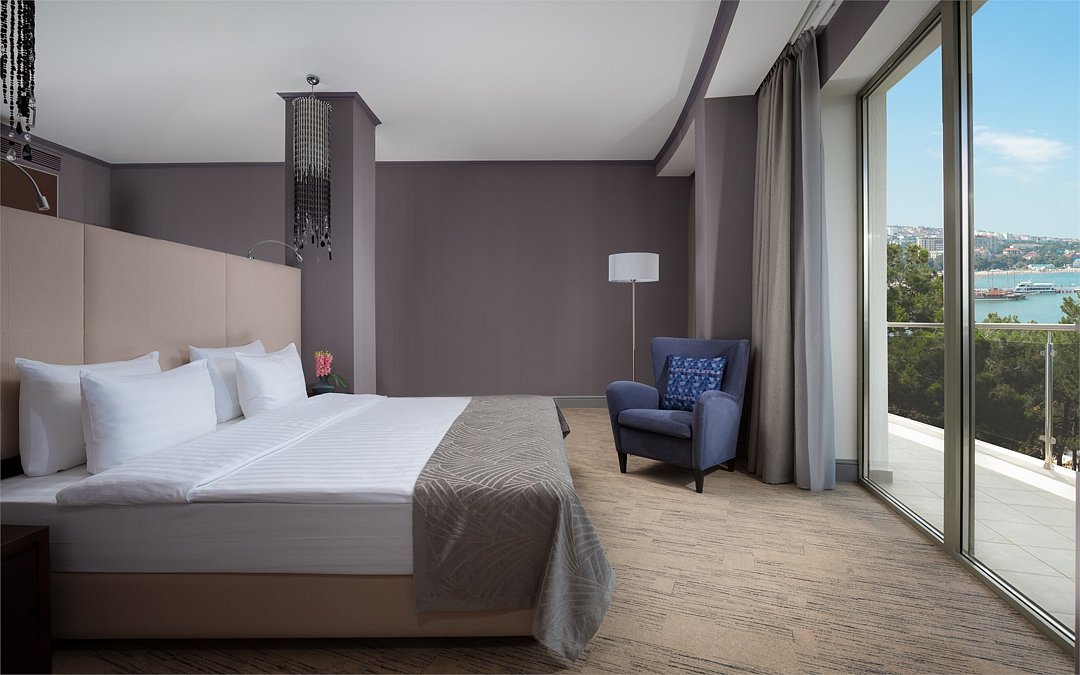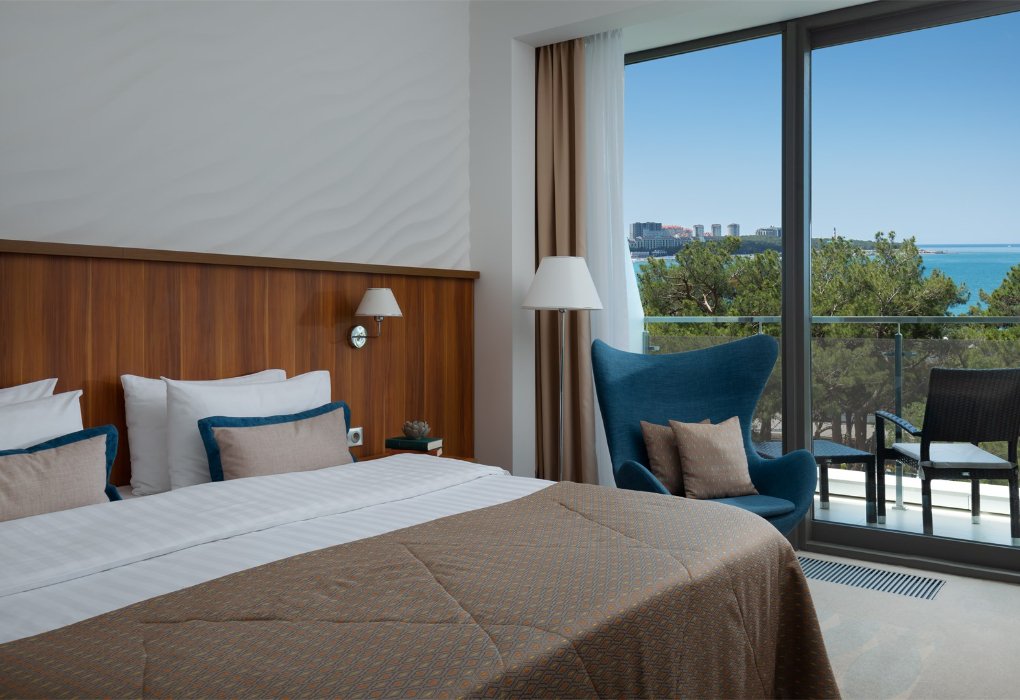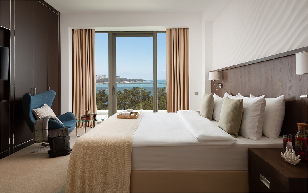 спутниковое телевидение, Wi-Fi, телефон, кондиционер, фен, ванна, санузел, халаты, банные полотенца, тапочки, гигиенические средства, косметические средства, балкон, две односпальные или большая двуспальная кровать, кресла, тумбы, вешалки, письменный стол, пуфики, мини-бар, чайный набор, сейф, косметическое зеркало, питьевая вода, ковровое покрытие, отопление, вид на море, кресло, стаканы, столовые приборы, стол, туалетные средства, телевизор с плоским экраном, шкаф-купе, можно с питомцами, игрушки, миска, пакетик для выгулаВ номере