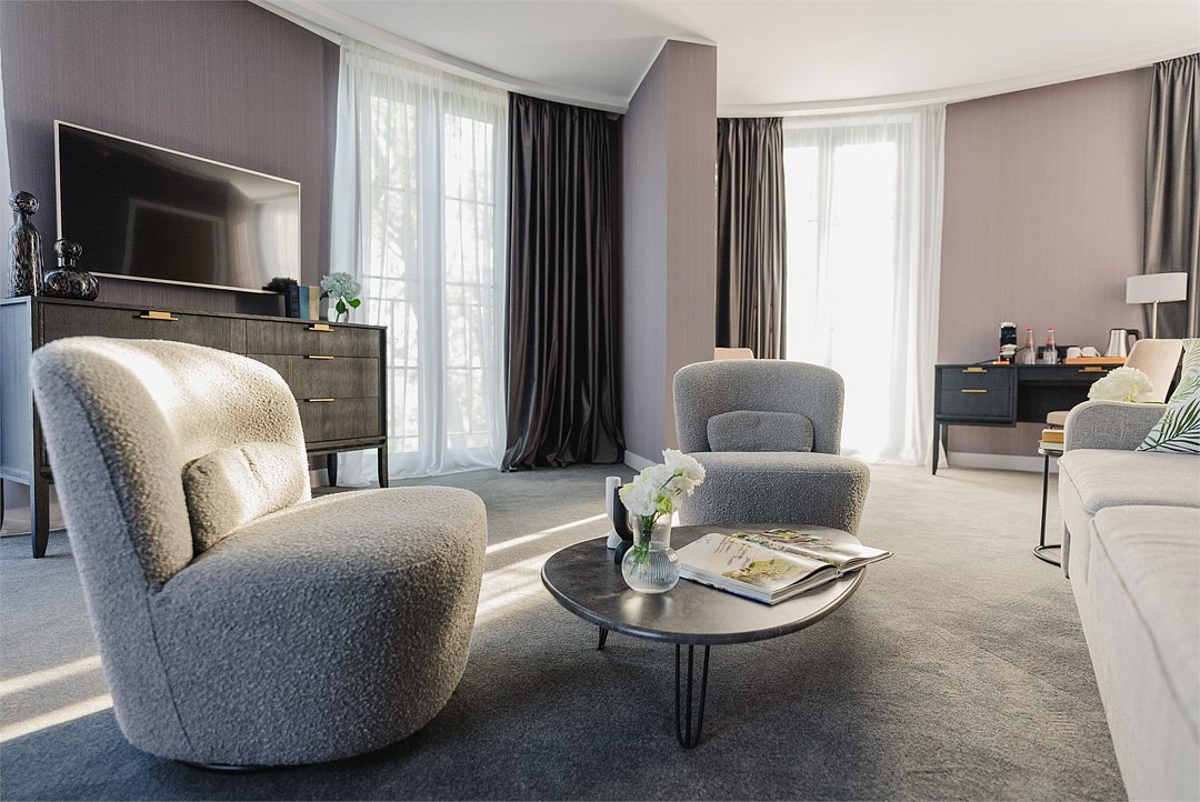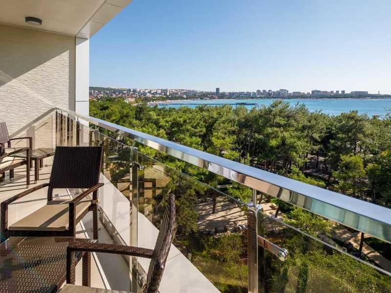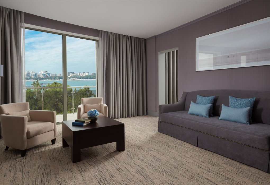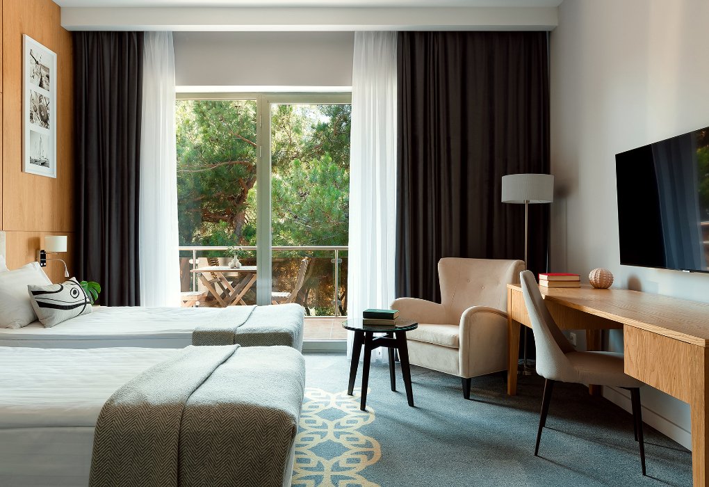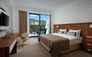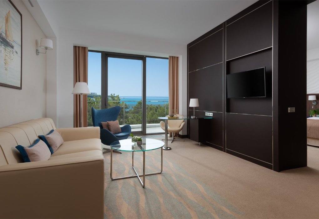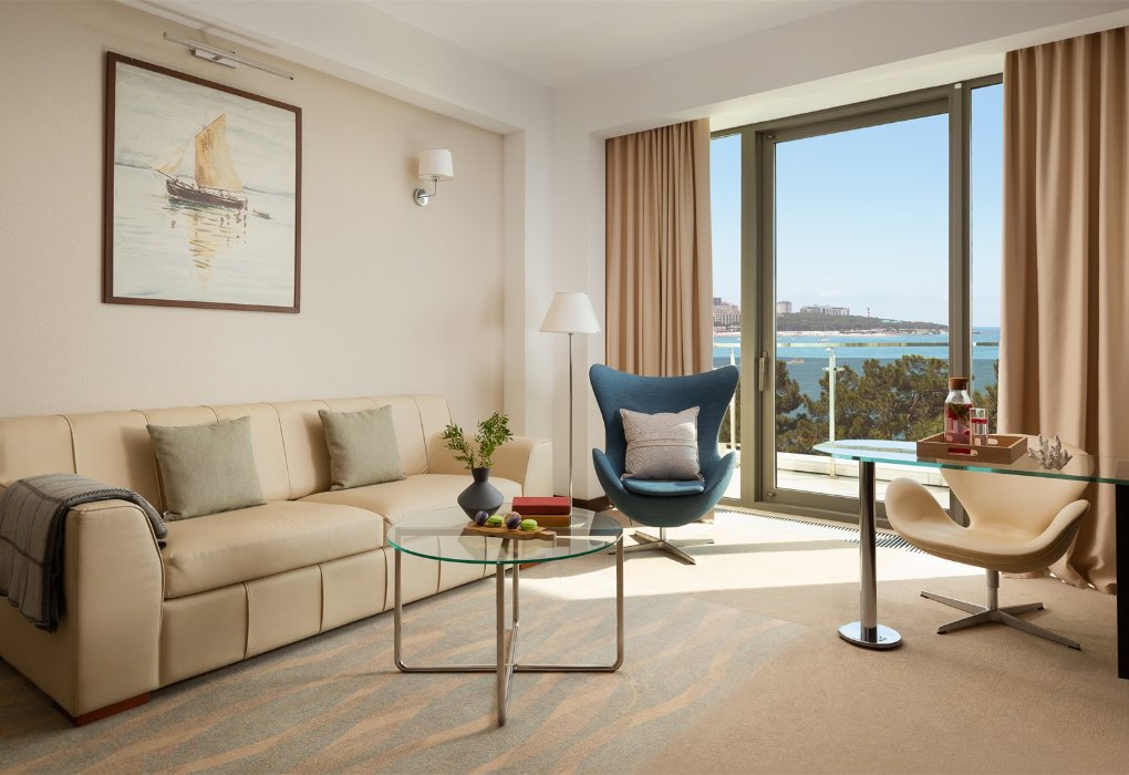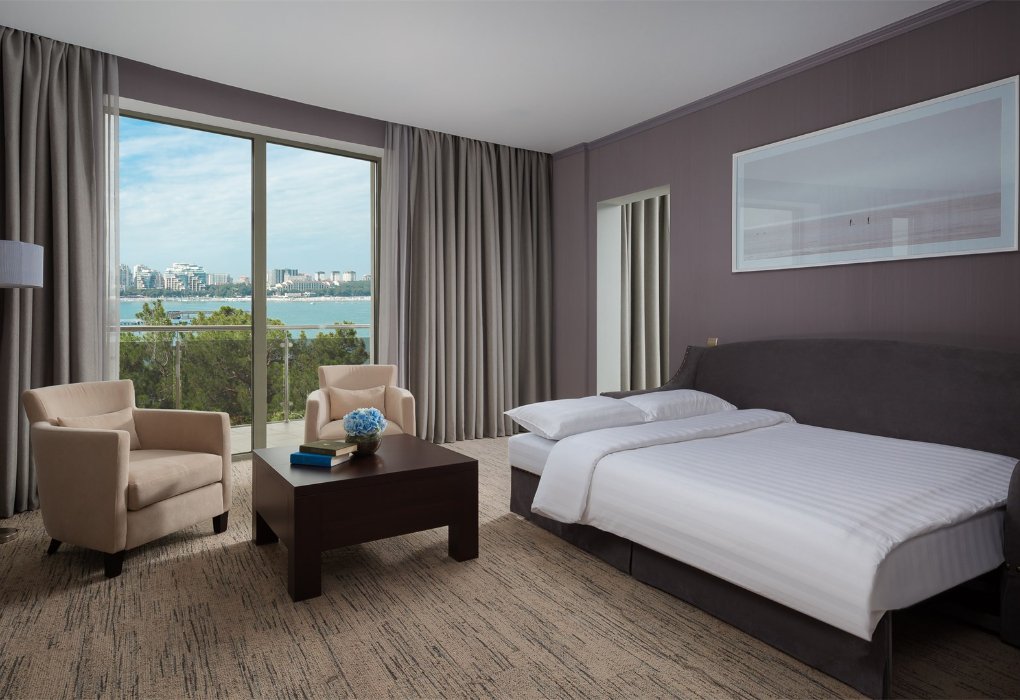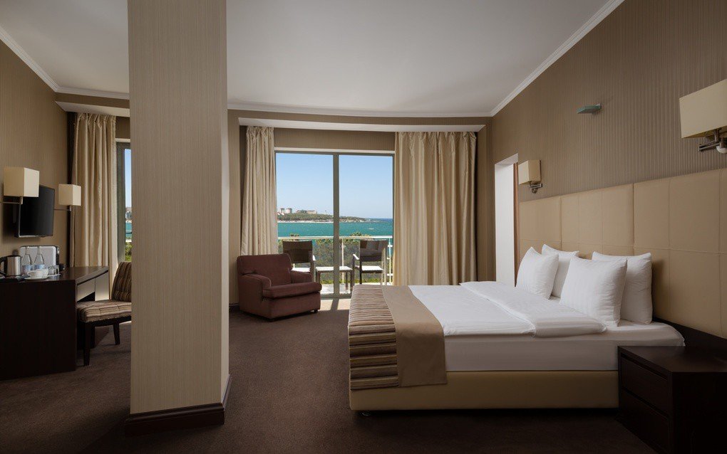 спутниковое телевидение, Wi-Fi, телефон, кондиционер, фен, ванна, санузел, халаты, банные полотенца, тапочки, гигиенические средства, косметические средства, балкон, две односпальные или большая двуспальная кровать, кресла, тумбы, вешалки, письменный стол, пуфики, мини-бар, чайный набор, сейф, косметическое зеркало, питьевая вода, ковровое покрытие, отопление, вид на море, кресло, стаканы, столовые приборы, стол, туалетные средства, телевизор с плоским экраном, шкаф-купе, можно с питомцами, игрушки, миска, пакетик для выгулаВ номере