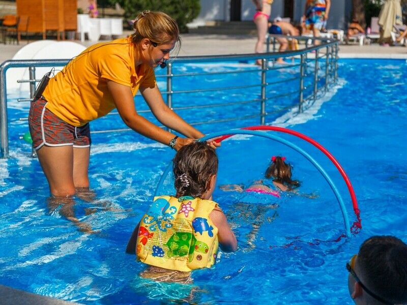 Тип бассейна: открытый бассейн, детский бассейнВода в бассейне: подогреваемый бассейнРядом с бассейном: шезлонги, зонтикиПлощадь: 43 м²Глубина: 40 смПансионат располагает специально оборудованной детской зоной в основном бассейне, предназначенной для самых маленьких гостей. Этот участок имеет безопасную неглубокую глубину и оснащен горкой, адаптированной под рост и потребности малышей. Кроме того, в чаше бассейна установлено подводное освещение, создающее приятную и безопасную атмосферу для купания.