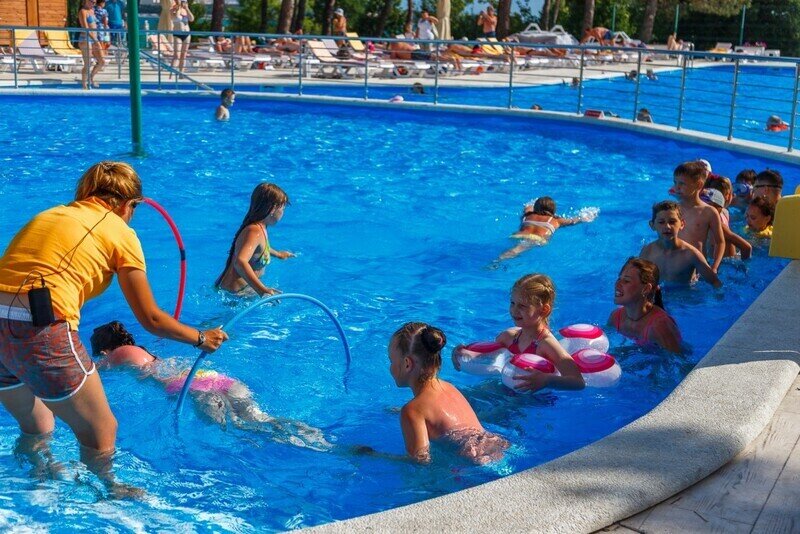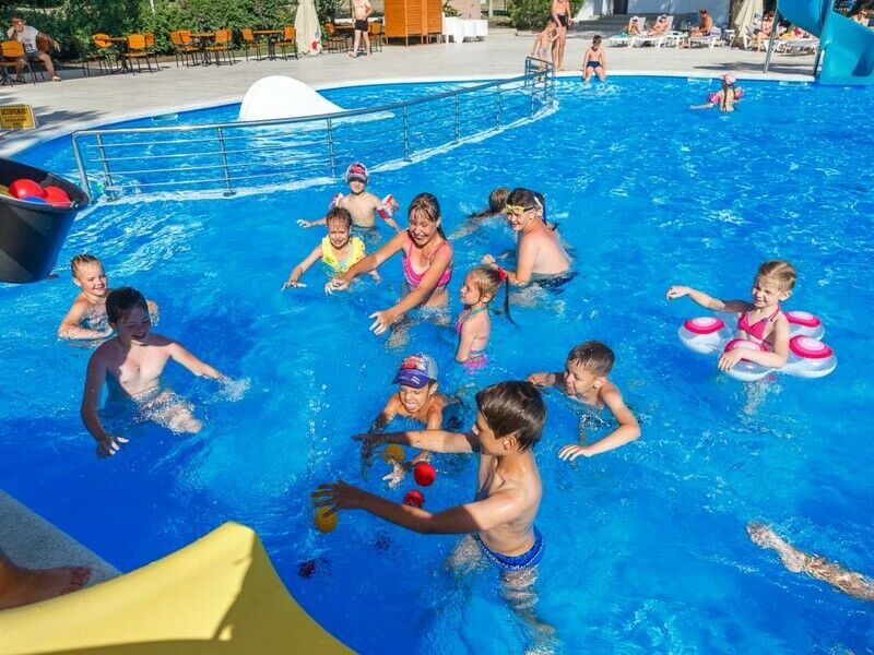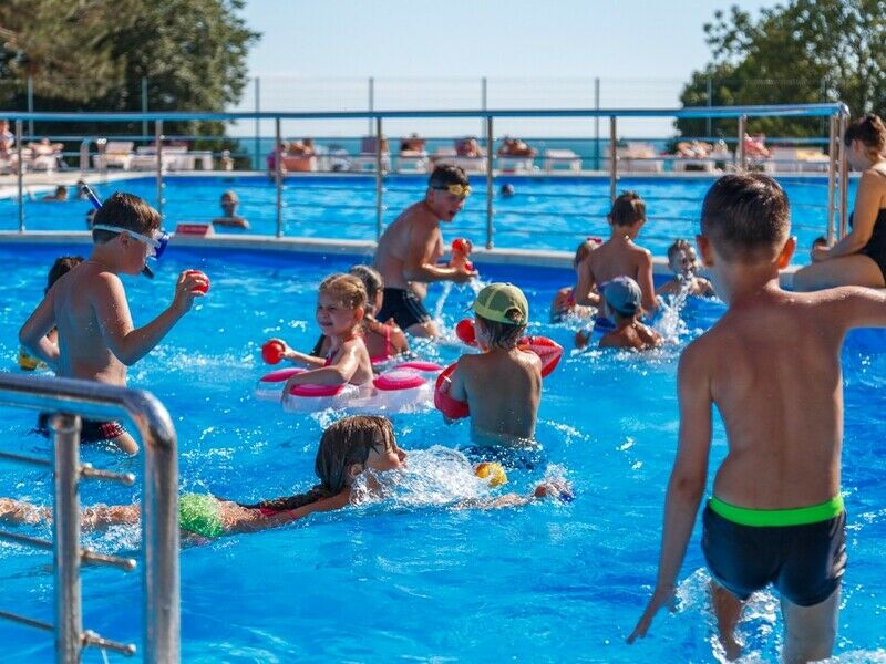 Тип бассейна: открытый бассейнВода в бассейне: подогреваемый бассейнРядом с бассейном: шезлонги, зонтикиПлощадь: 427 м²Глубина: 140 смВ пансионате функционирует подогреваемый бассейн с подводным освещением, разделенный на детскую и взрослую чашу, в период с 15 апреля по конец октября. Фактический срок работы может варьироваться в зависимости от погодных условий — при неблагоприятной погоде время работы бассейна может быть сокращено.