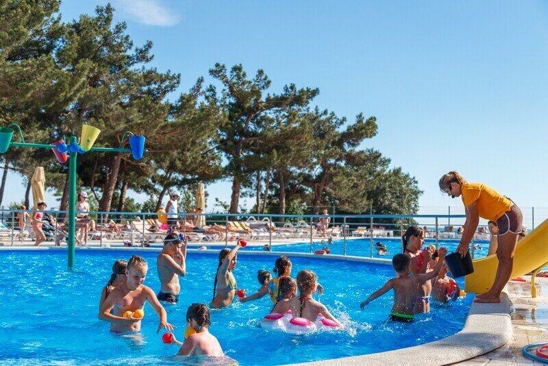 Тип бассейна: открытый бассейн, детский бассейнВода в бассейне: подогреваемый бассейнРядом с бассейном: шезлонги, зонтикиПлощадь: 148 м²Глубина: 70 смГлавный бассейн включает в себя также и специально выделенную зону для детей более старшего возраста. Эта зона оборудована увлекательными элементами, такими как переворачивающиеся ведра, 4 донных гейзера, а также 2 водных горки, предназначенных именно для развлечения и безопасного купания детей.
