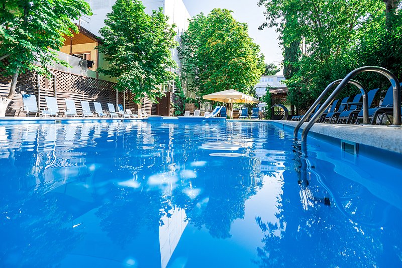 Во внутреннем дворе нашего пансионата вас ждет летний бассейн с пресной водой для взрослых и специальный детский бассейн для маленьких гостей. Для тех, кто любит загорать и греться на солнце, предусмотрены шезлонги. Рядом с бассейном есть летний бар, в котором можно перекусить и отдохнуть.