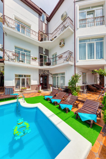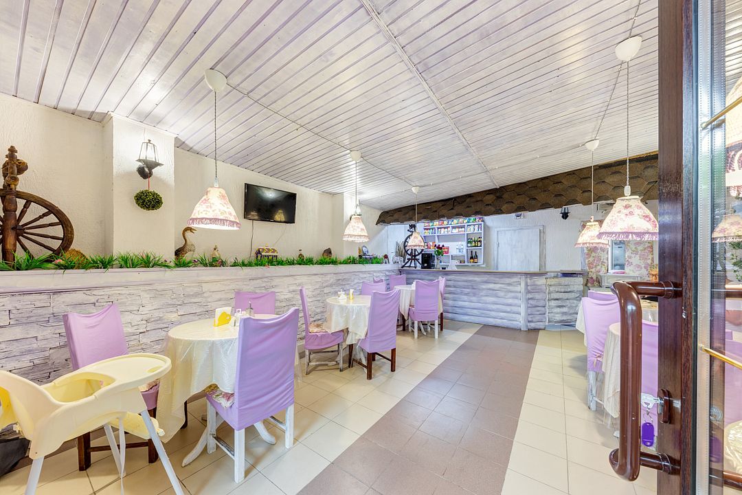 На территории оборудован открытый тёплый бассейн с шезлонгами, собственная столовая, зоны отдыха и мангальная зона.
