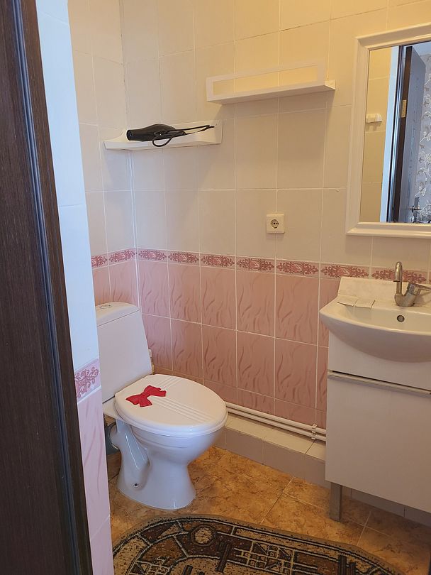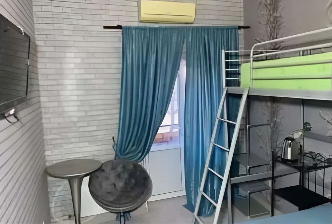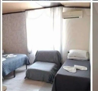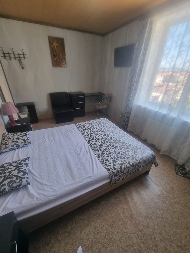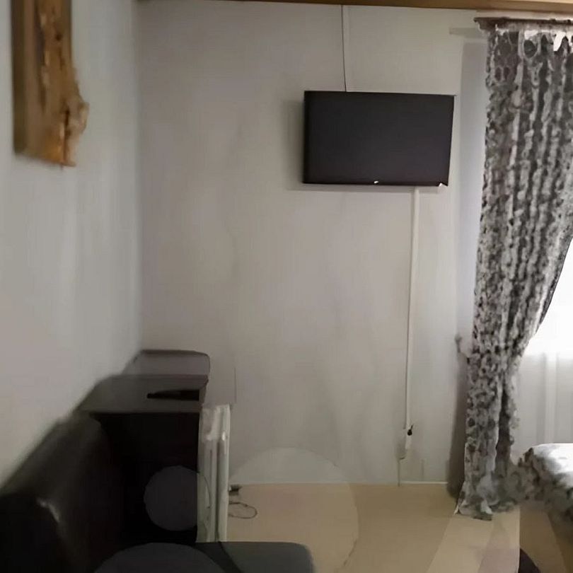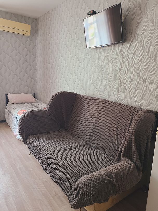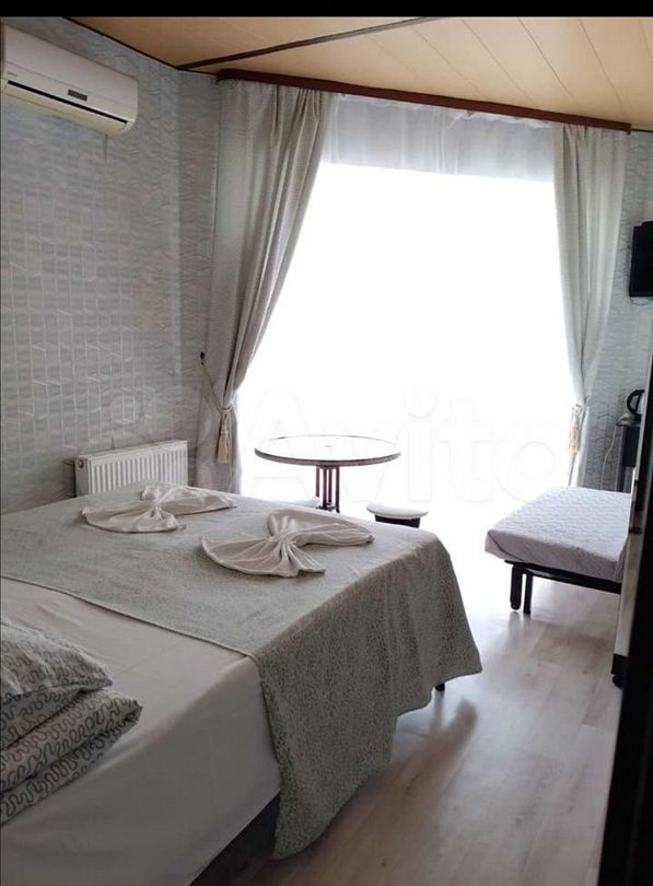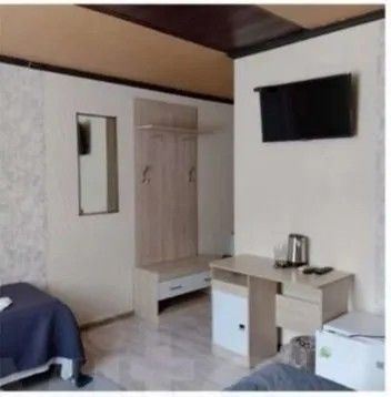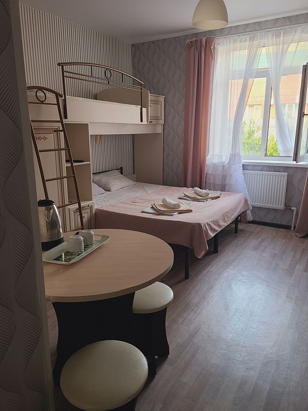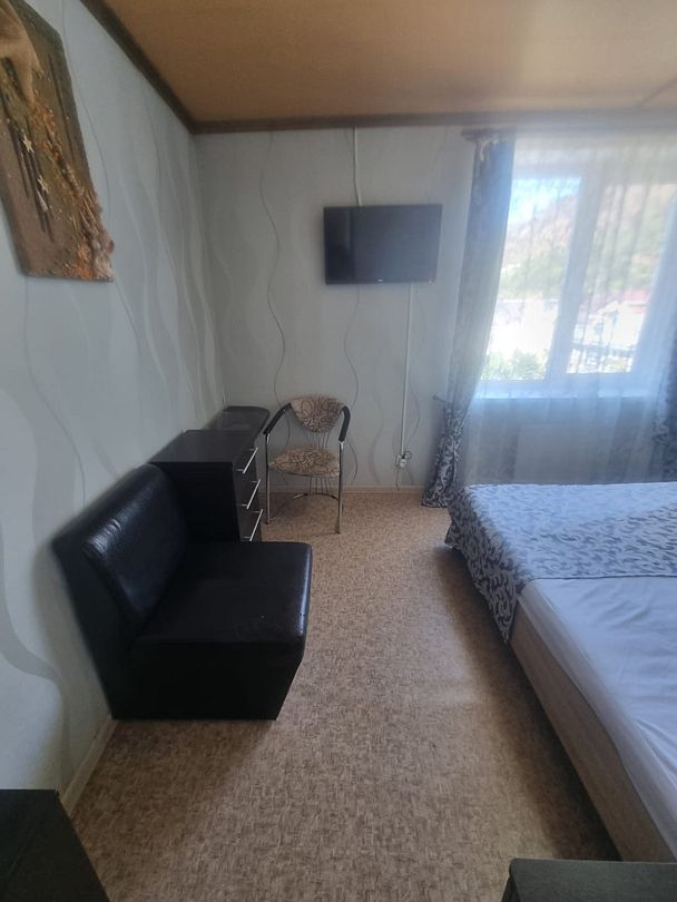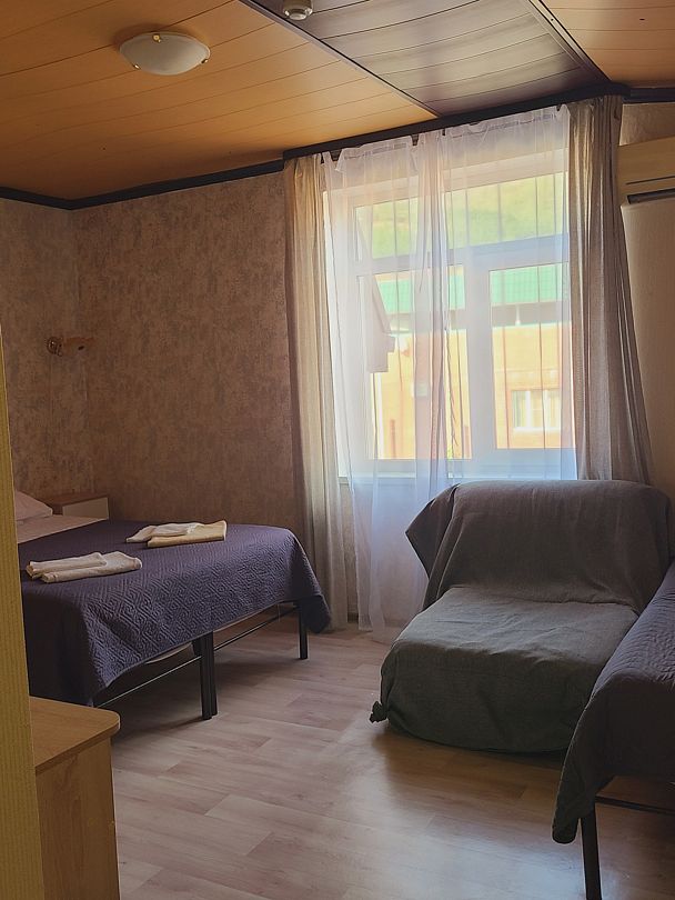 В номере кондиционер, холодильник, телевизор, чайник. Номер без балкона, окна выходят на город. смена белья через 5 суток, ежедневная смена полотенец, влажная уборка по запросу. Утюг и гладильная доска на этаже. В номере раздвижная двуспальная кровать и двухъярусная, если кому надо с 3-мя раздельными кроватями.