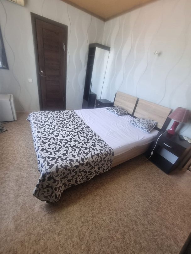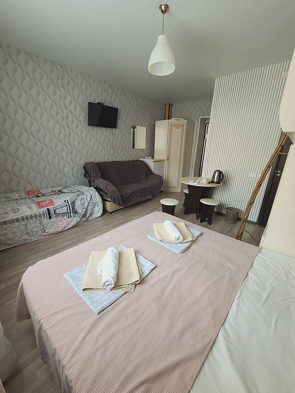 В номере двуспальная кровать, раскладной диван, раскладное кресло. санузел в номере. Холодильник, телевизор, кондиционер, чайник.
