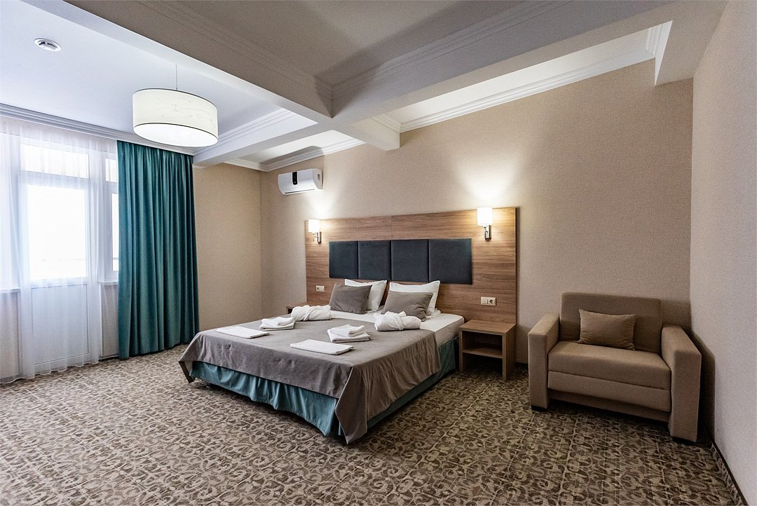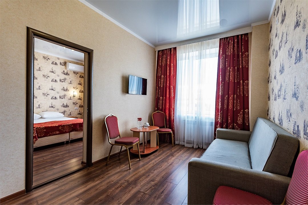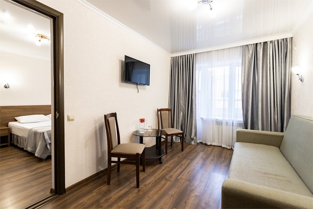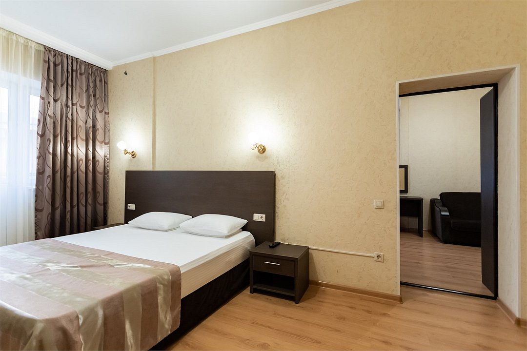 Двухкомнатный двухместный номер Комфорт площадью от 25 кв.м., с балконом. На два основных места предоставлена двуспальная/две односпальные кровати. Два дополнительных места на раскладном диване. В номере: зеркало, прикроватные тумбочки, стол, стулья, холодильник, телевизор, электрический чайник, система климат-контроль. Санузел с душевой кабиной, также имеются туалетные и банные принадлежности, тапочки, халат, фен.Услуги и удобства